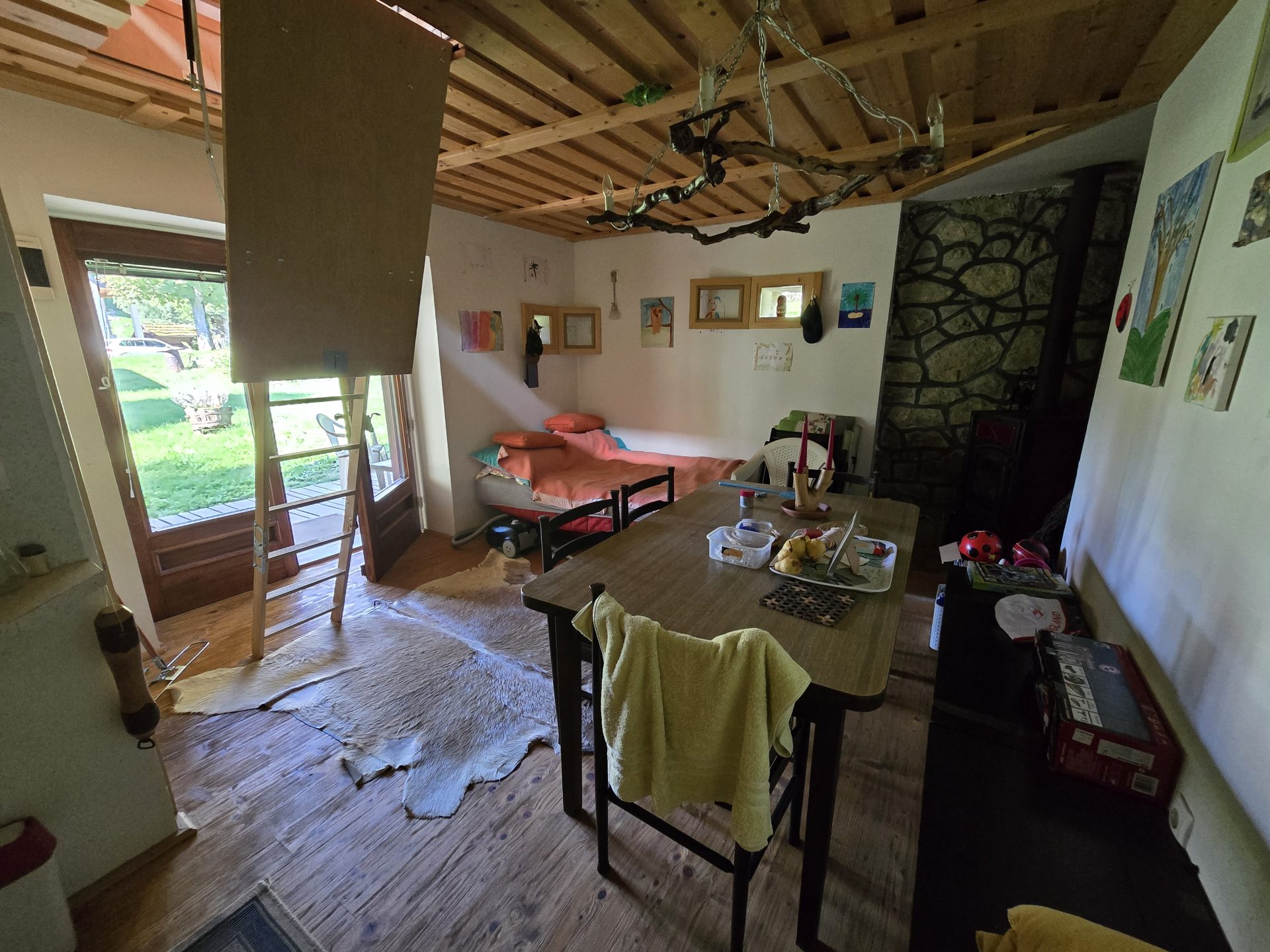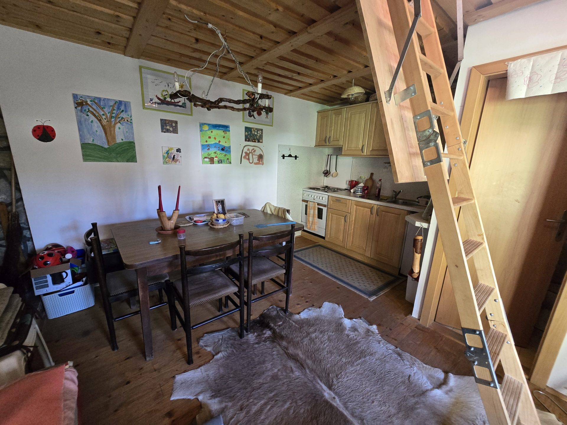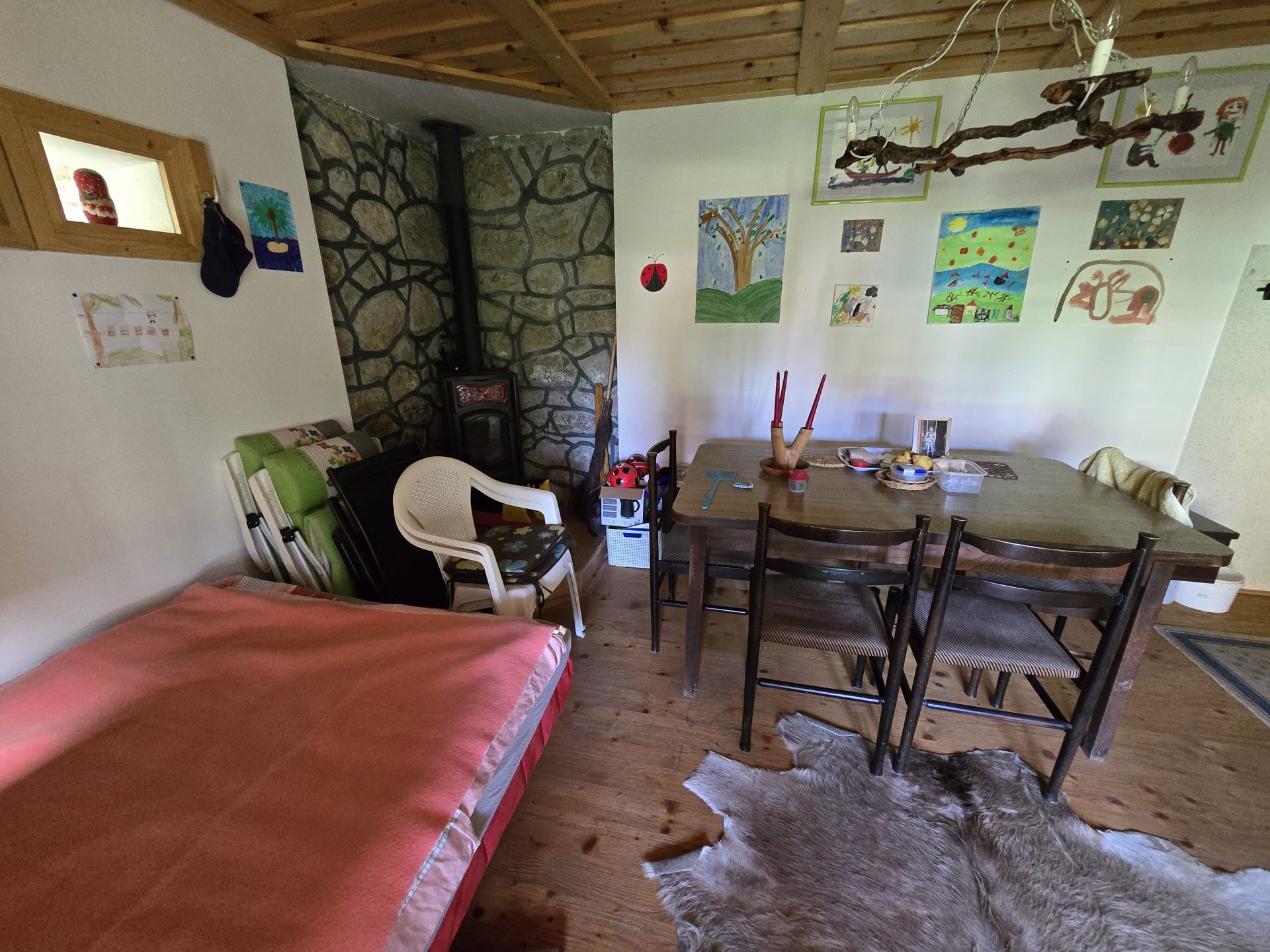 V pritličju se nahaja dnevni prostor s kuhinjo in WC. Ogrevanje je urejeno z “gašperčkom” na drva.