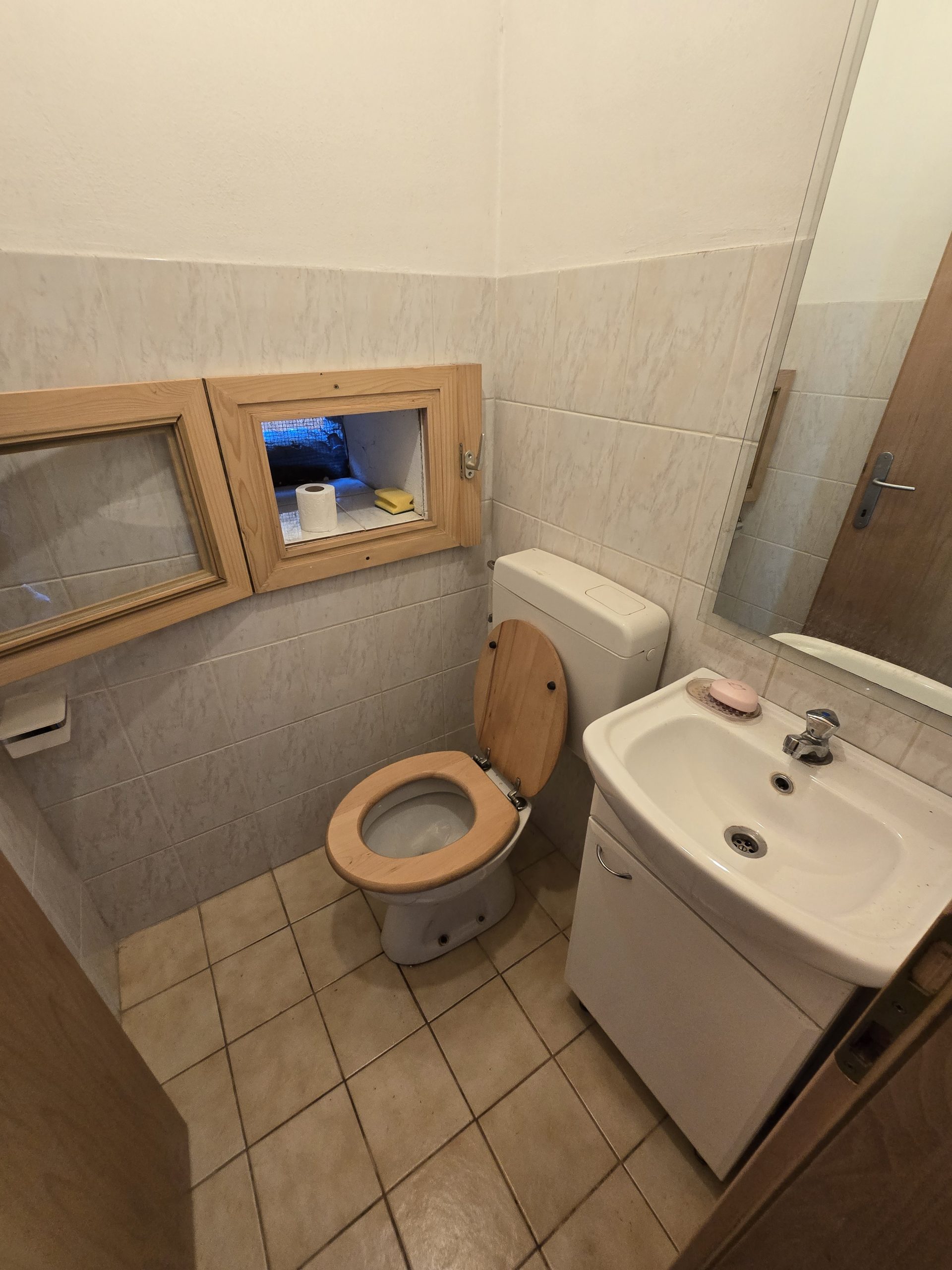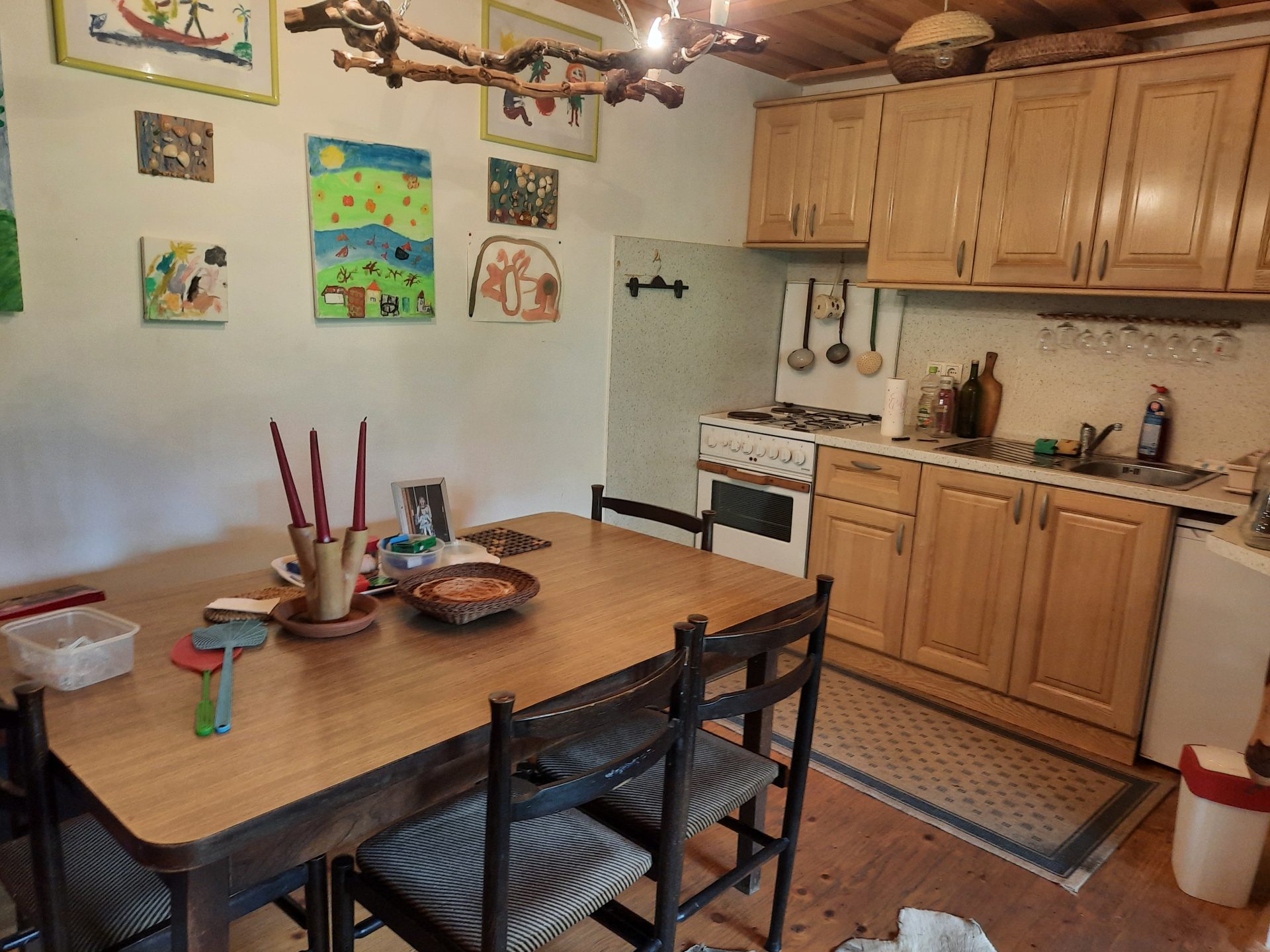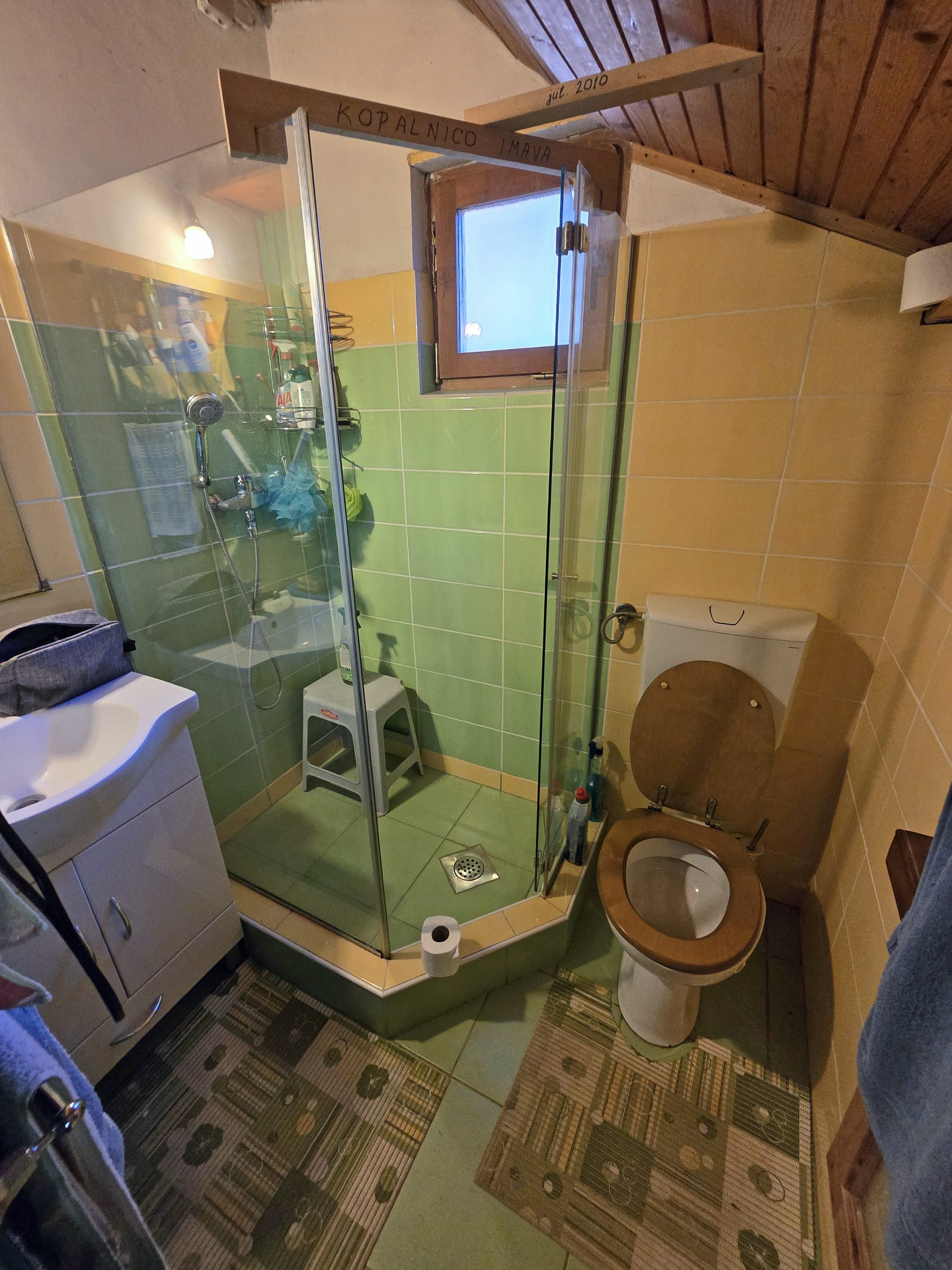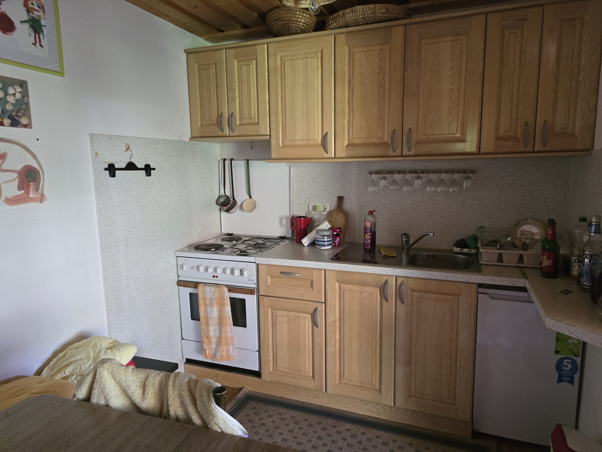 V pritličju se nahaja dnevni prostor s kuhinjo in WC. Ogrevanje je urejeno z “gašperčkom” na drva.