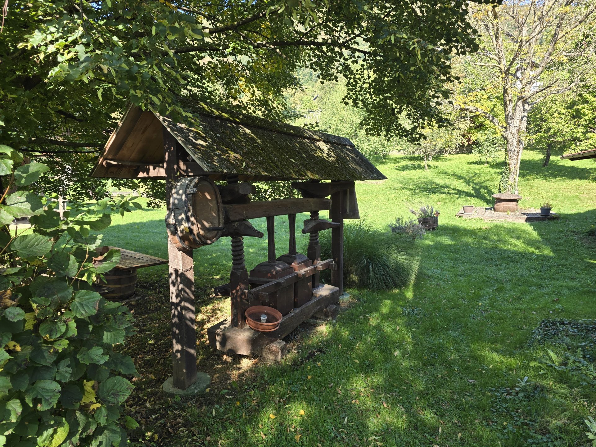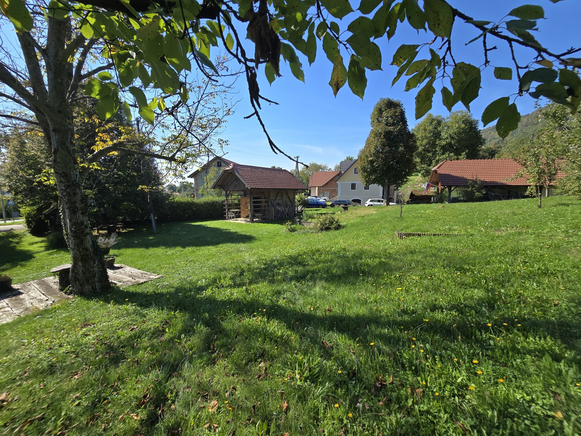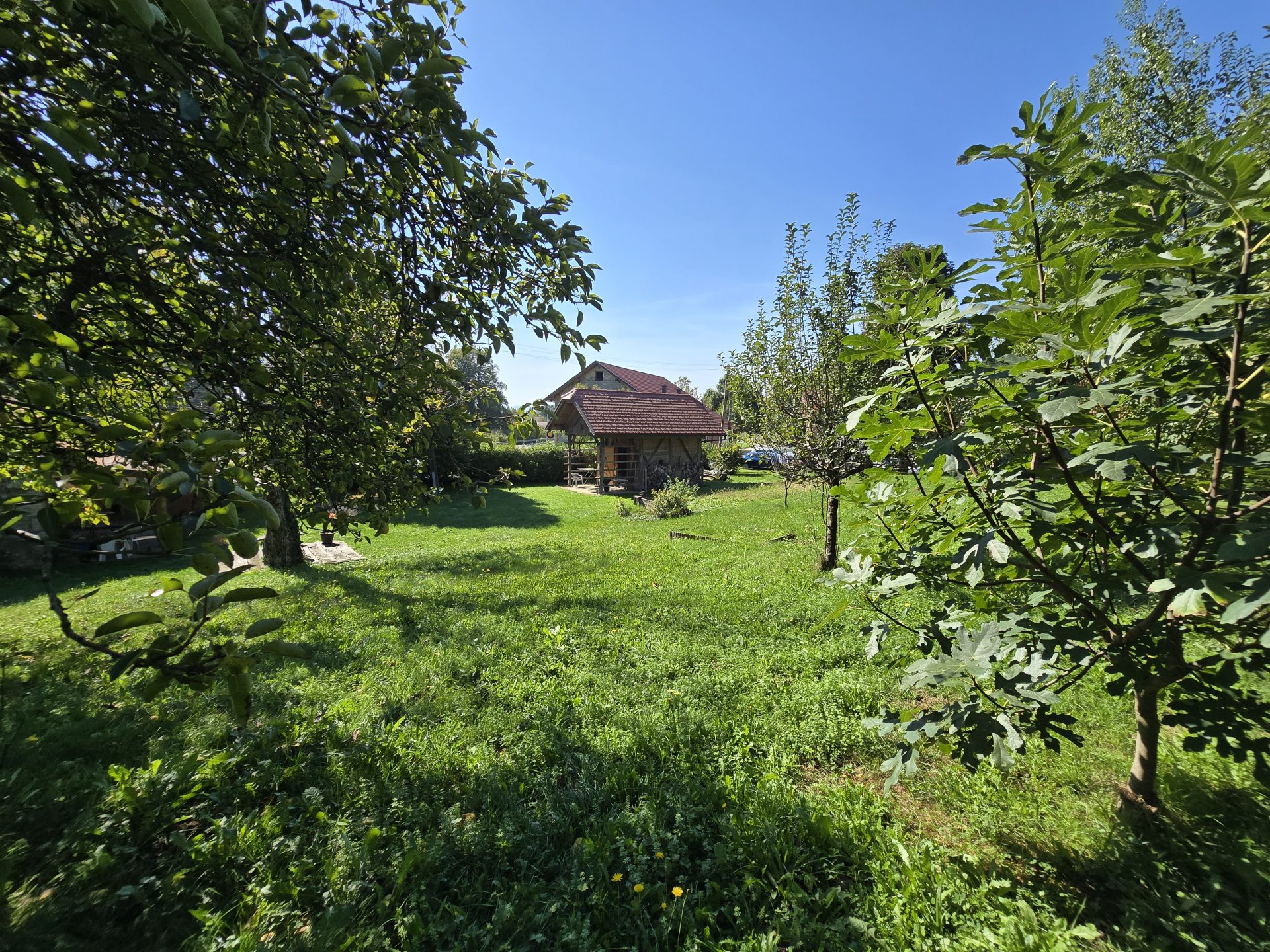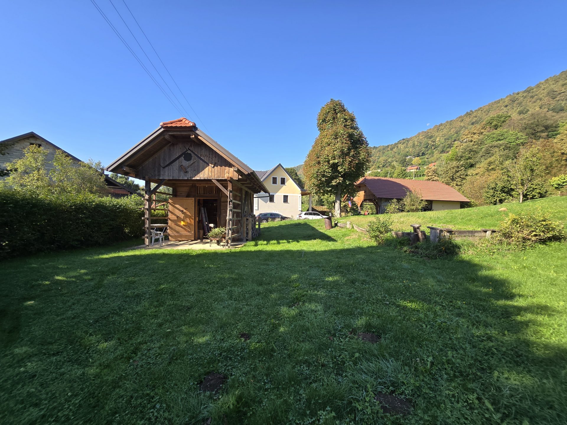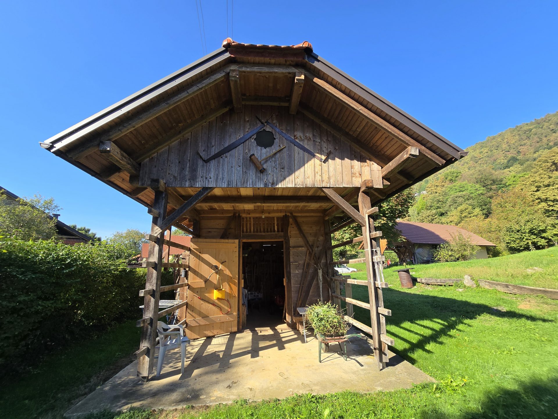 Na zemljišču je tudi kozolec iz leta 2010. V njem je shramba za vrtno orodje.