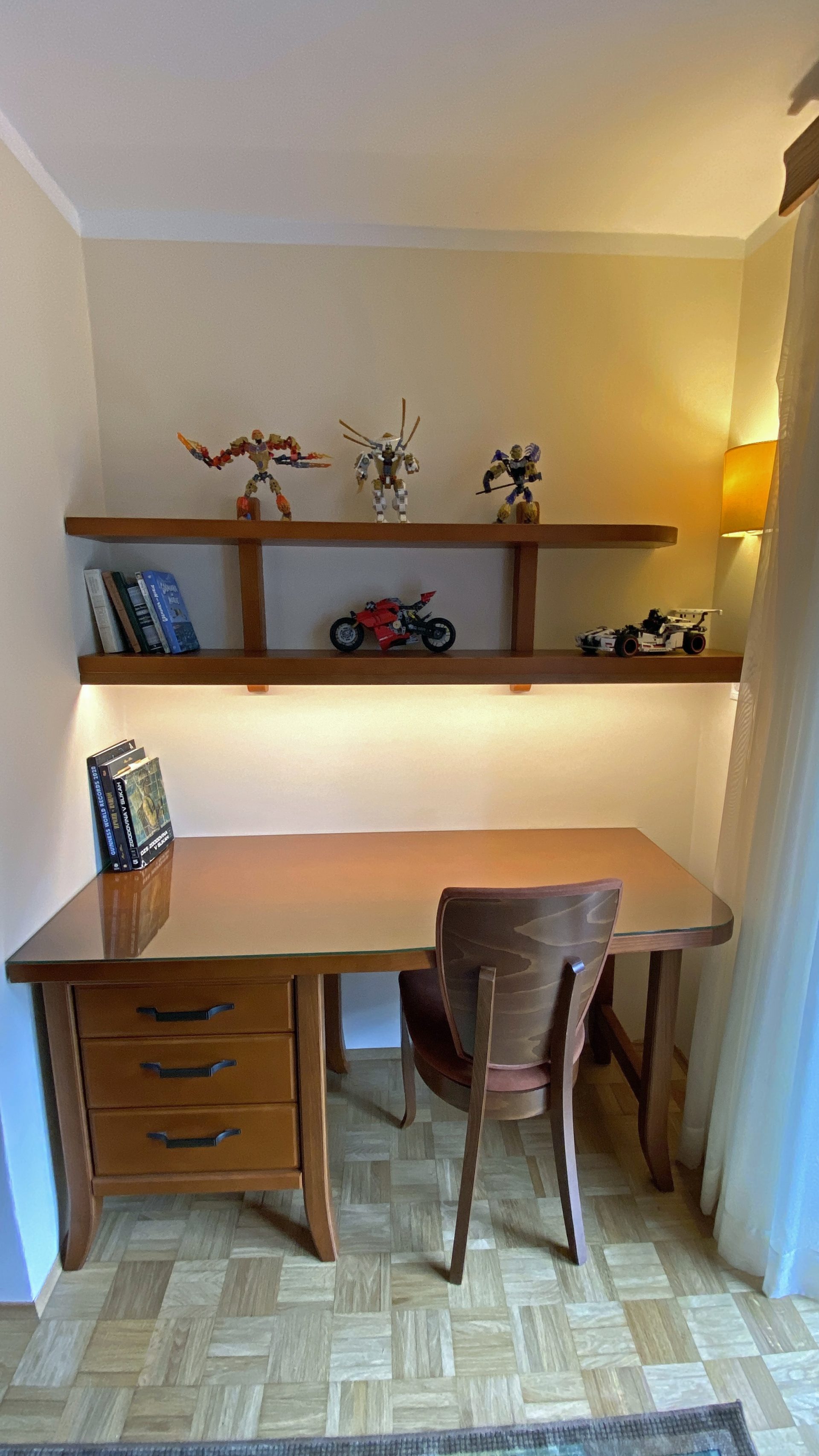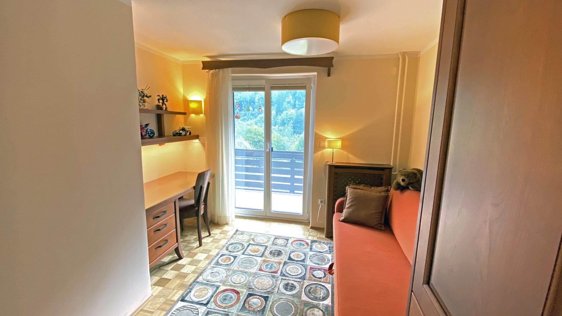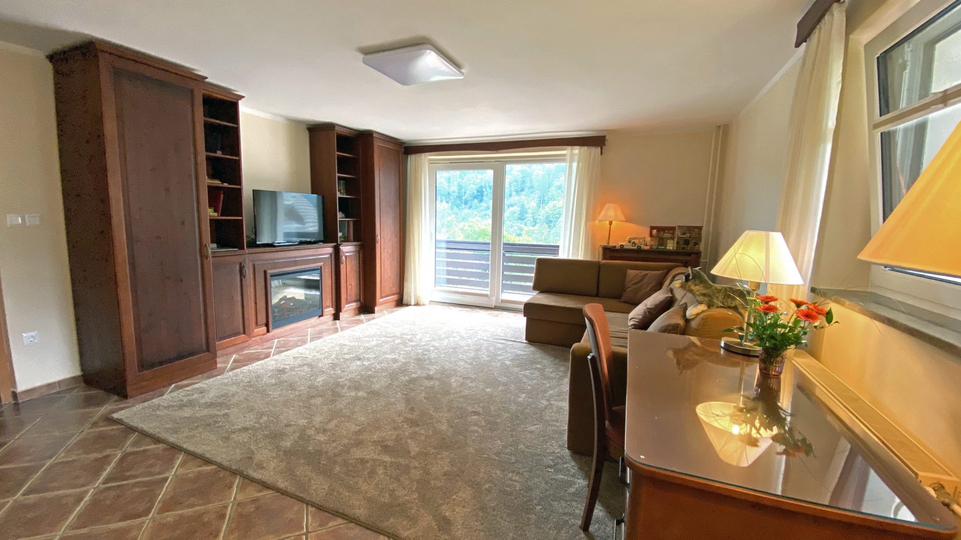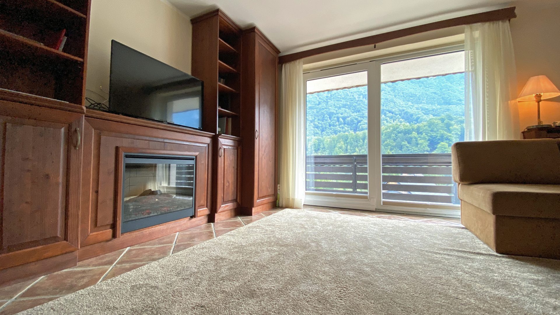 Obsega prostorno dvevno sobo z velikimi drsnimi vrati na balkon s čudovitim razgledom, omarami za shranjevanje in električnim kaminom.