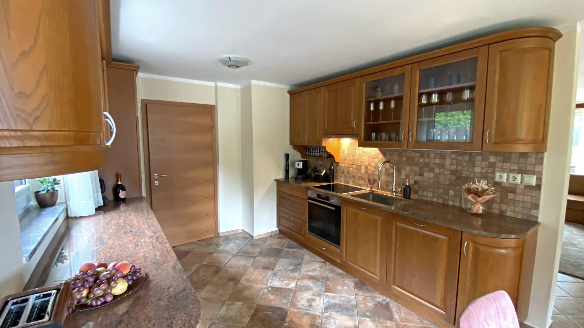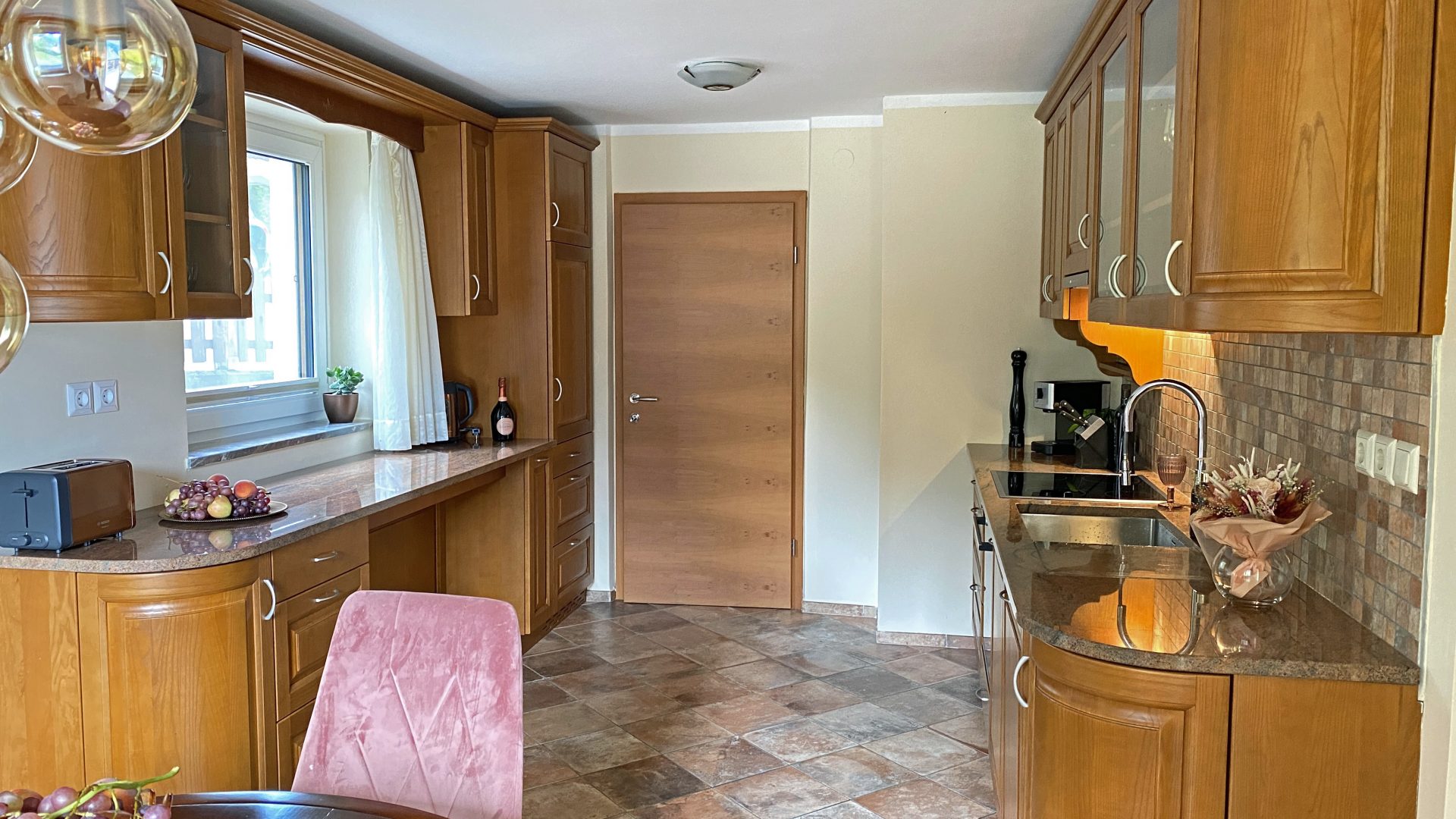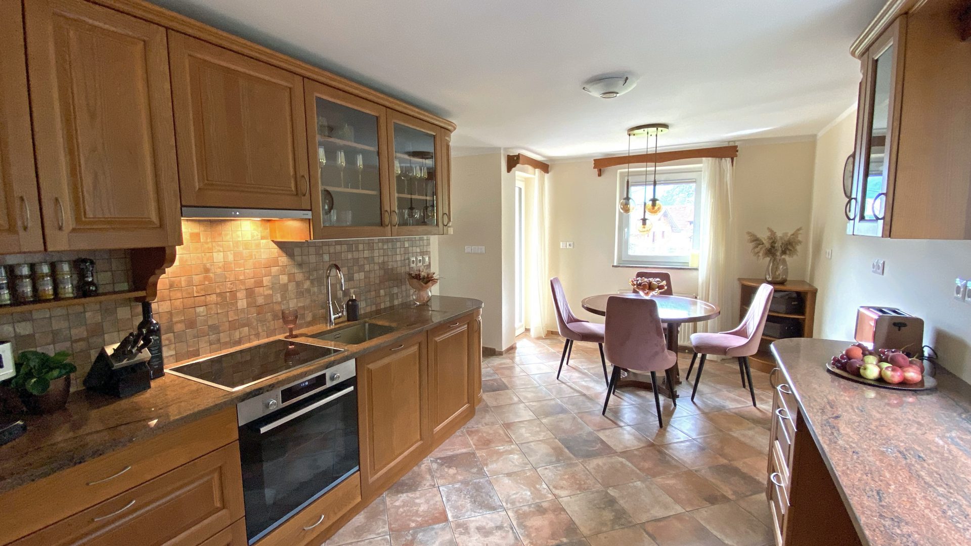 Dnevna soba vodi do po meri izdelane lesene kuhinje z jedilnico popolnoma opremljene z Boschevimi aparati. Kuhinja ima še utility in shrambo.