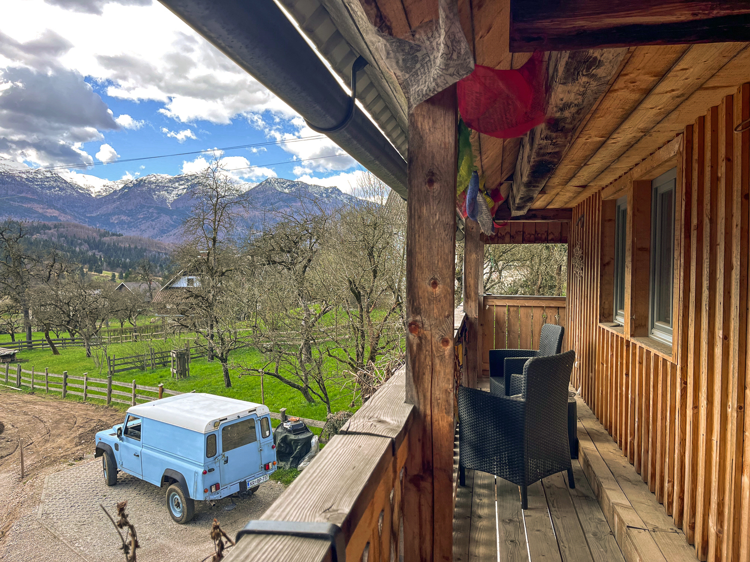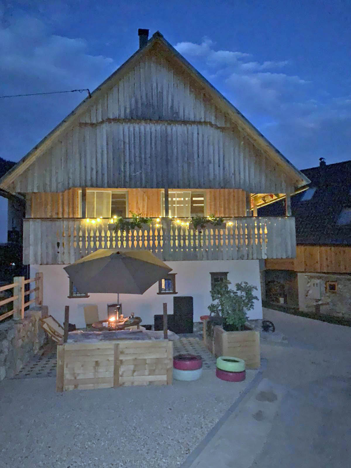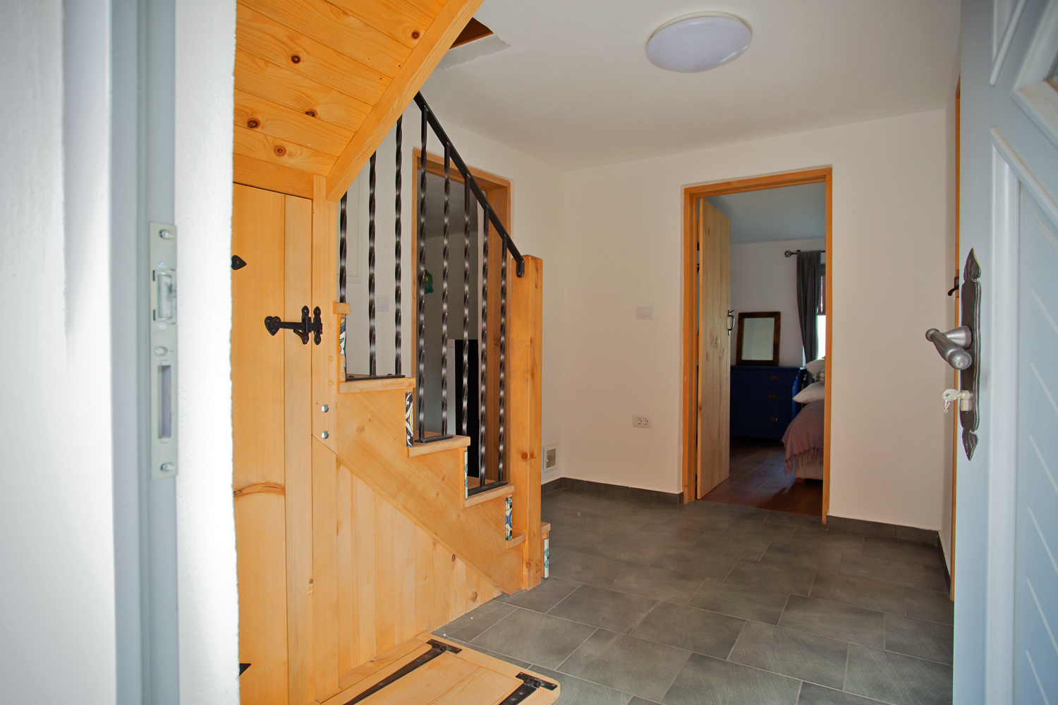 V zgornjem nadstropju se nahaja dnevni in jedilni prostor odprtega tipa, z velikimi vrati/okni, balkon, kuhinja. Kuhinja je opremljena z vsemi potrebnimi aparati. V dnevni sobi je tudi kamin na drva.