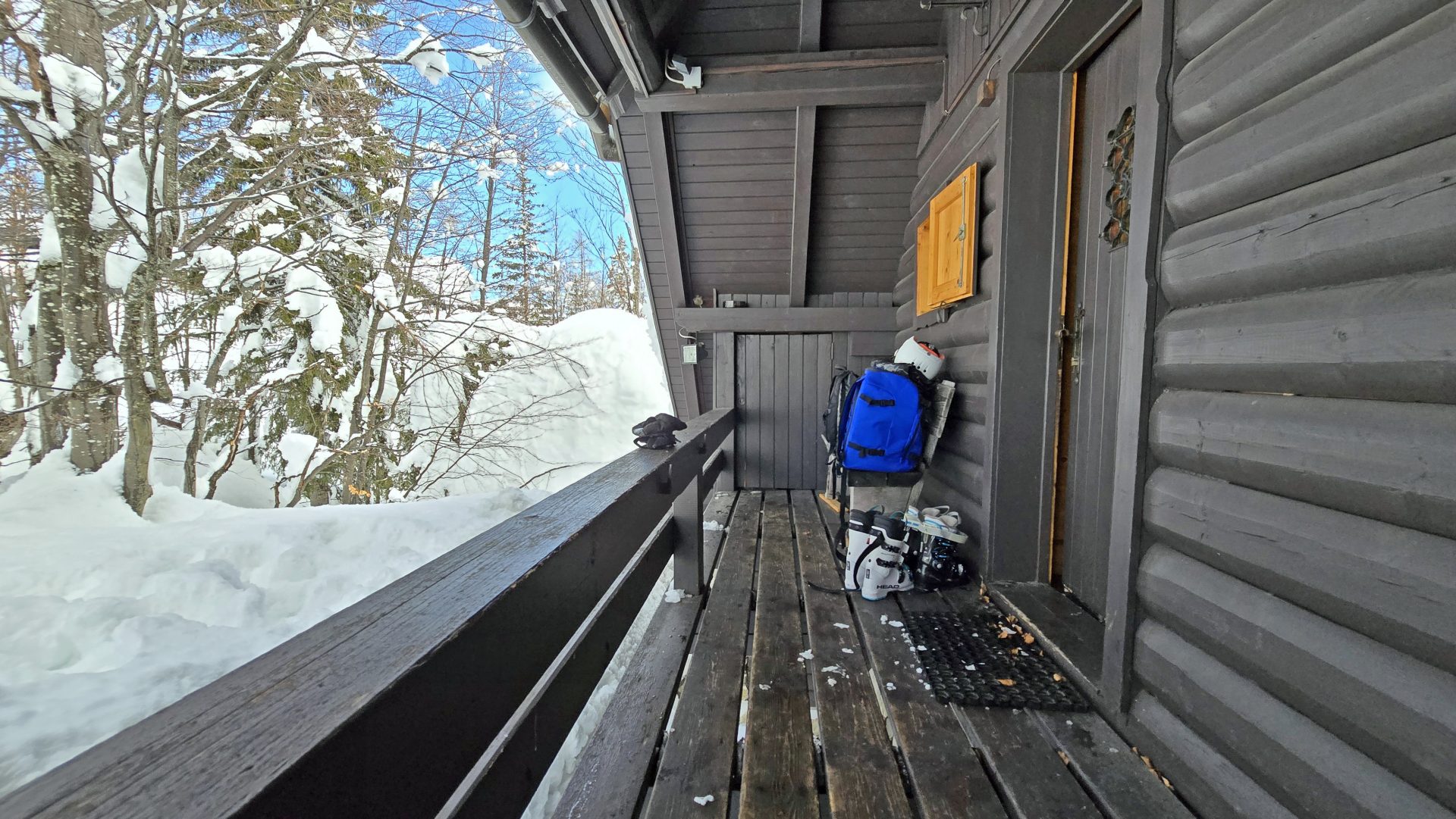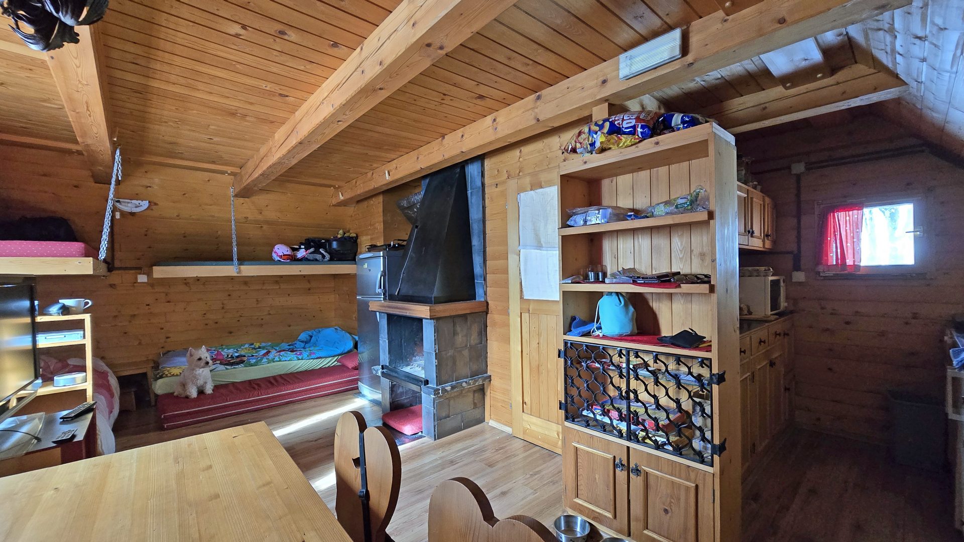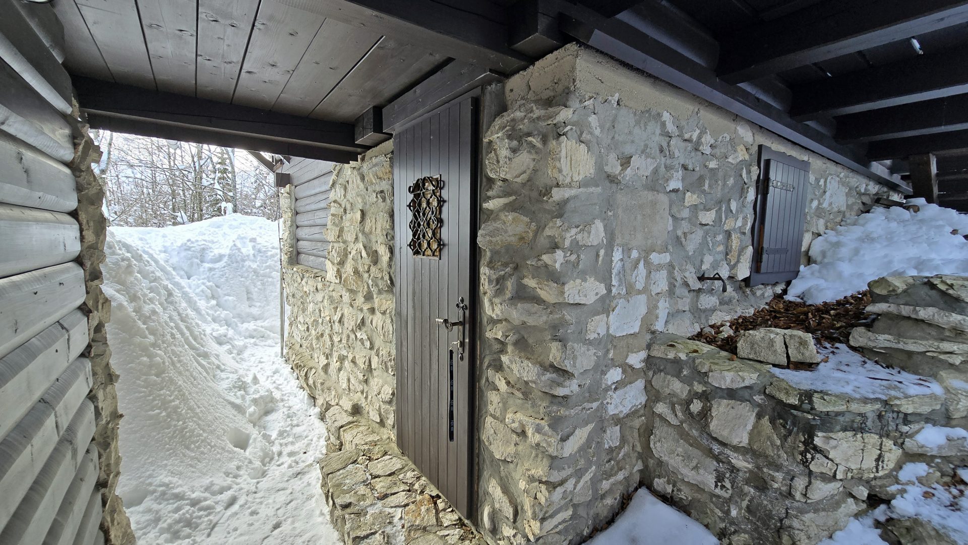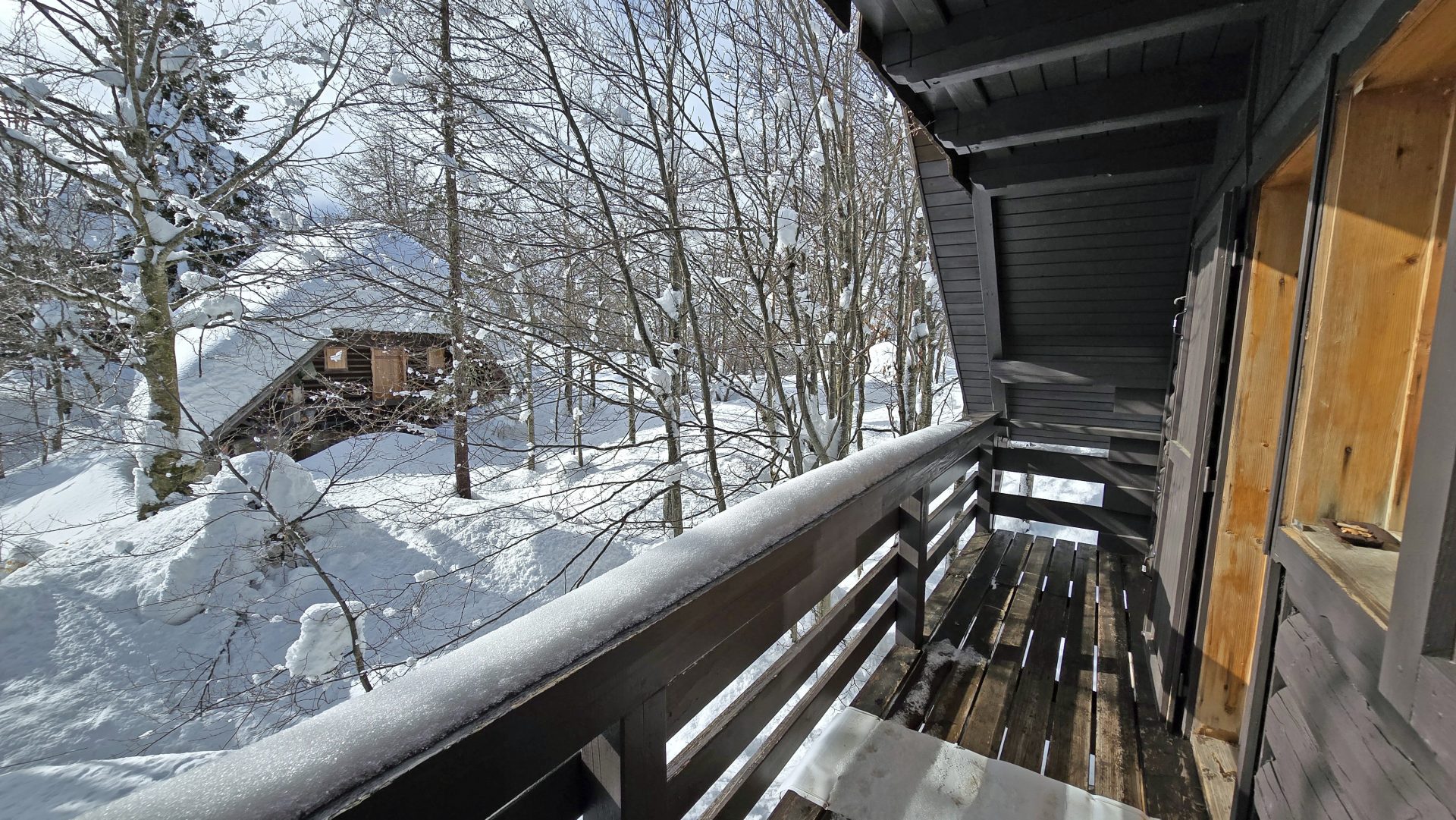 Na zunanji strani se nahaja prostorna lesena terasa, idealna za sproščanje, obedovanje in uživanje v naravnem okolju. Koča stoji na 247 m² veliki parceli, ki kljub izjemni legi na smučišču nudi dovolj zunanjega prostora.