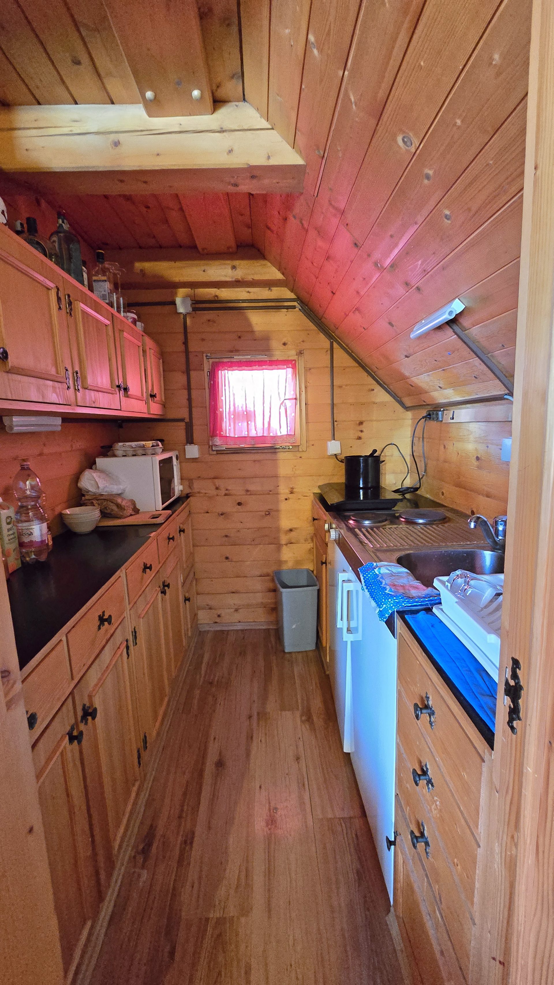 Obsega odprt dnevno-bivalni prostor z jedilnico in popolnoma opremljeno kuhinjo, hodnik ter kopalnico s tušem.