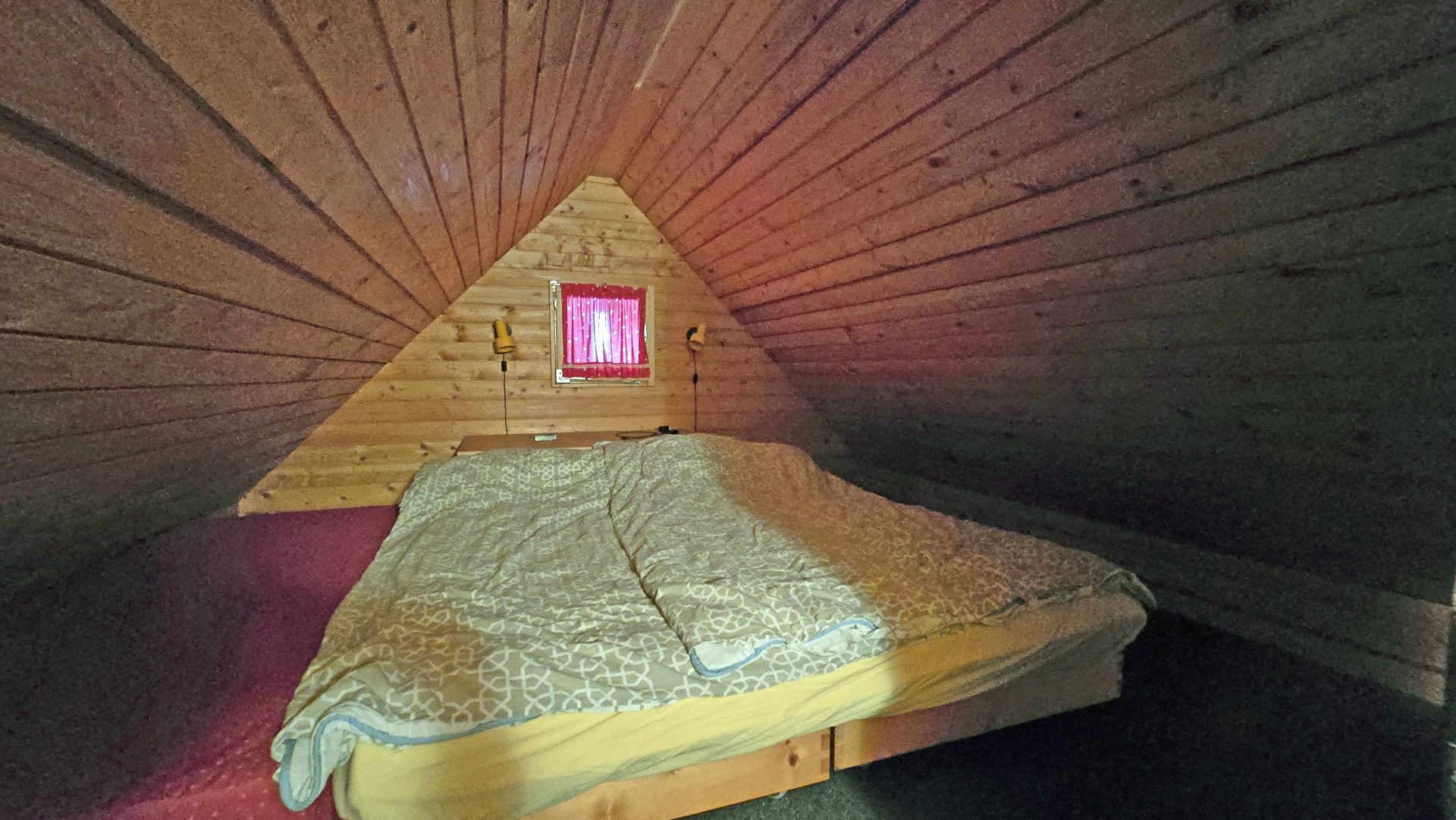 Vključuje hodnik z lestvijo do zgornjega spalnega prostora, kopalnico, odprt dnevno-bivalni prostor z jedilnico in kaminom, kuhinjo ter velik balkon. Spalnica se nahaja v zgornji etaži.