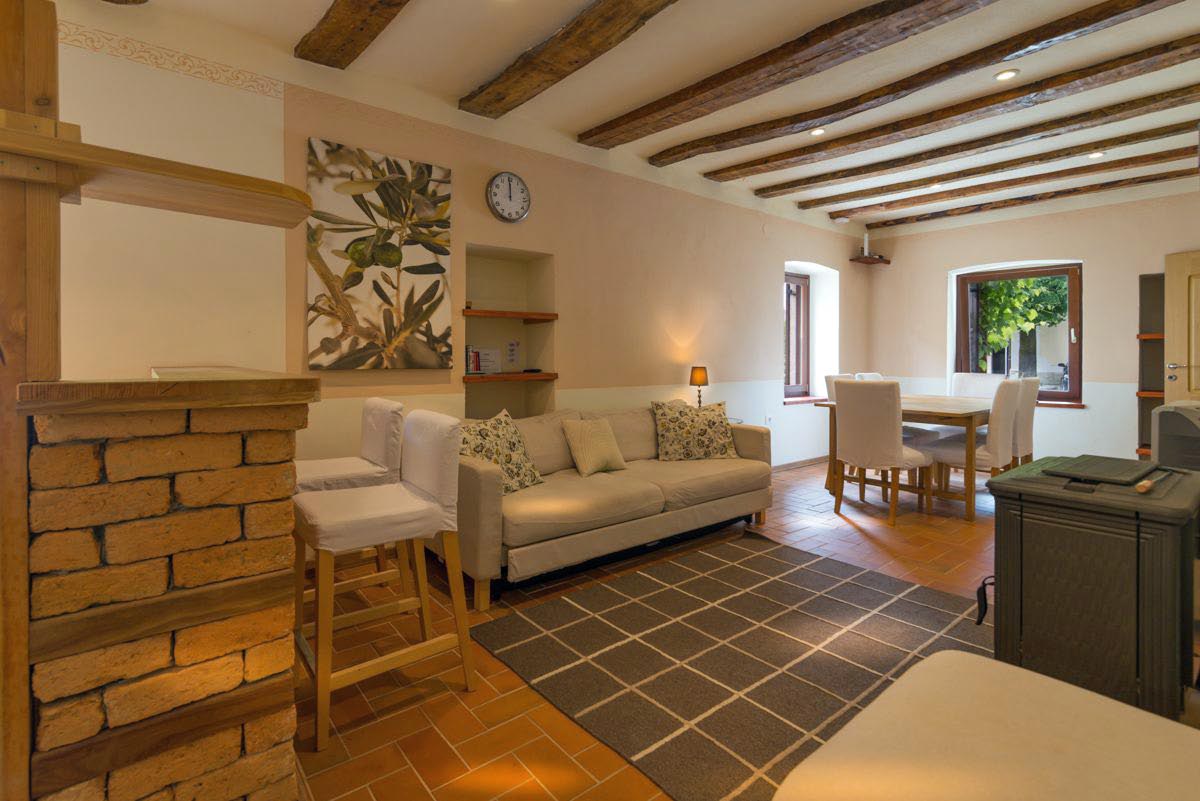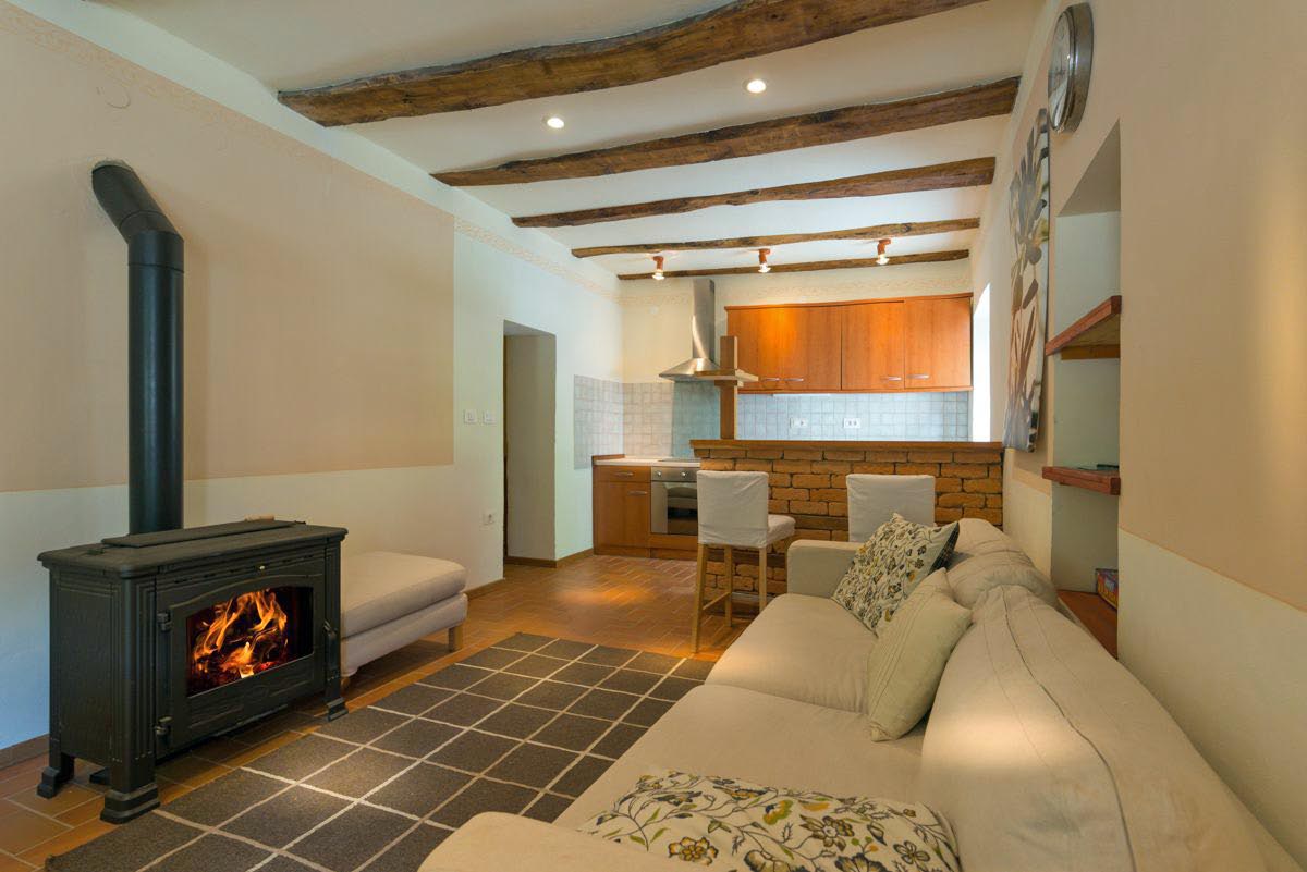 Notranjost obsega prostoren odprt dnevni prostor s kuhinjo, jedilnico in dnevno sobo, kjer prijetno vzdušje dopolnjuje kamin na drva.