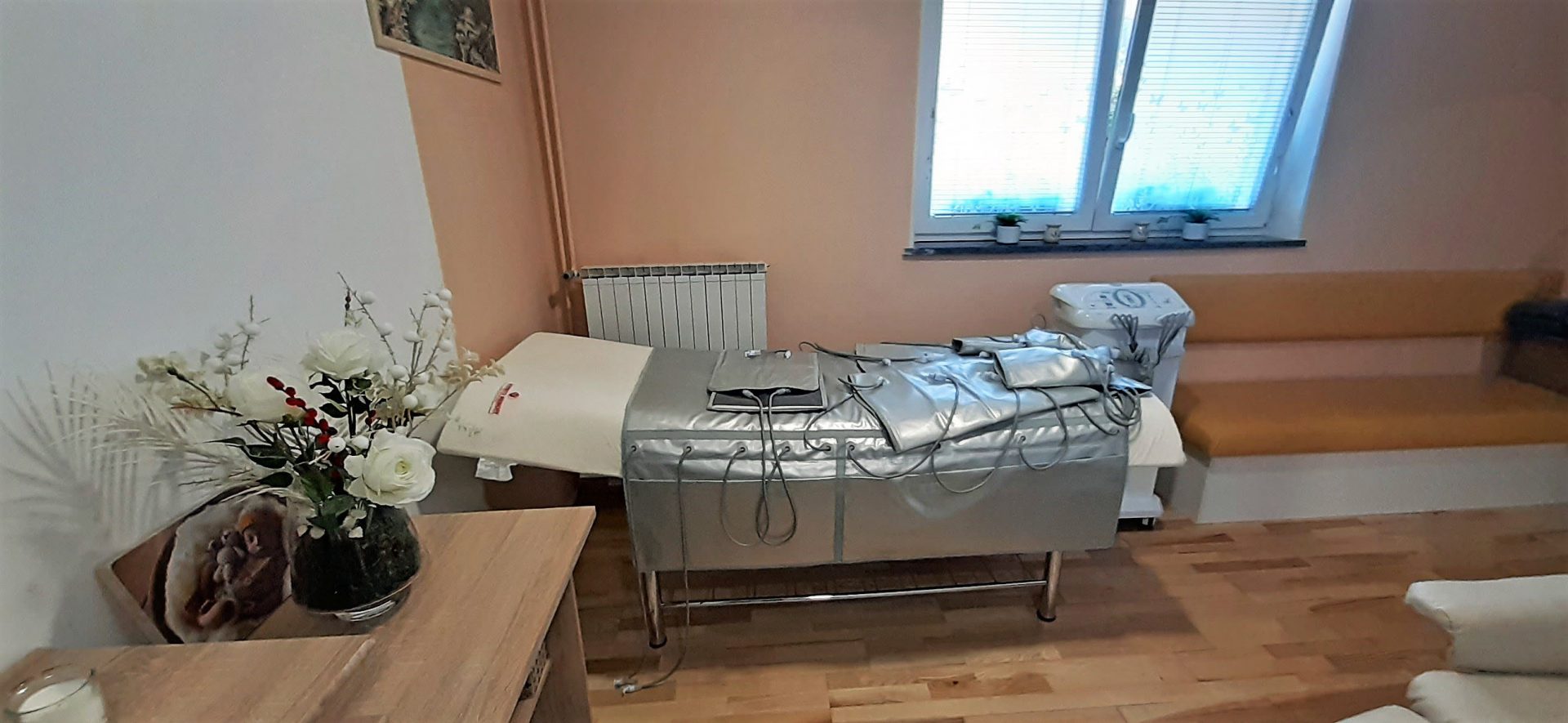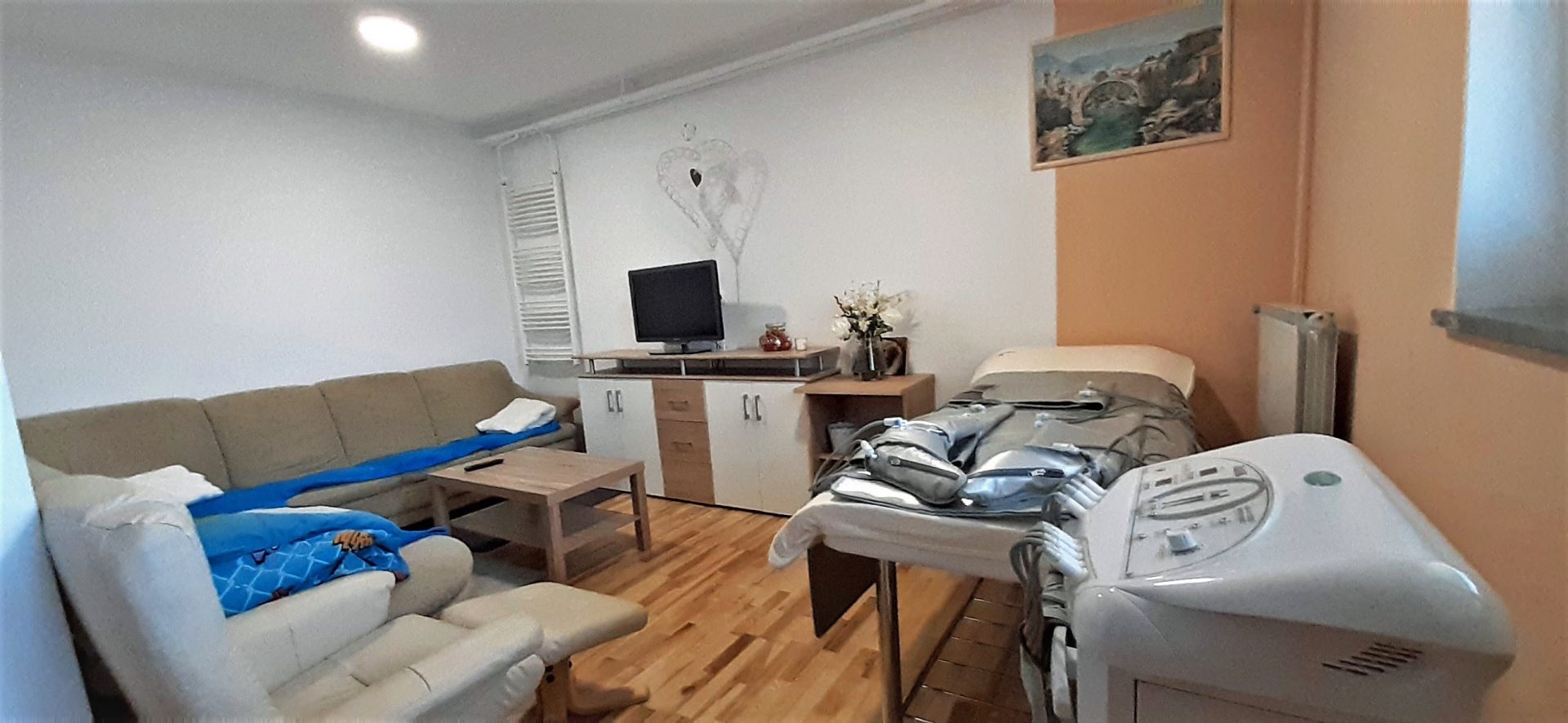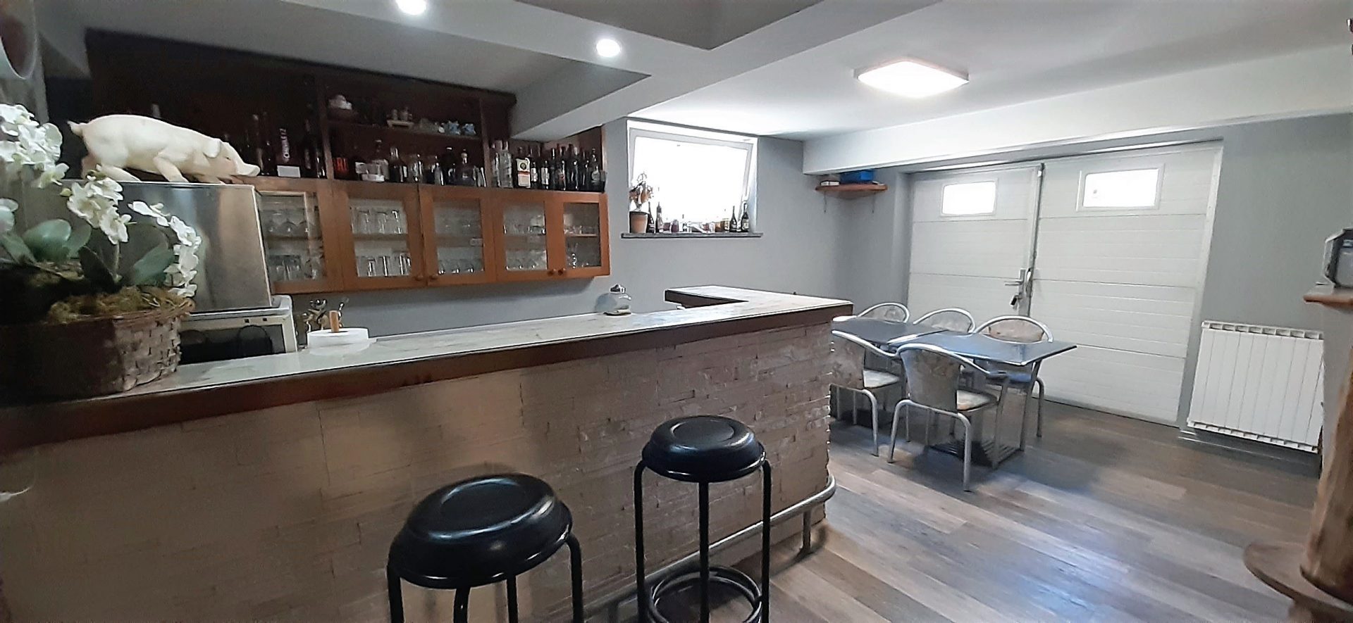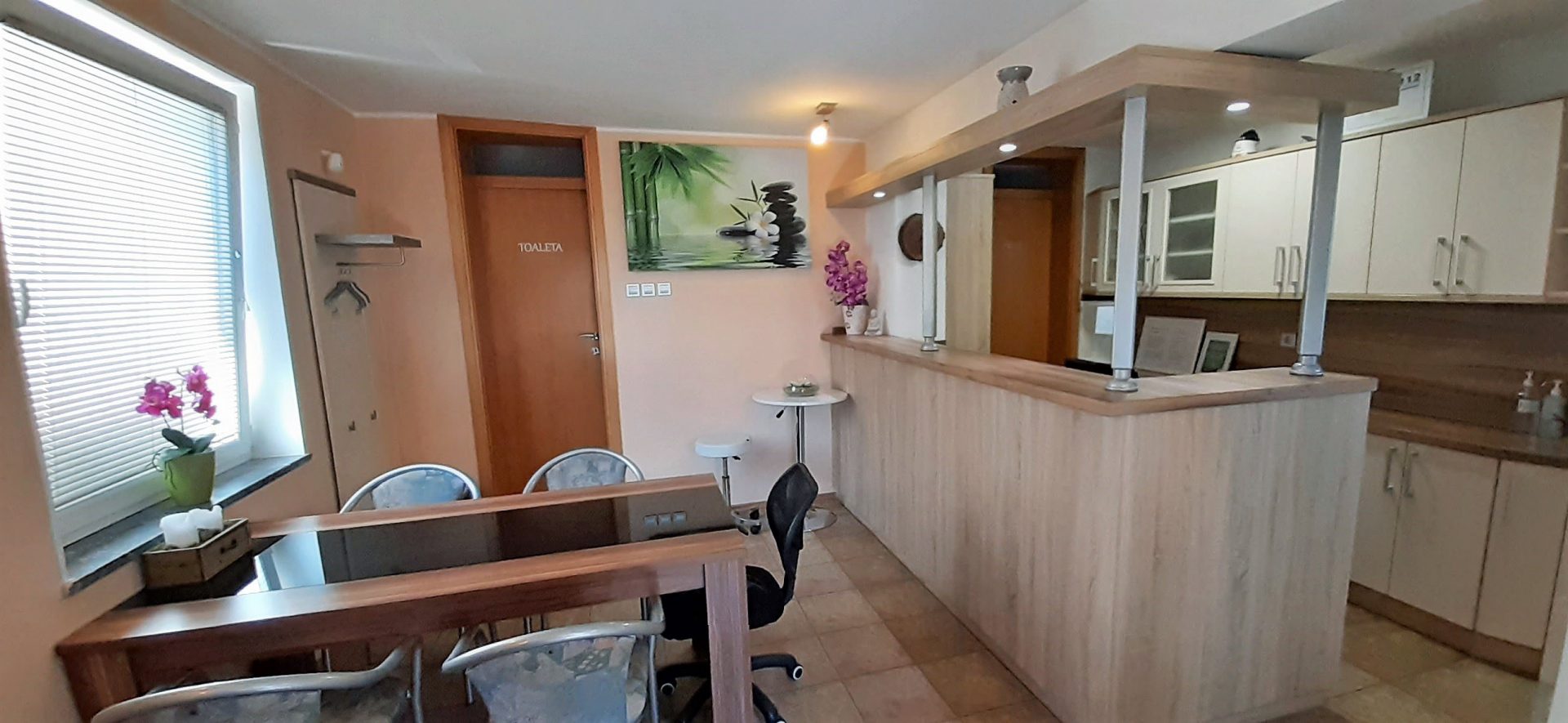 V pritličju hiše se nahaja poslovni prostor, ki je trenutno urejen kot masažni salon s prijetnim predprostorom, kjer je tudi manjša kuhinja. V tej etaži je še kurilnica, shramba, ter večji prostor za druženje z barom.