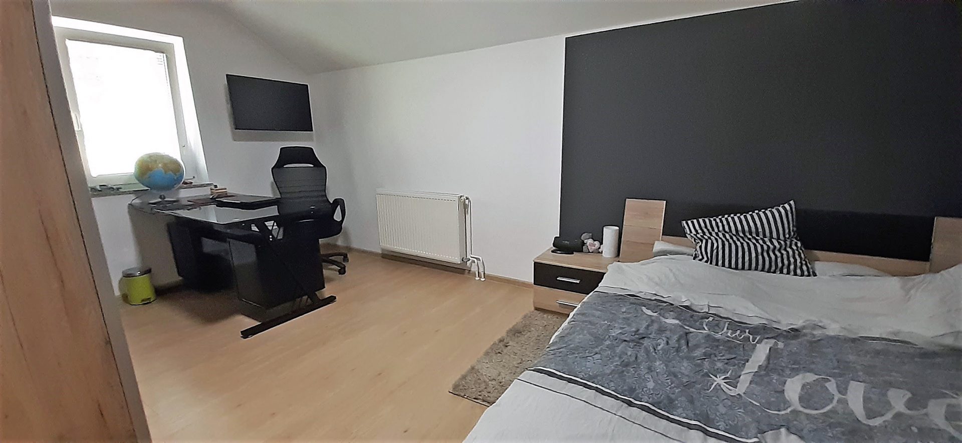 V nadstropju je velik svetel dnevni prostor povezan z jedinico in moderno kuhinjo ter izhodom na balkon. Tu je še spalnica, kopalnica, pisarna in WC. Dodatna soba s pisarno ima lasten vhod s strani vrta.