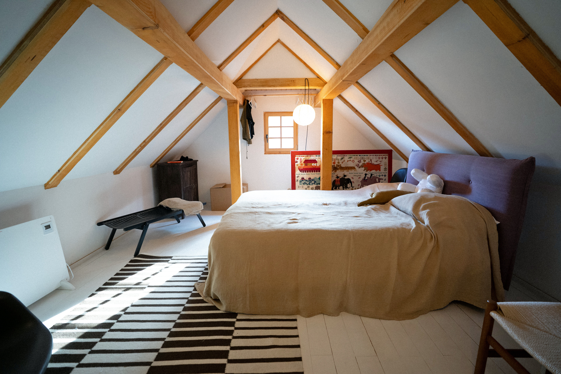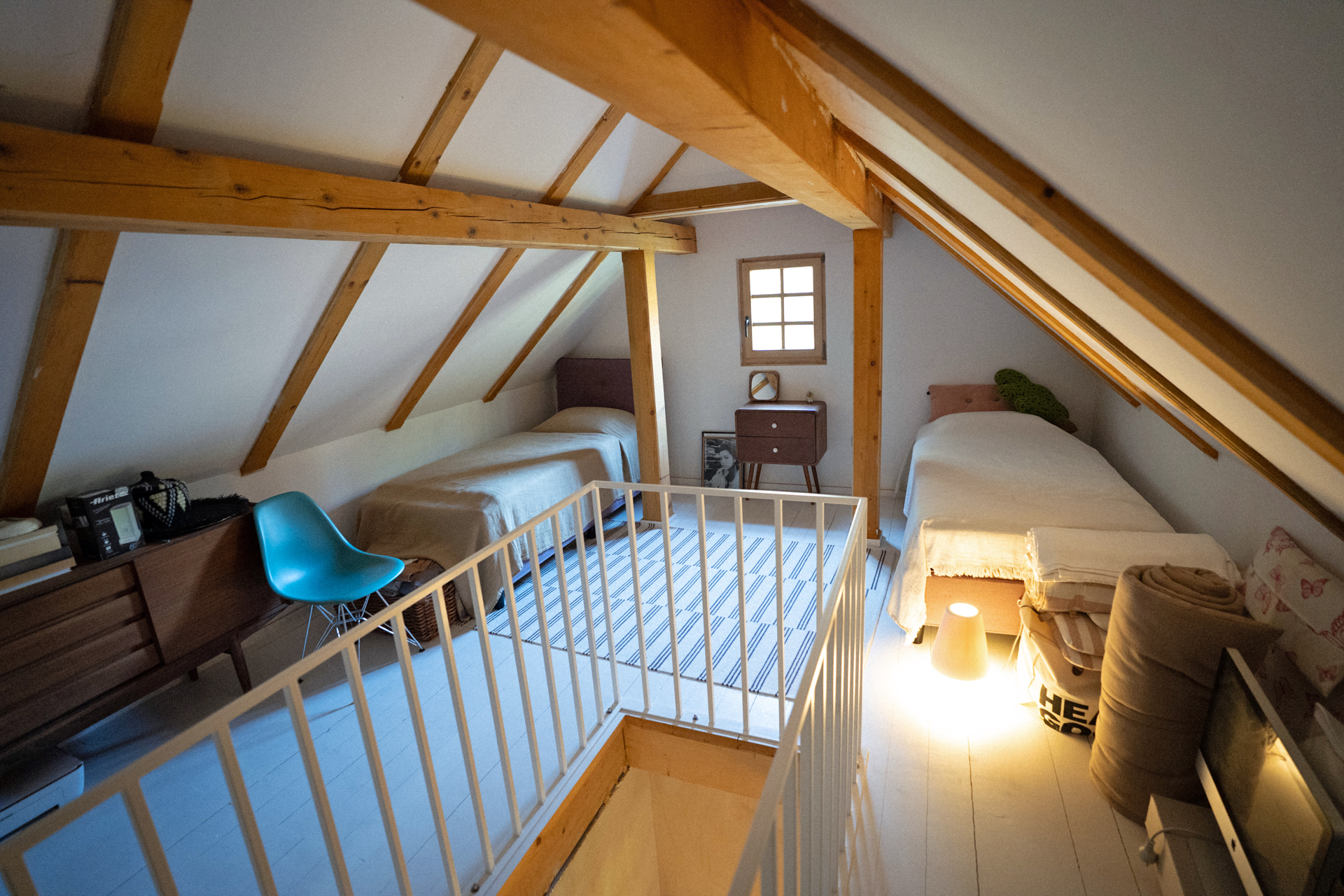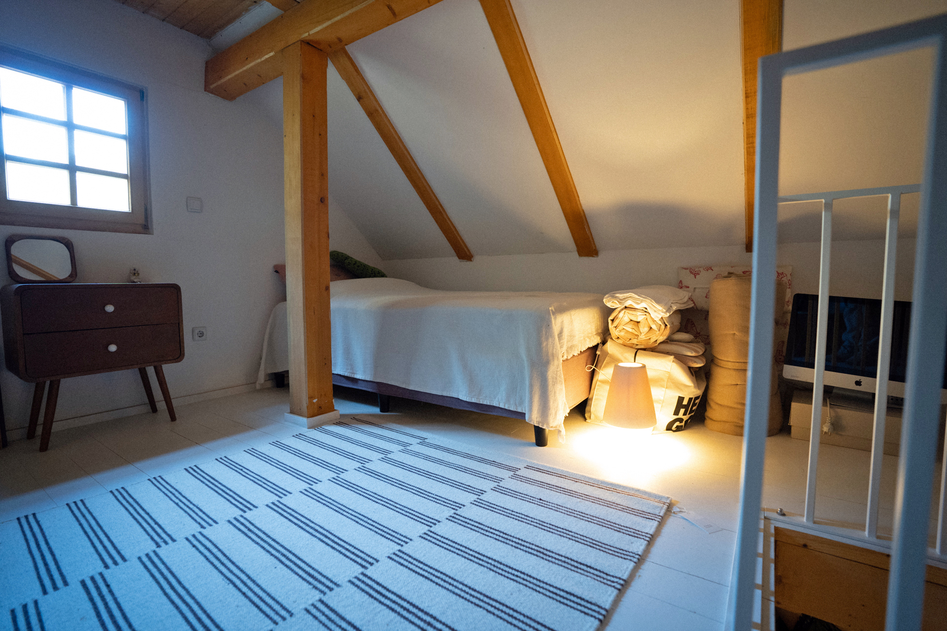 - Nadstropje: glavna spalnica in galerija z dodatnimi ležišči