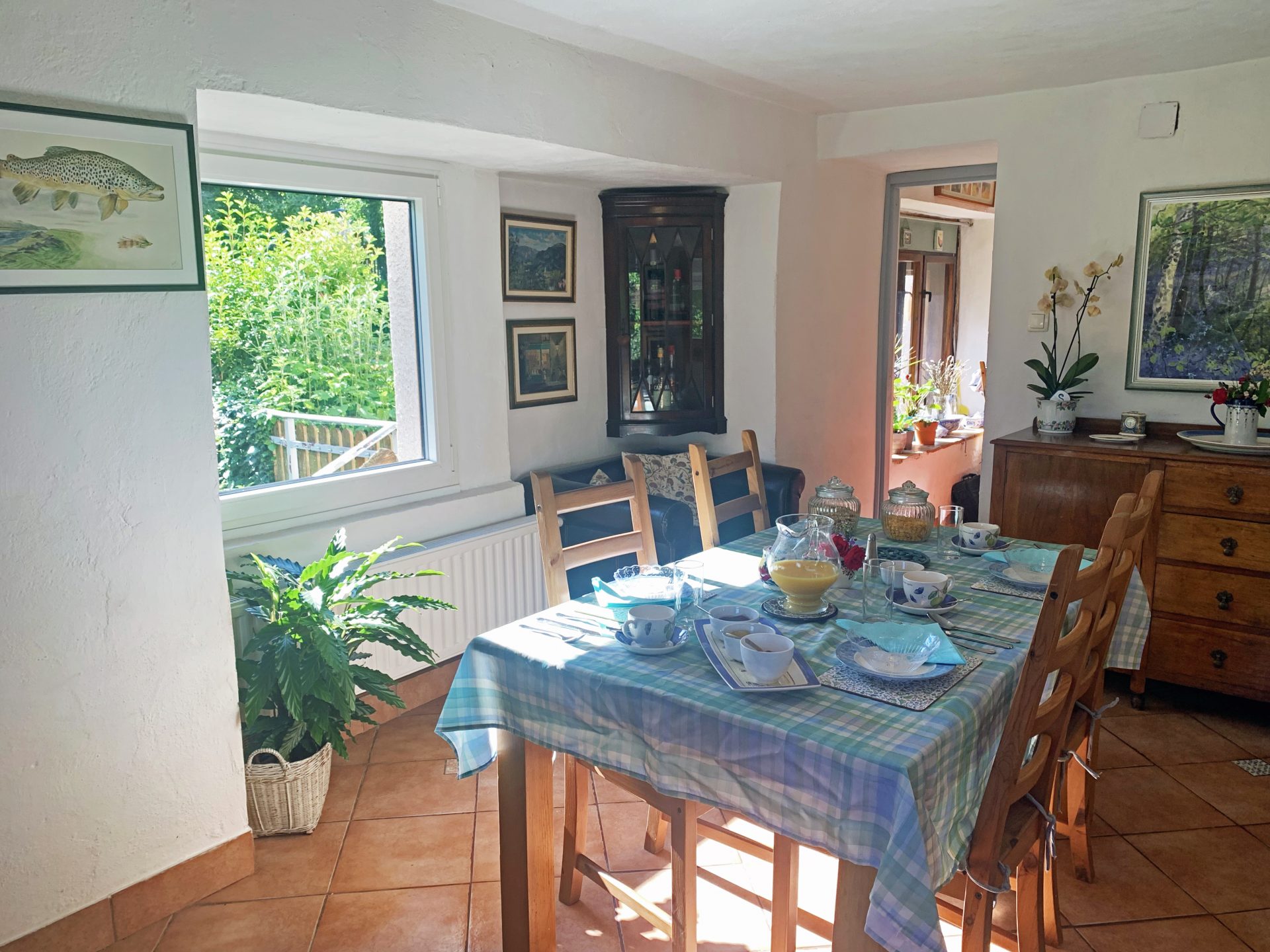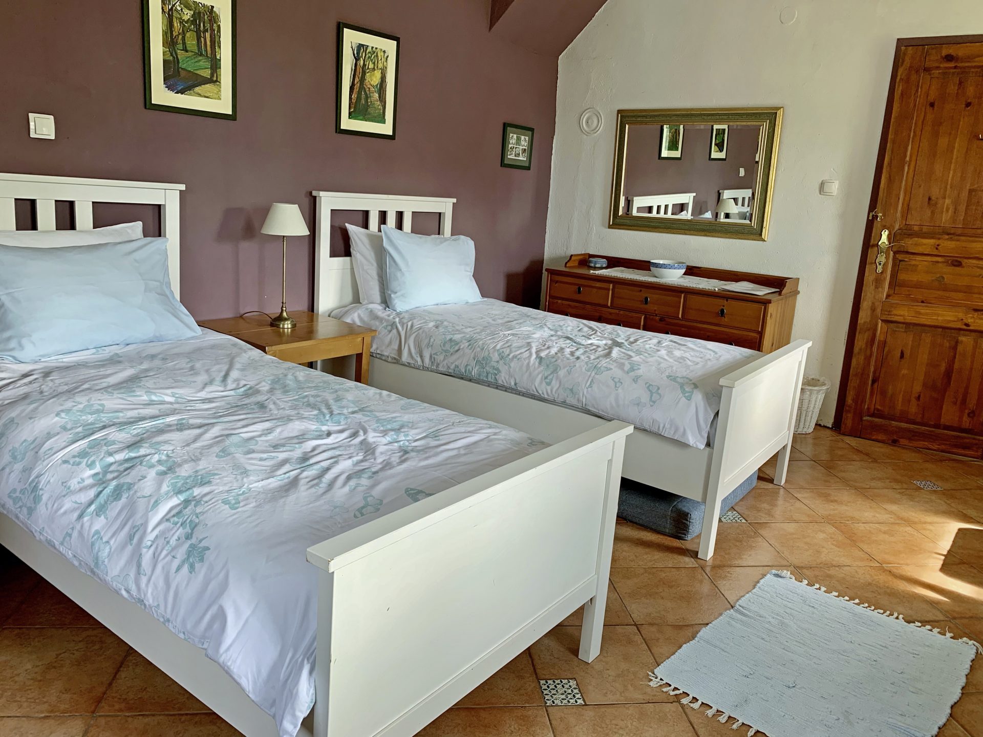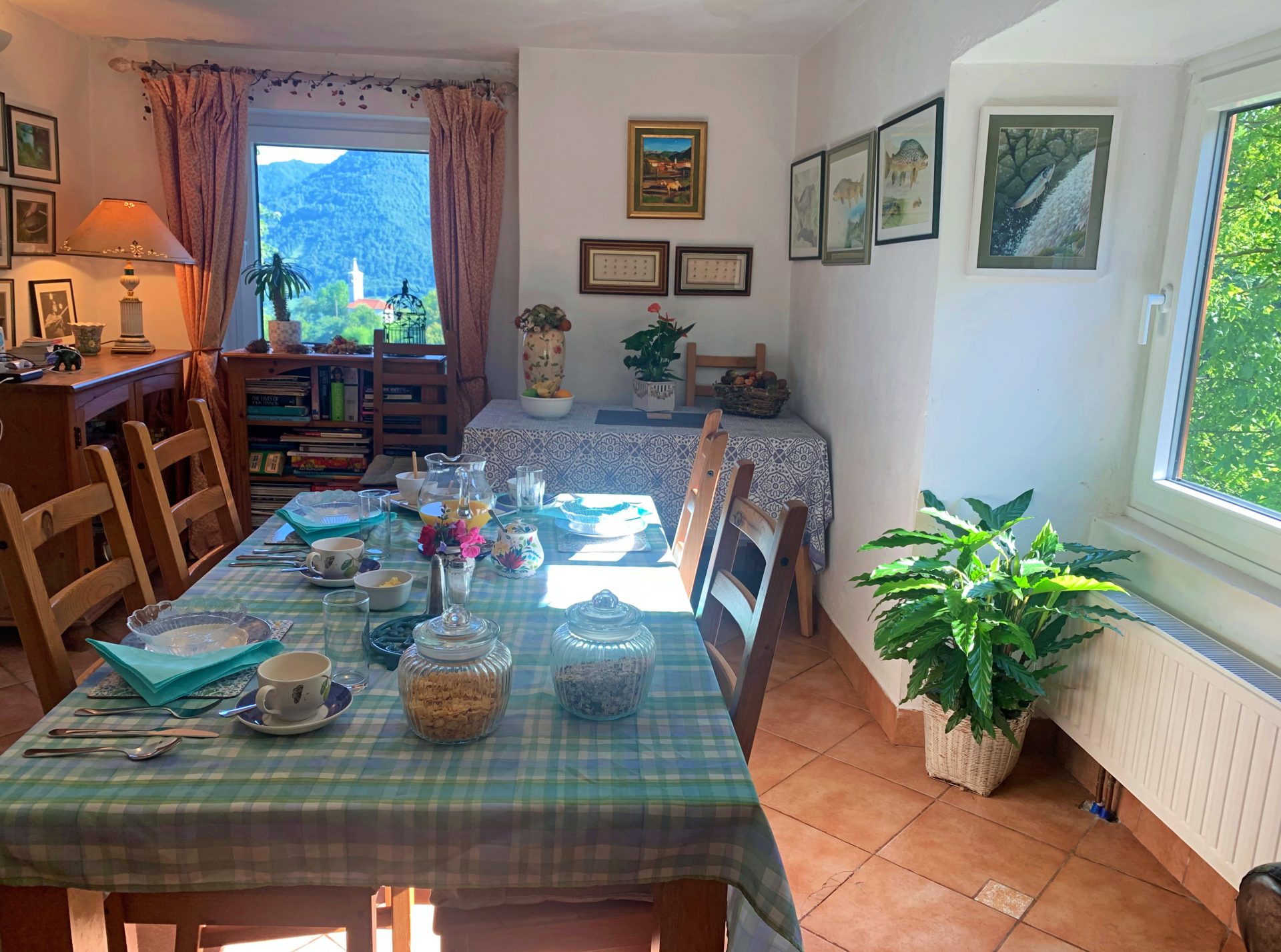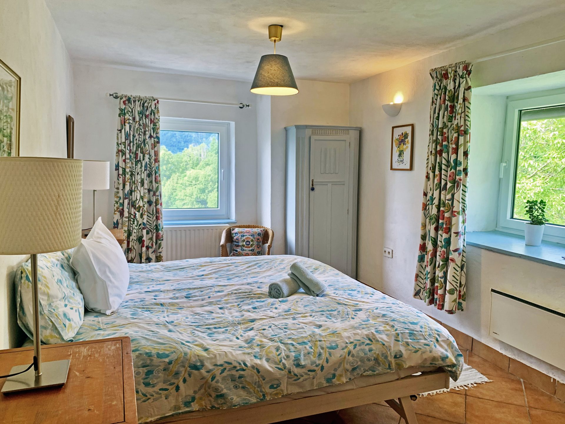 Sobe in kopalnice so prostorne, tri v glavni hiši so individualno oblikovane in opremljene z mislijo na udobje in sprostitev, z velikimi udobnimi posteljami in individualnimi umetninami na stenah. Skozi okna so pogledi na vrtove, travnike in gore idilični. V glavni hiši je udoben salon s TV, mizo za vezanje, za ustvarjanje ribiških muh in pečjo na drva, v našem glavnem salonu knjižna omara ali dve z veliko izbiro knjig in revij. Nekatere sobe za goste imajo mize za pisatelje na obisku in za tiste, ki morate še vedno ostati v stiku s pisarno.