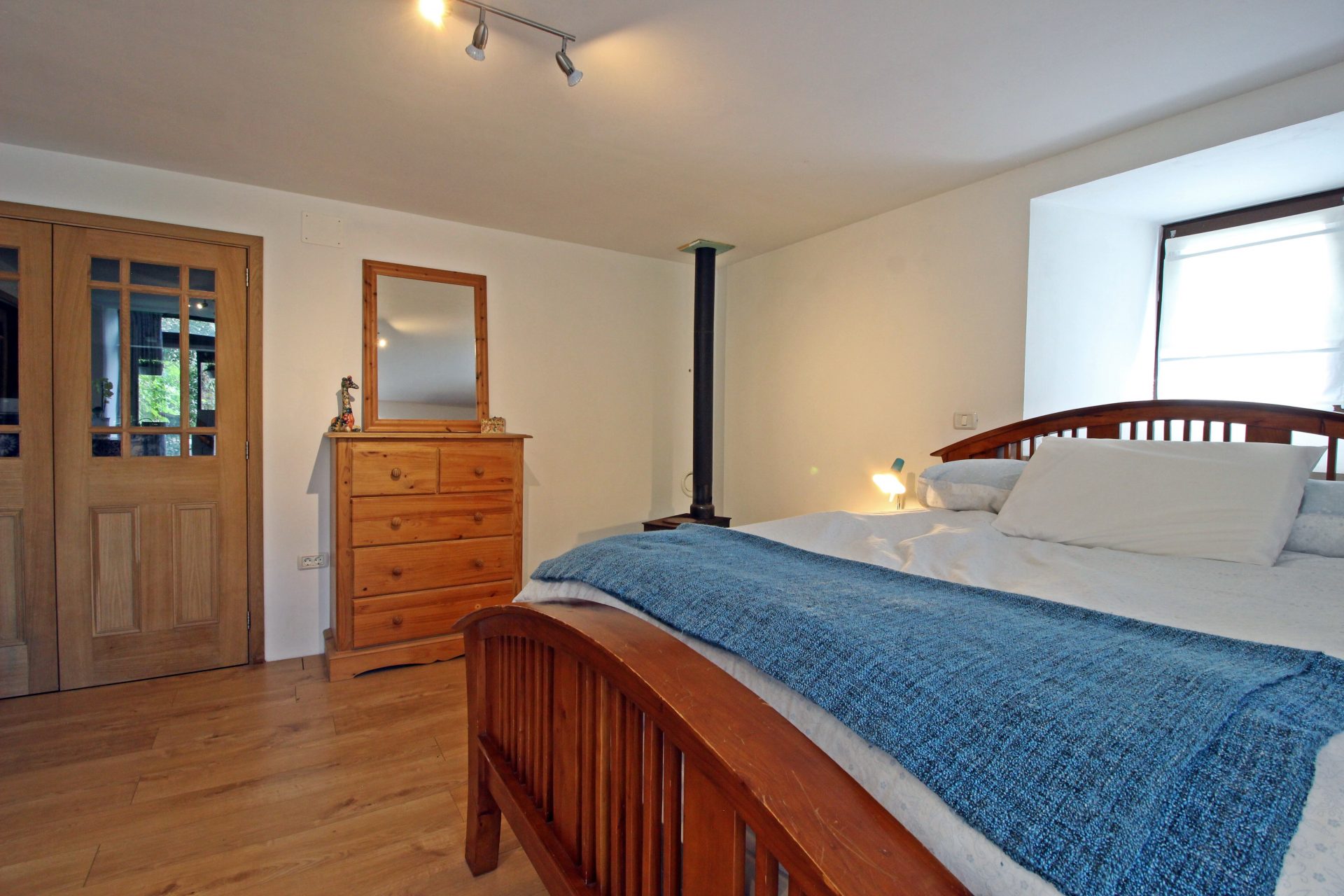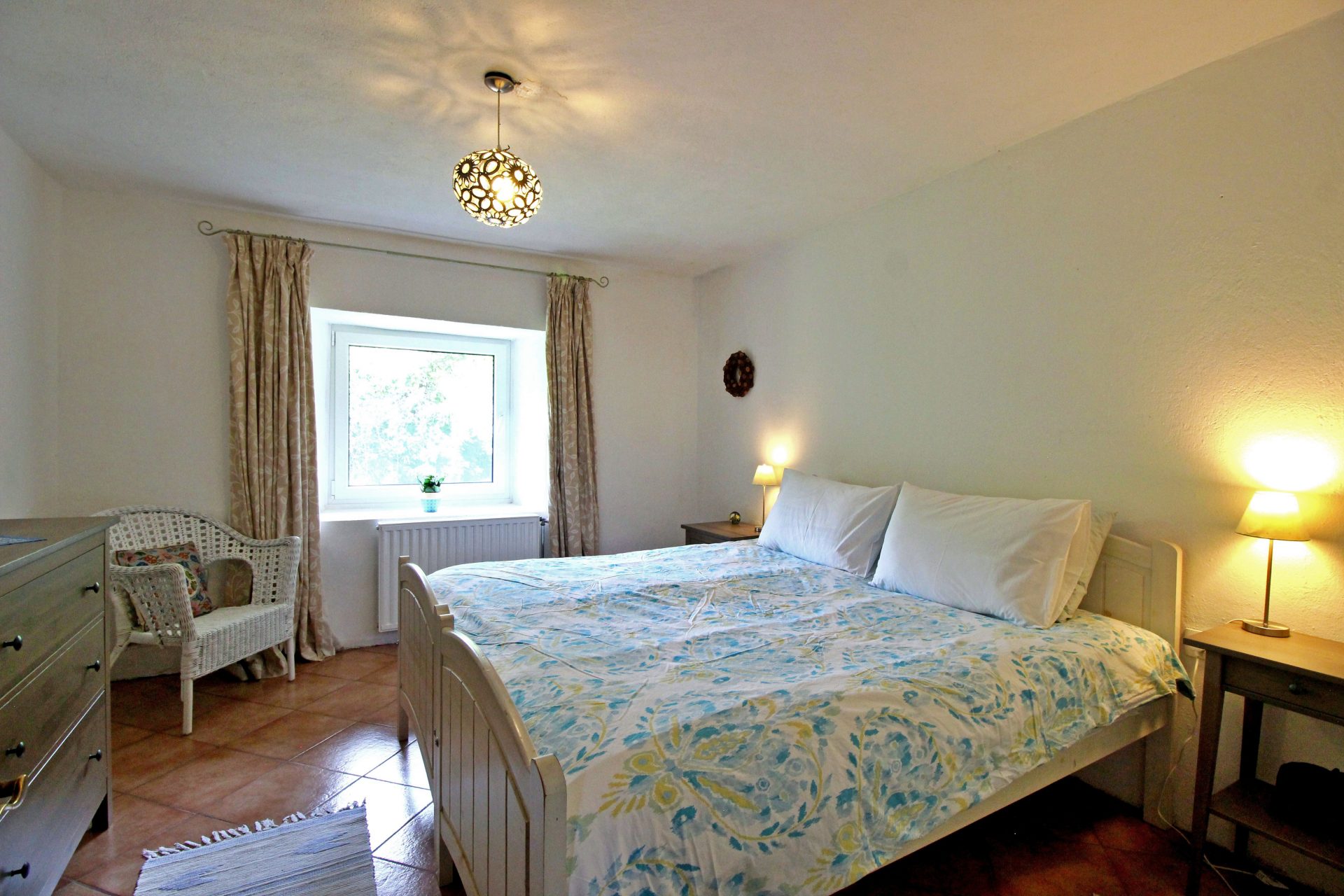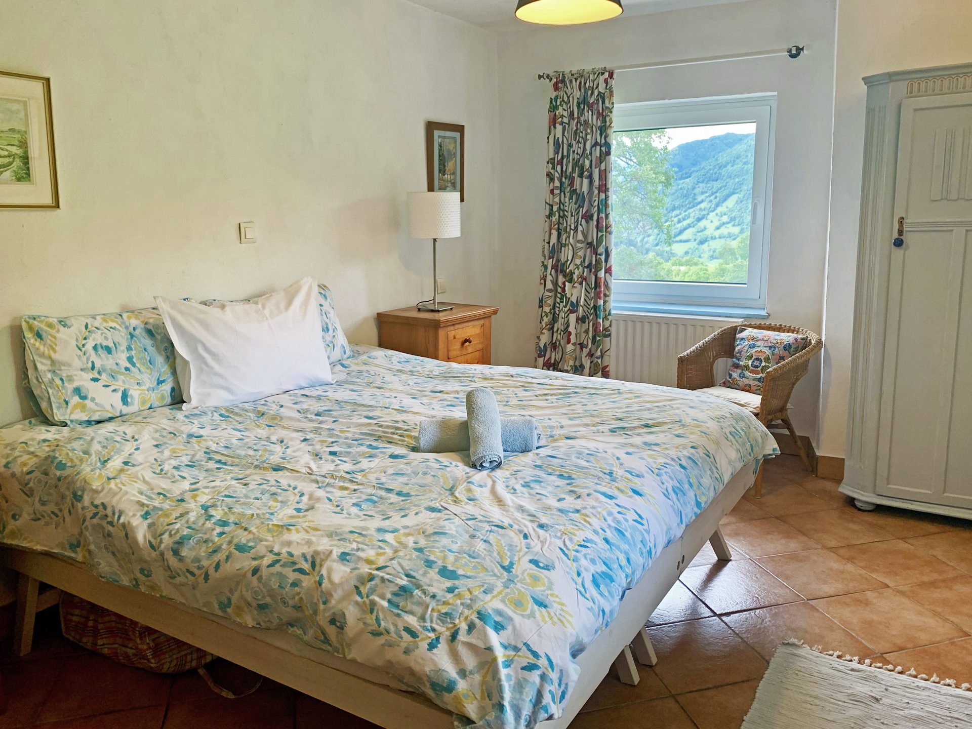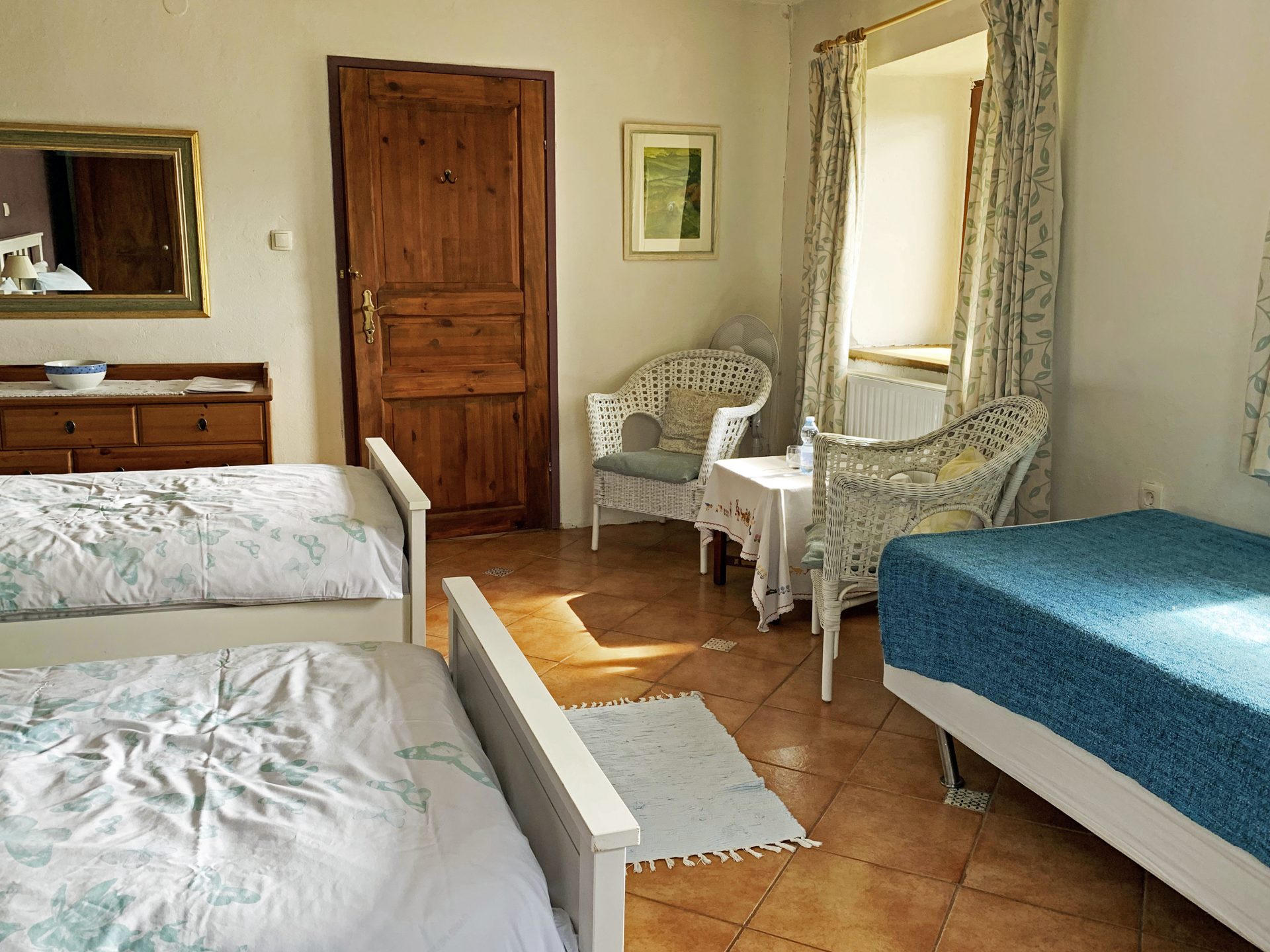 Sobe in kopalnice so prostorne, tri v glavni hiši so individualno oblikovane in opremljene z mislijo na udobje in sprostitev, z velikimi udobnimi posteljami in individualnimi umetninami na stenah. Skozi okna so pogledi na vrtove, travnike in gore idilični. V glavni hiši je udoben salon s TV, mizo za vezanje, za ustvarjanje ribiških muh in pečjo na drva, v našem glavnem salonu knjižna omara ali dve z veliko izbiro knjig in revij. Nekatere sobe za goste imajo mize za pisatelje na obisku in za tiste, ki morate še vedno ostati v stiku s pisarno.