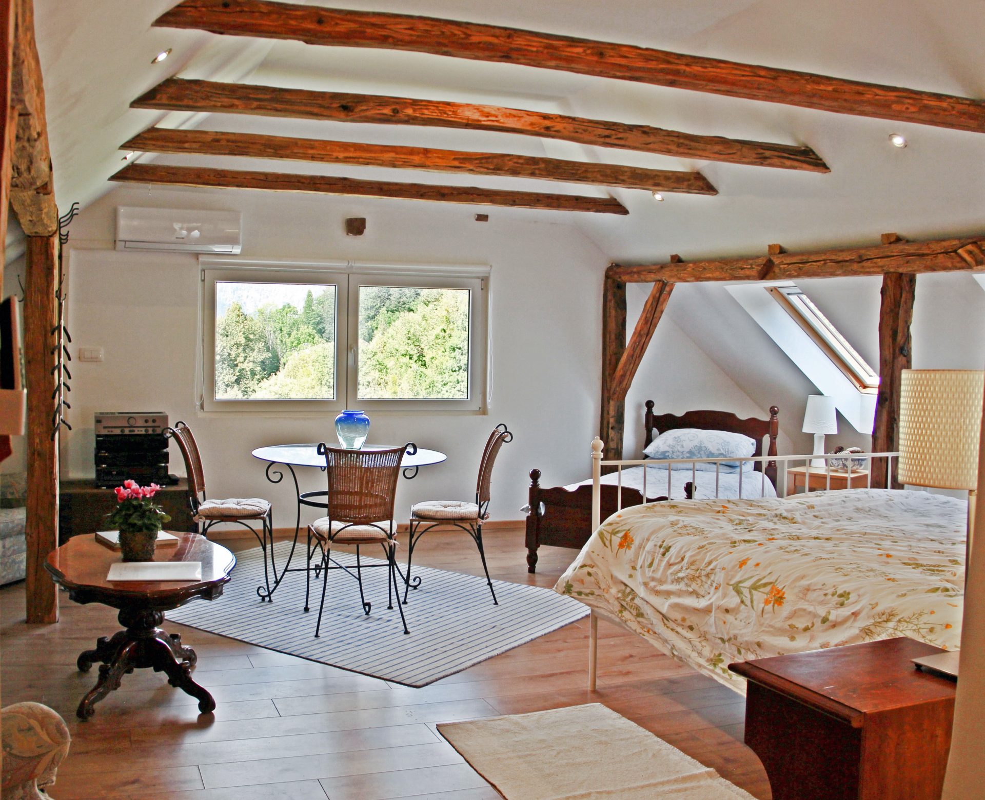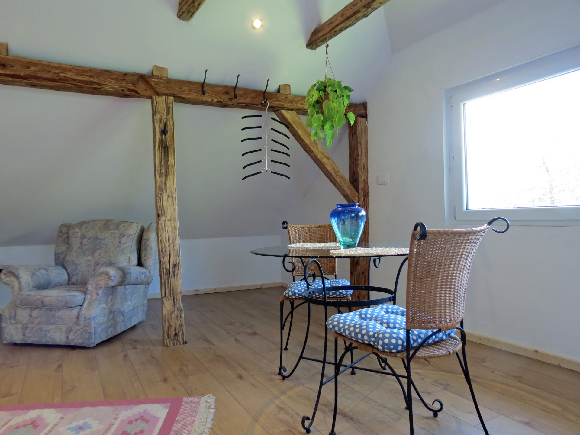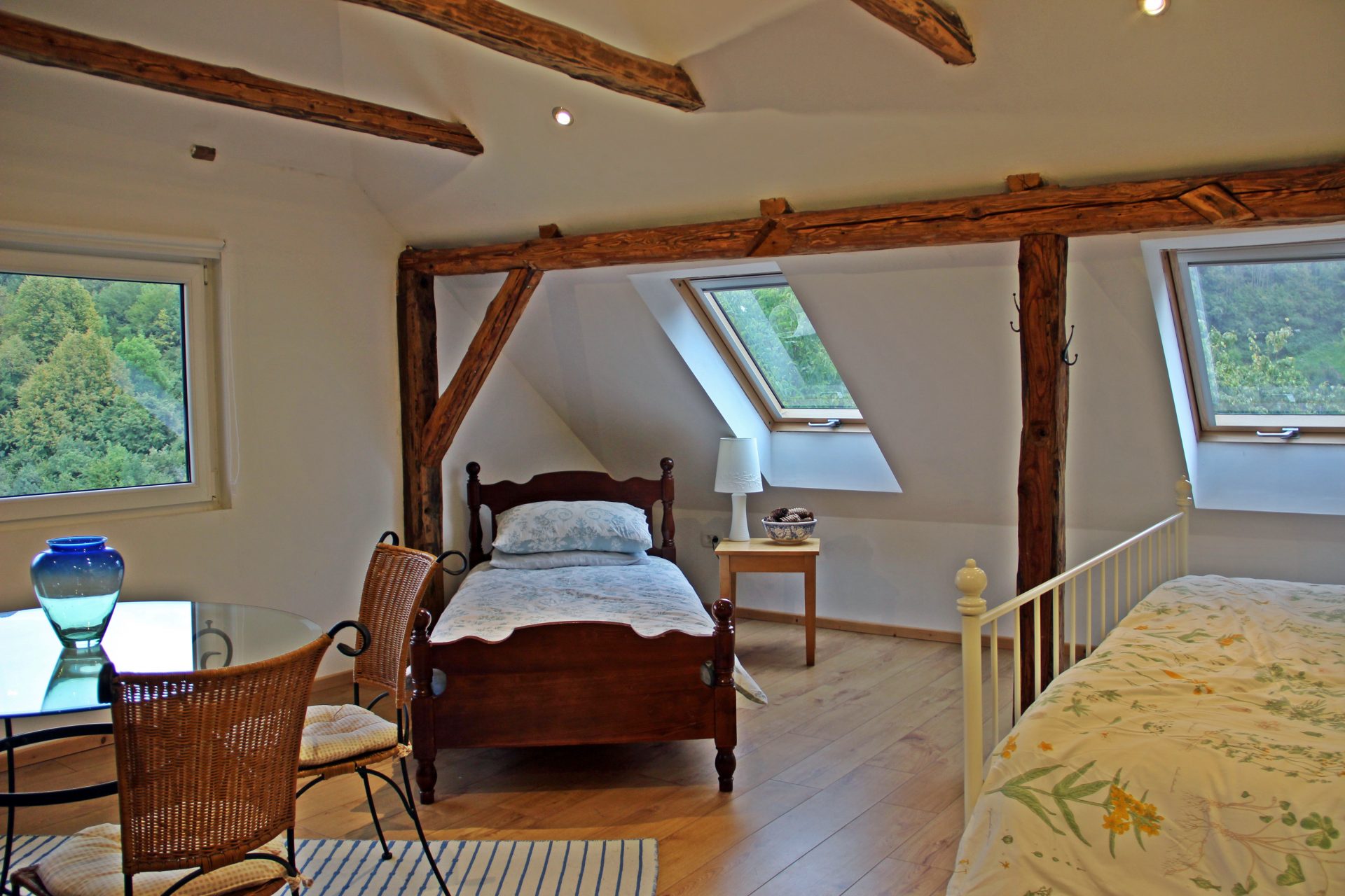 V zgornjem nadstropju je tudi prostoren 2-sobni apartma/stanovanje. Nahaja se visoko nad dolino Baca s čudovitim razgledom na Triglavski narodni park in goro Kobala. Glavna soba ima veliko zakonsko posteljo, enojno posteljo, majhno kuhinjo z mikrovalovno ploščo in hladilnikom, jedilno mizo in udobno dnevno sobo z najspektakularnejšim razgledom na Triglavski narodni park skozi veliko slikovno okno. Majhen hodnik vodi do sobe z enojnima posteljama, ki ponuja pisalno mizo in pogled na strešno okno na vrtove in čudovito gozdnato območje takoj za njim. Na voljo je sodobna kopalnica z veliko kabino za prhanje. Ta prostor je samostojen in ima zasebni vhod. Povsod je opremljeno po zelo visokem standardu s prednostjo tihe klimatske naprave in toplotne črpalke. Toplo vodo zagotavlja sončna energija. Podstrešje je veliko, svetlo in z razgledi, ki preprosto vzamejo dih!