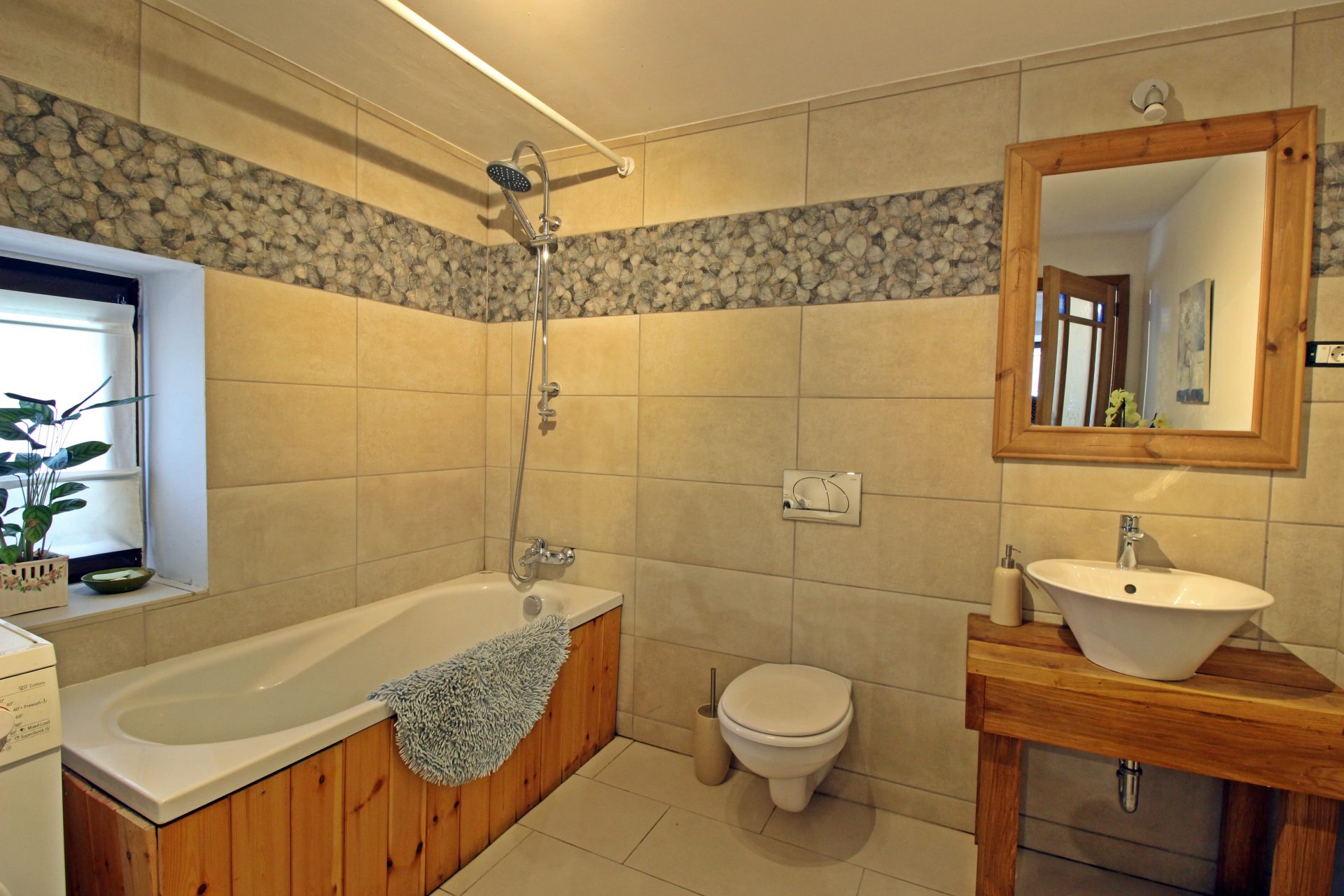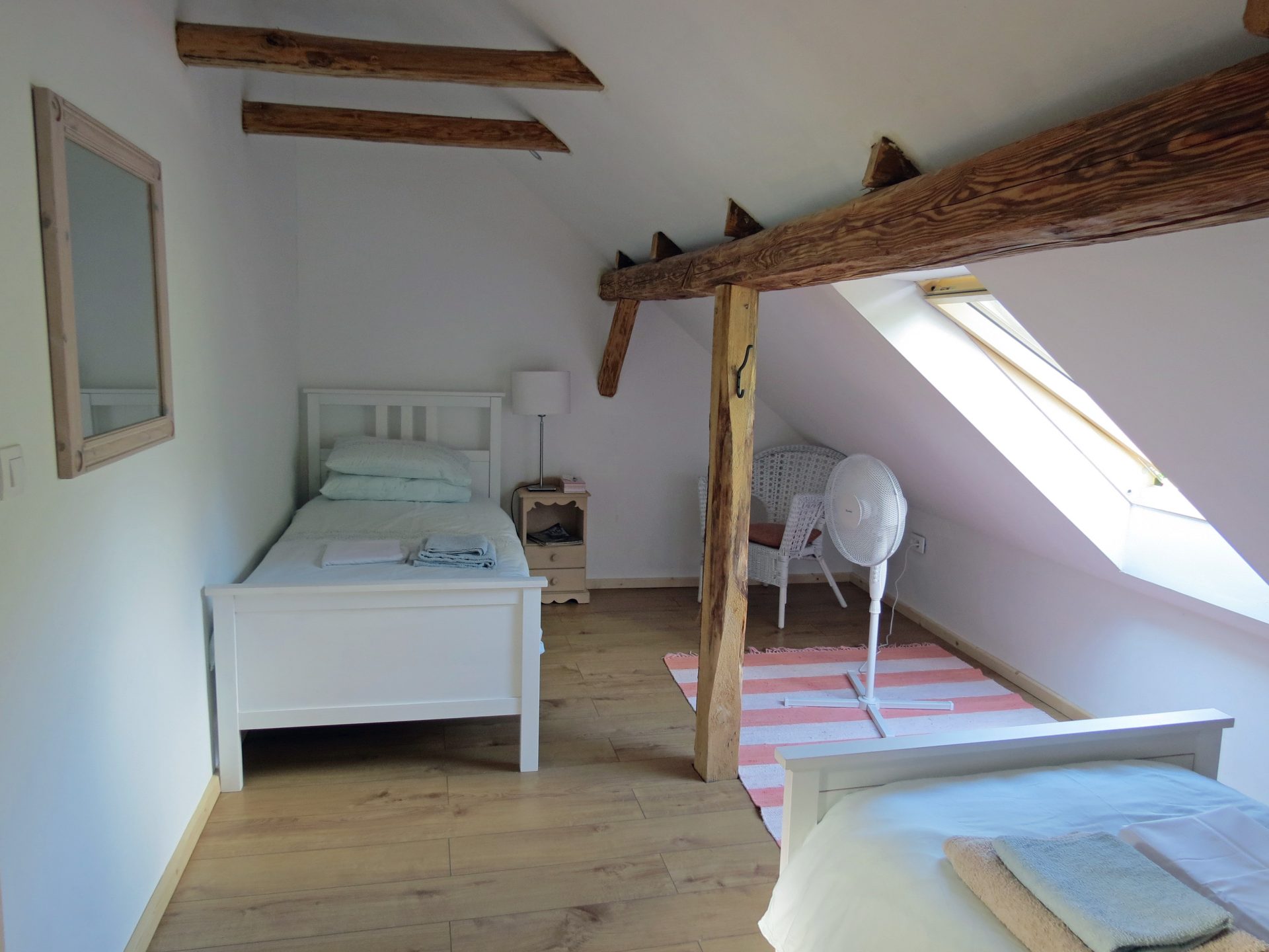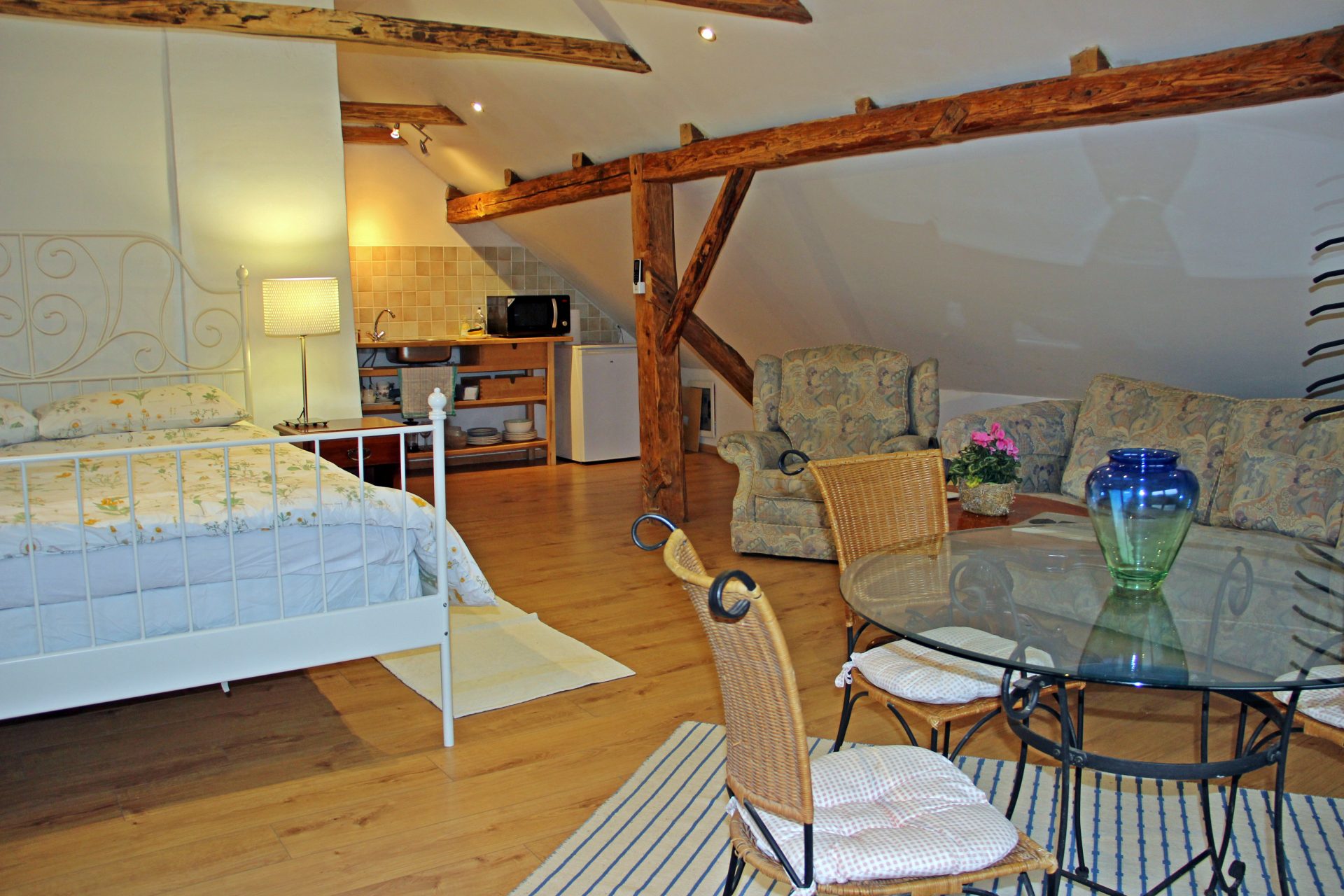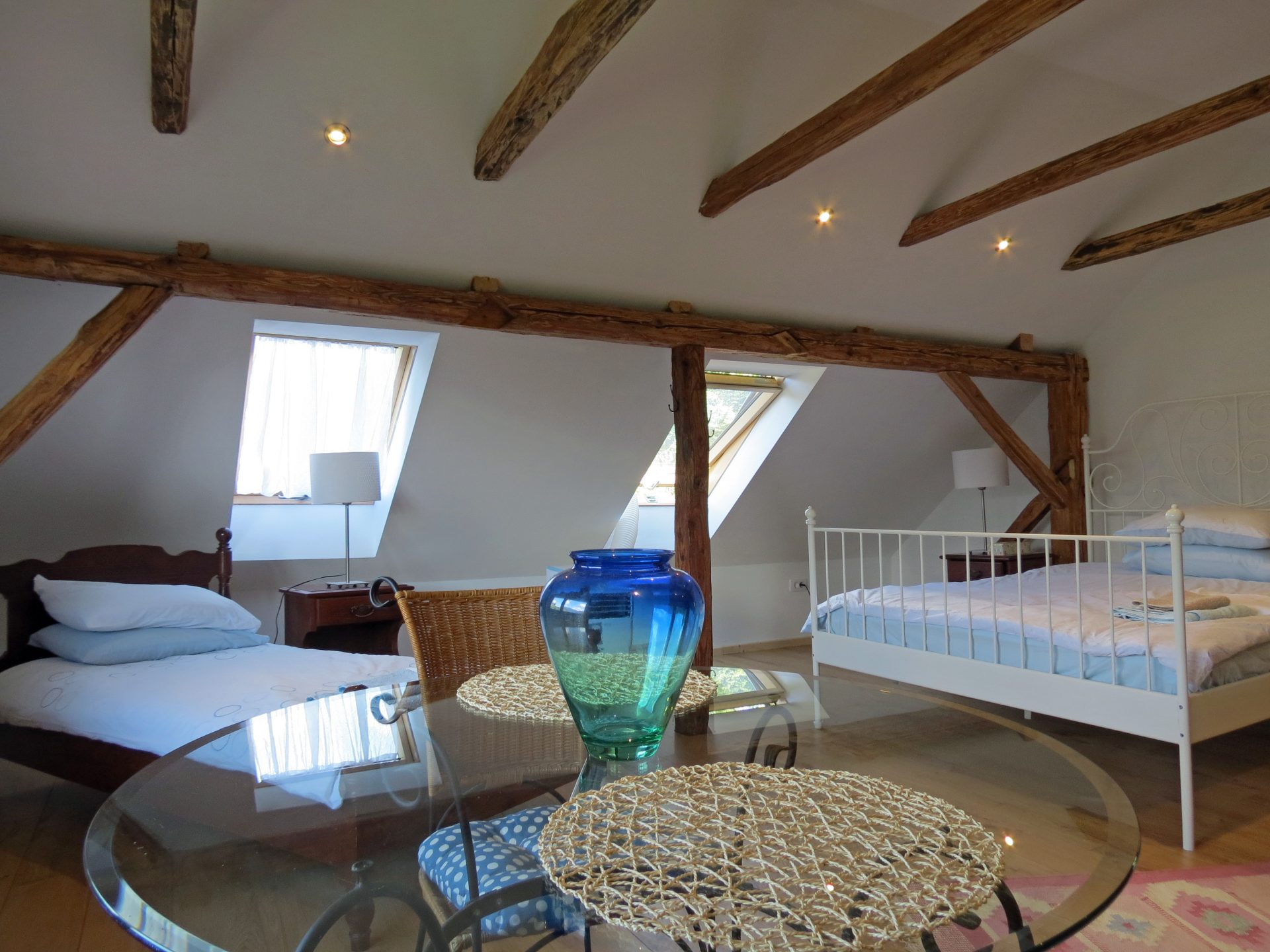 V zgornjem nadstropju je tudi prostoren 2-sobni apartma/stanovanje. Nahaja se visoko nad dolino Baca s čudovitim razgledom na Triglavski narodni park in goro Kobala. Glavna soba ima veliko zakonsko posteljo, enojno posteljo, majhno kuhinjo z mikrovalovno ploščo in hladilnikom, jedilno mizo in udobno dnevno sobo z najspektakularnejšim razgledom na Triglavski narodni park skozi veliko slikovno okno. Majhen hodnik vodi do sobe z enojnima posteljama, ki ponuja pisalno mizo in pogled na strešno okno na vrtove in čudovito gozdnato območje takoj za njim. Na voljo je sodobna kopalnica z veliko kabino za prhanje. Ta prostor je samostojen in ima zasebni vhod. Povsod je opremljeno po zelo visokem standardu s prednostjo tihe klimatske naprave in toplotne črpalke. Toplo vodo zagotavlja sončna energija. Podstrešje je veliko, svetlo in z razgledi, ki preprosto vzamejo dih!