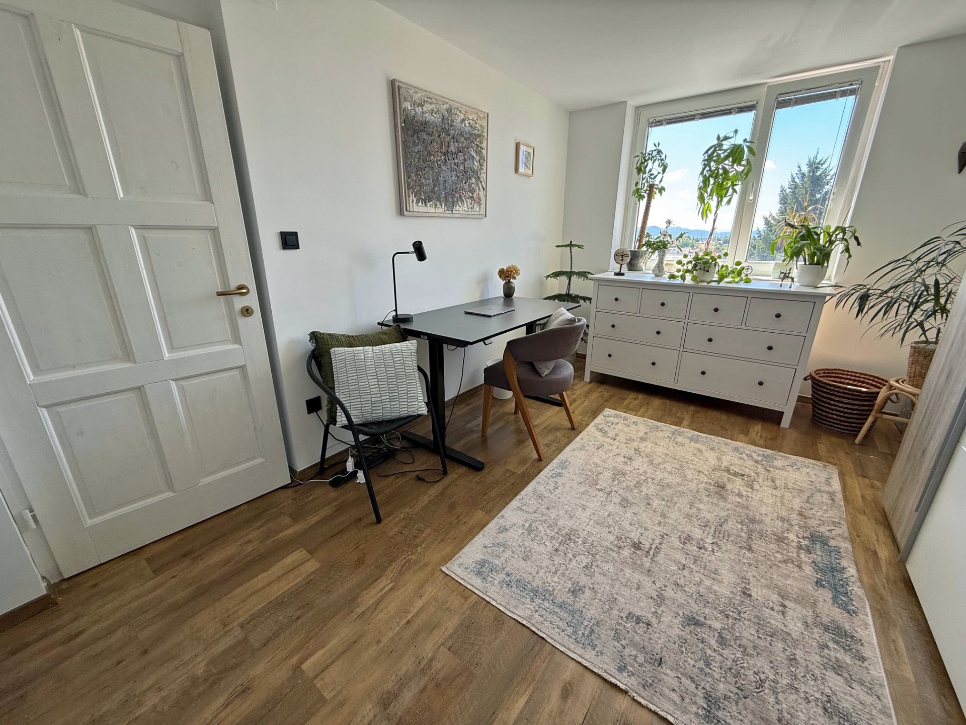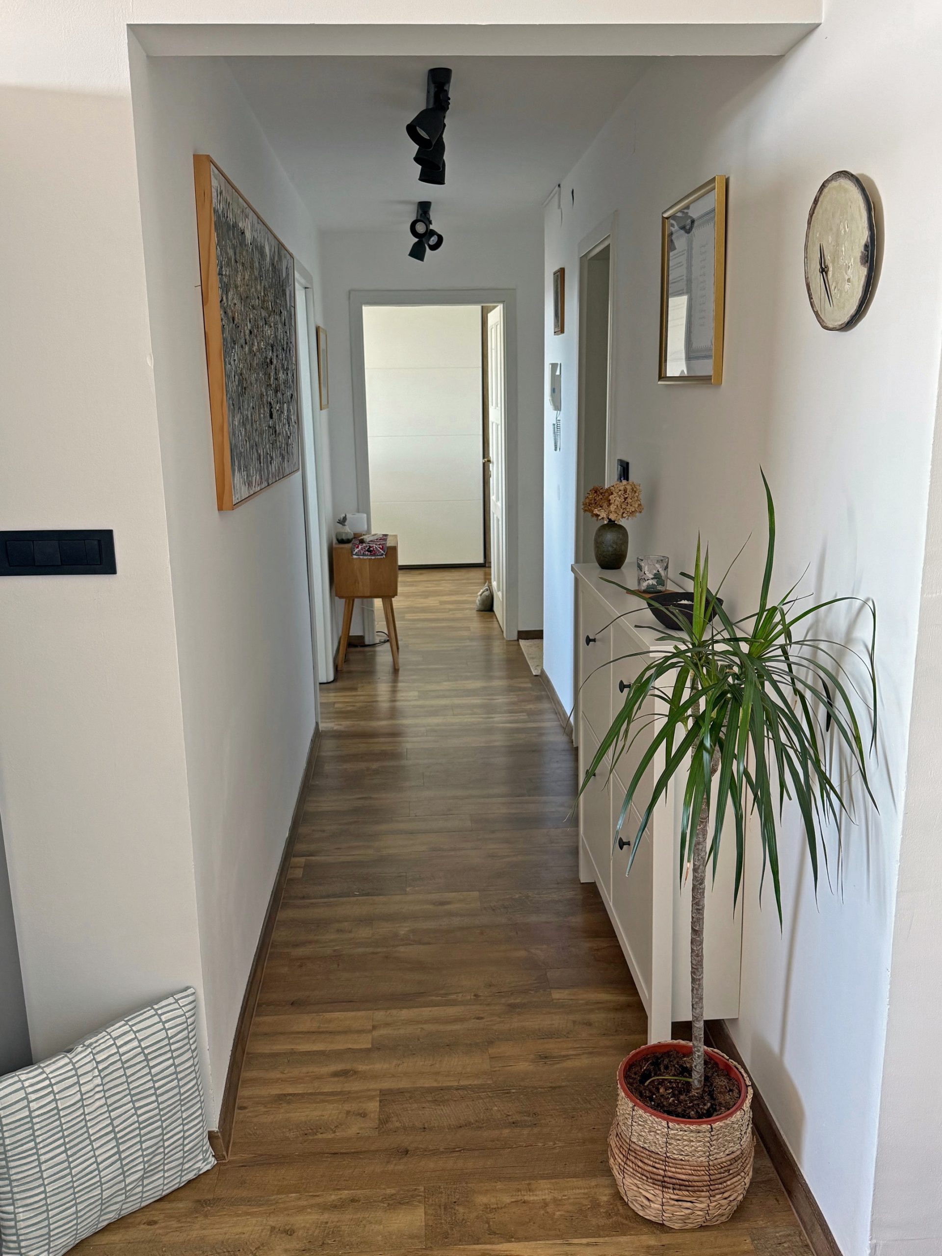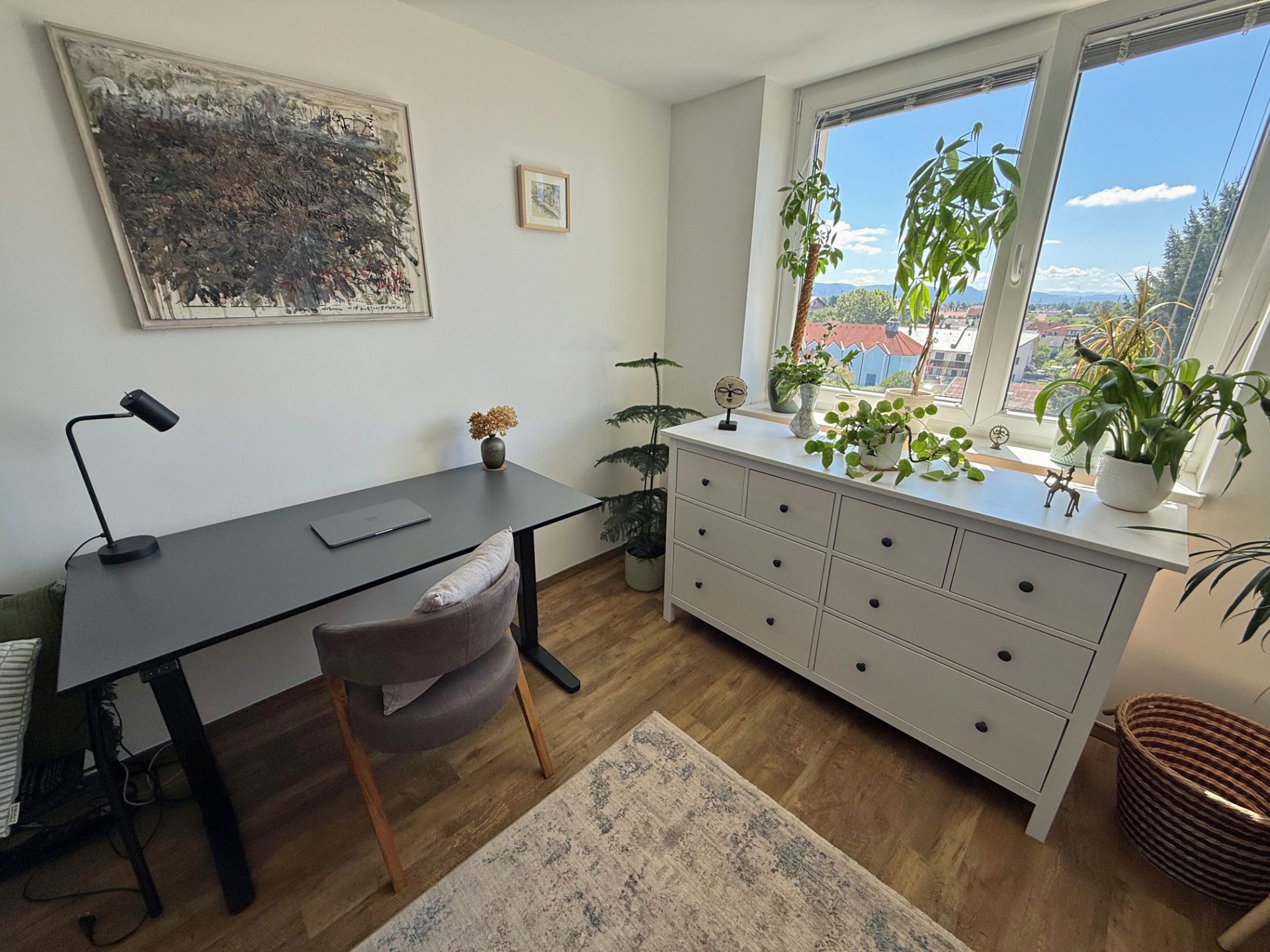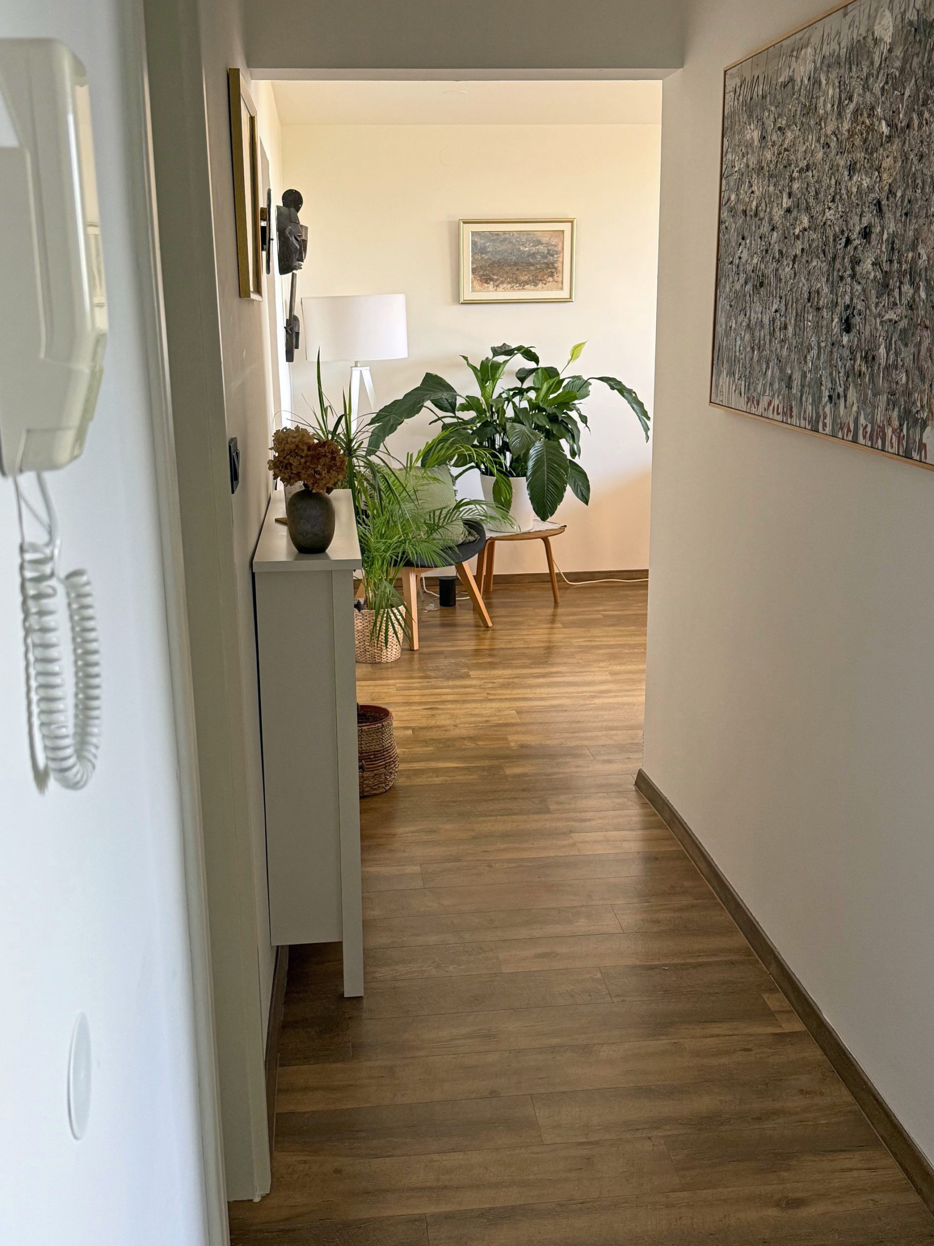 Stanovanje obsega hodnik, kopalnico, odprt dnevno-bivalni prostor z jedilnico, kuhinjo in sončen balkon, obrnjen na jug in drugi proti vzhodu. Na voljo sta dve spalnici, ena trenutno uporabljena kot pisarna.