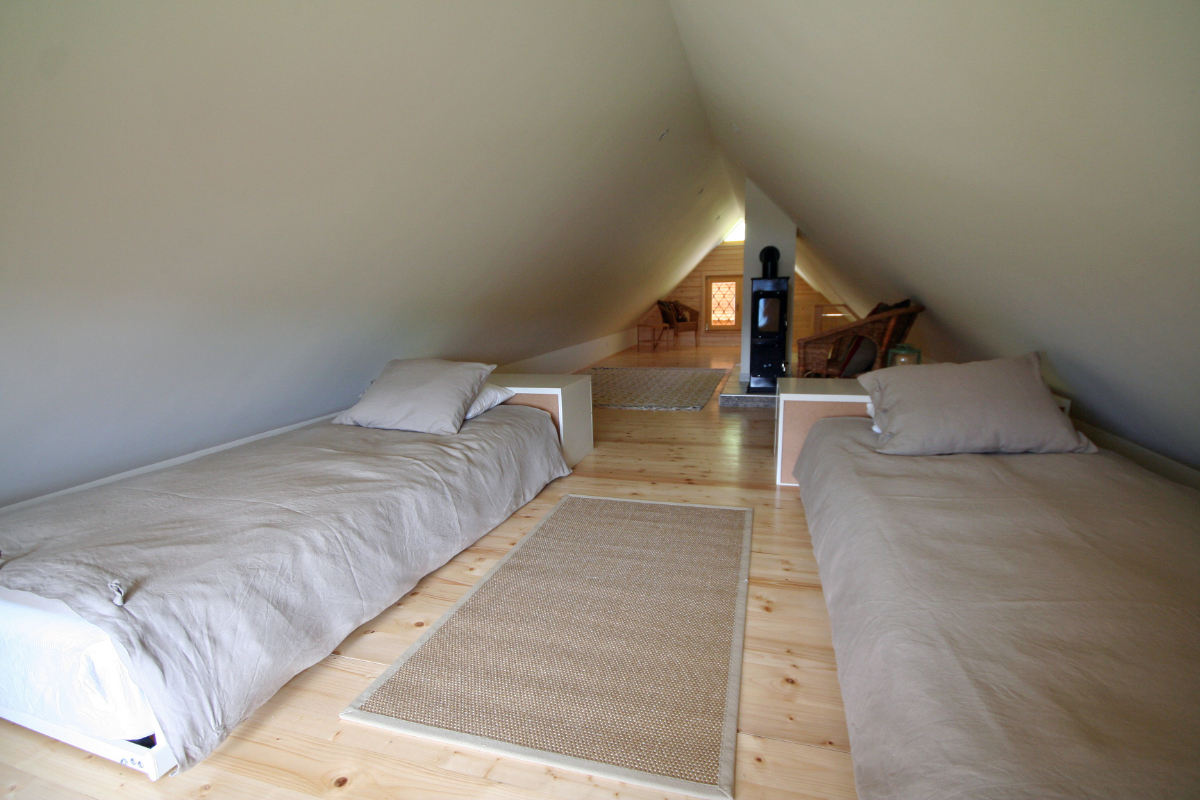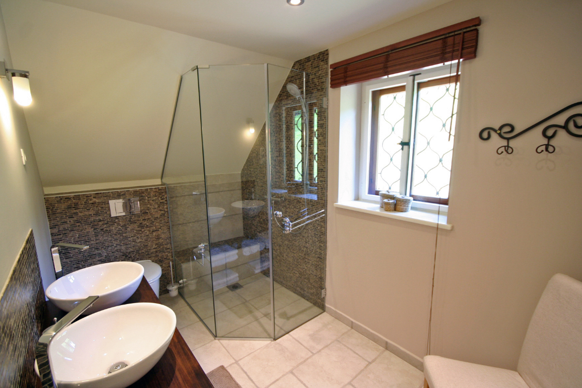 Vse spalnice so individualno opremljene z lepimi tkaninami in čudovito posteljnino. Prav tako se ponašajo s čudovitim razgledom na vrtove in okoliške gore.V zgornjem nadstropju je elegantna mansardna spalnica z najlepšim razgledom v hiši. Tu so še 3 spalnice (2 z zakonsko posteljo in ena z 2 enojnima posteljama) ter skupna kopalnica.