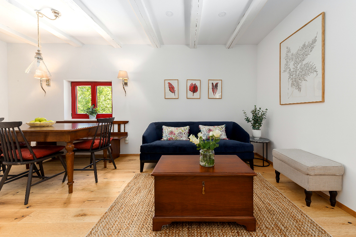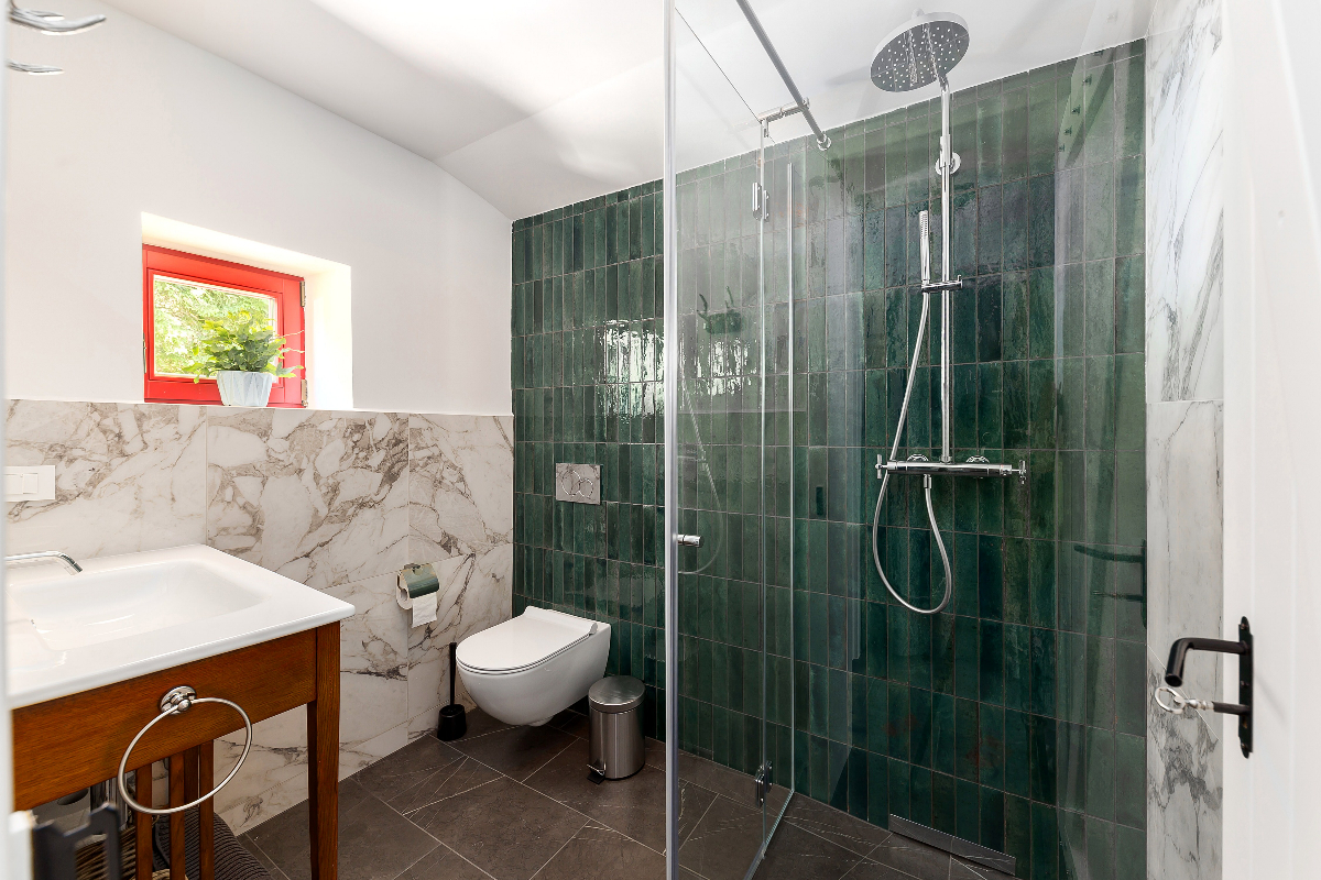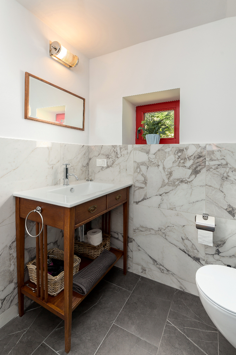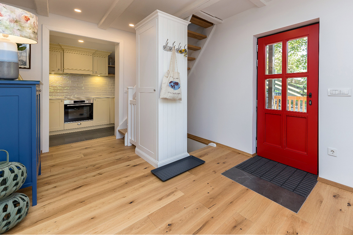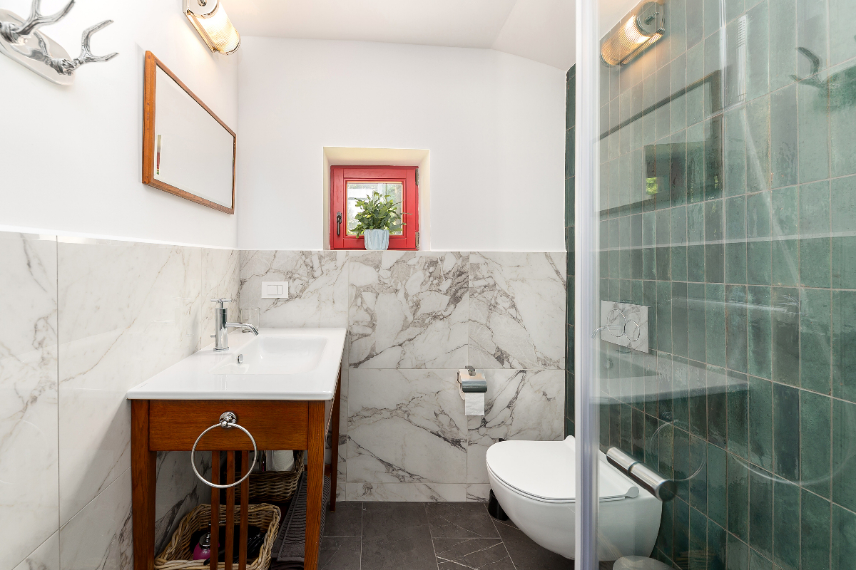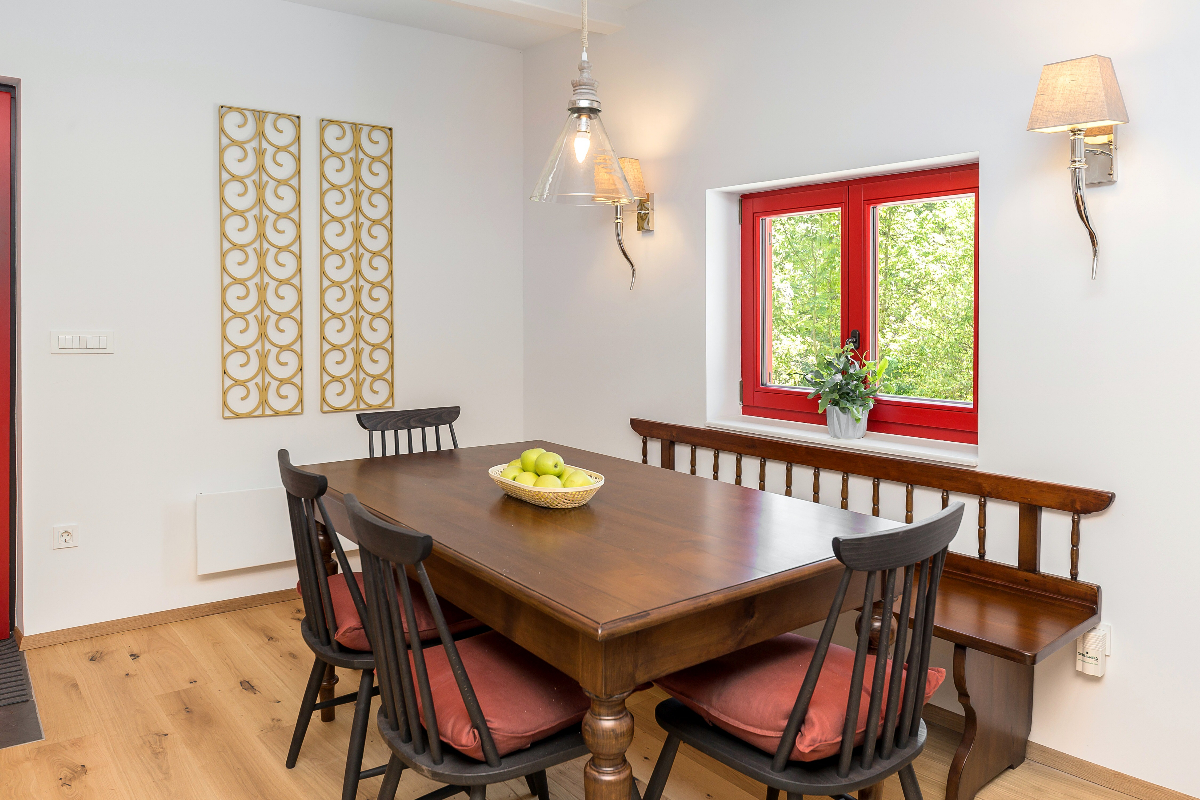 Popolnoma opremljena kuhinja v podeželskem slogu in kopalniva z dodatnim straniščem.