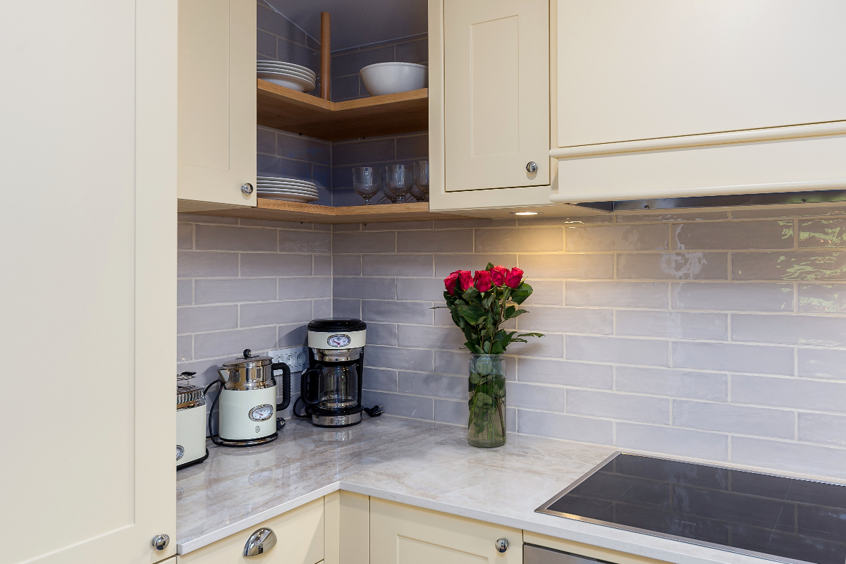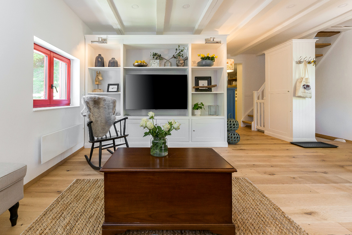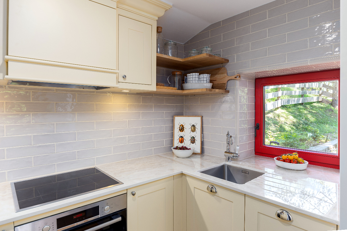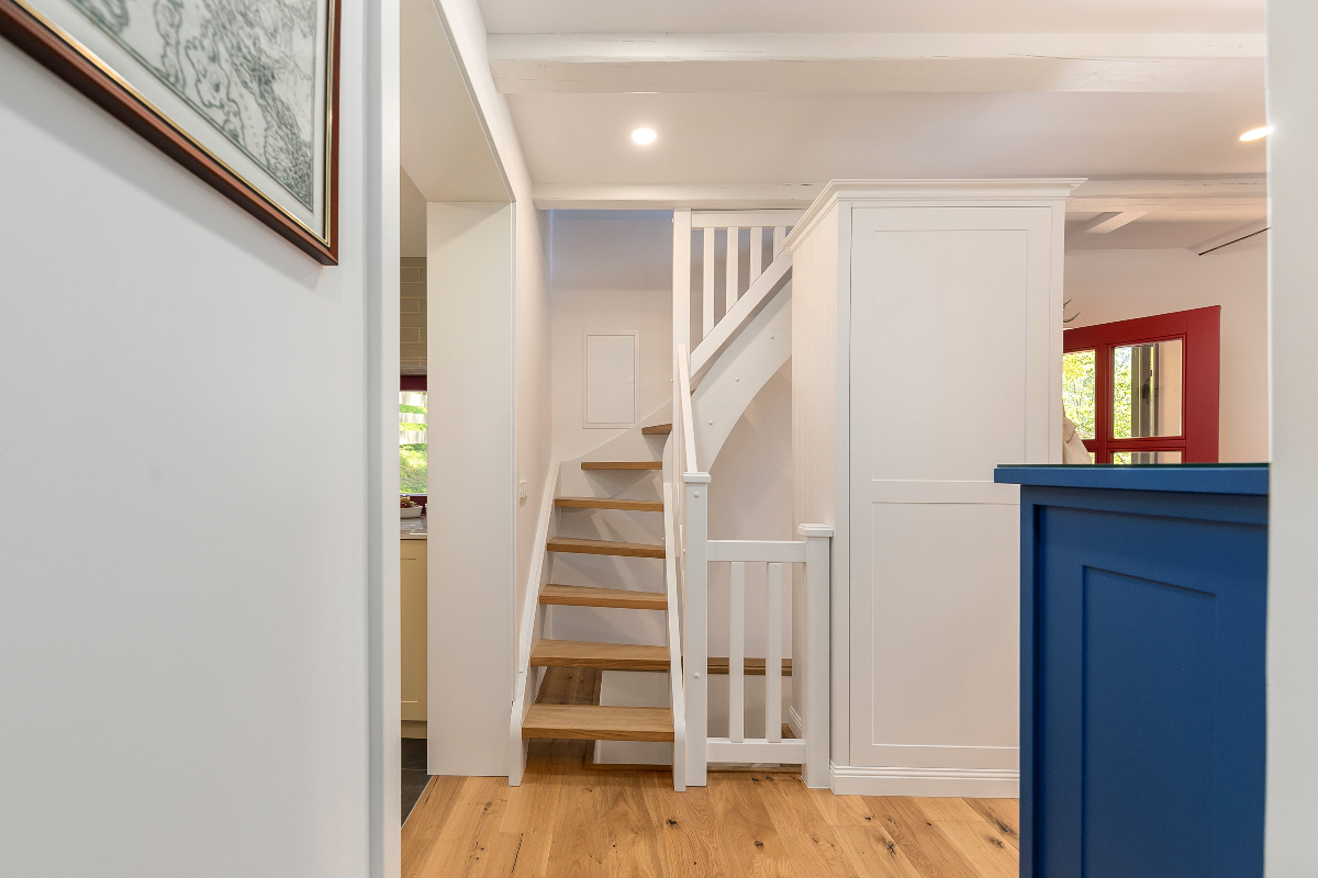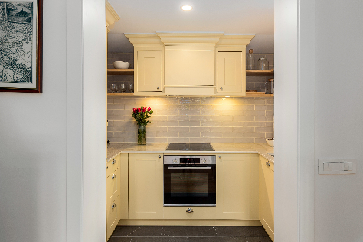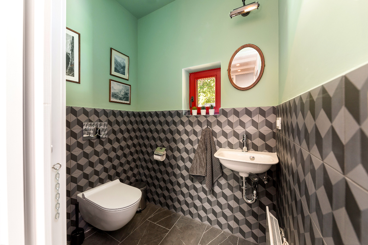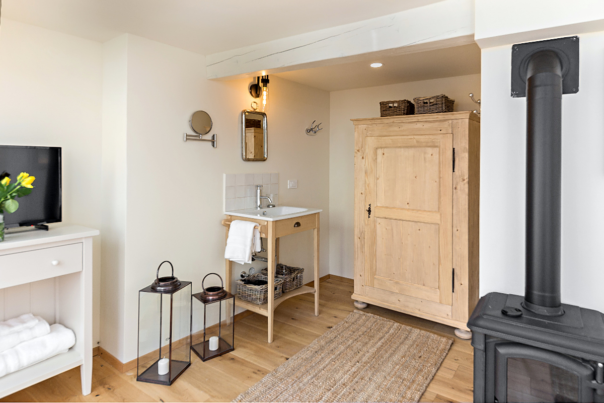 Popolnoma opremljena kuhinja v podeželskem slogu in kopalniva z dodatnim straniščem.