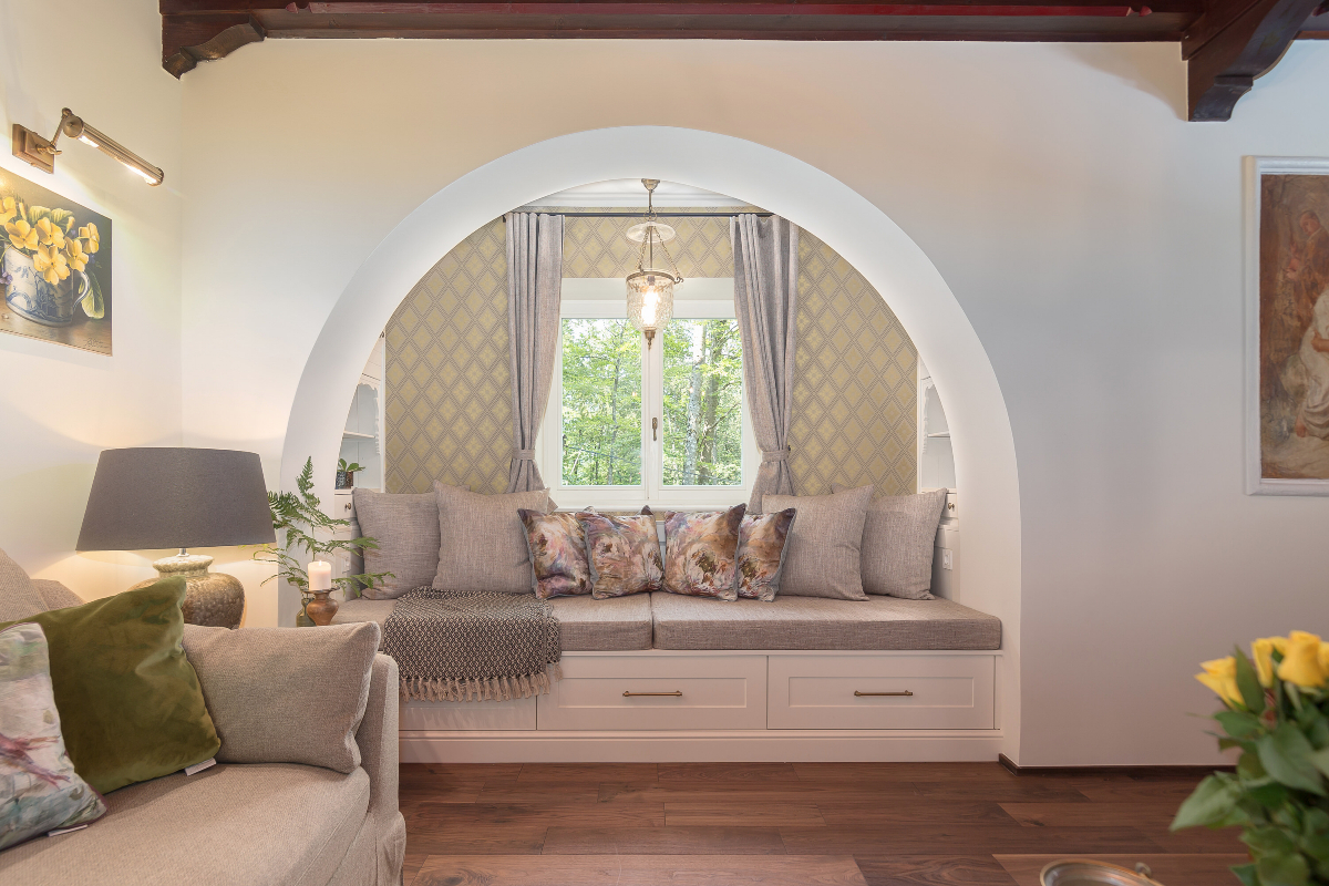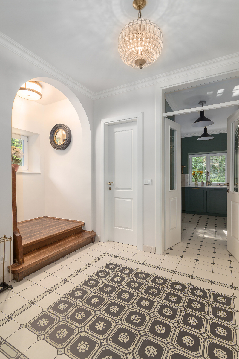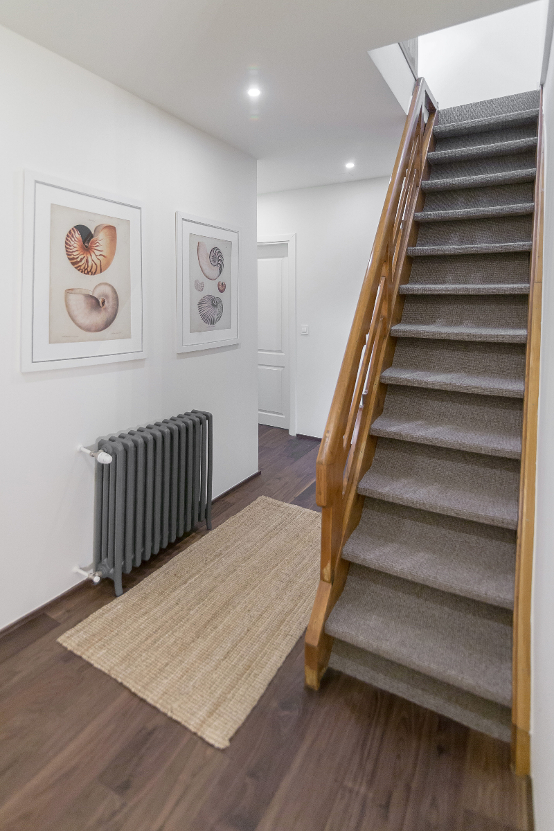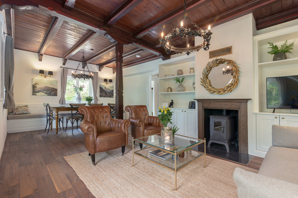 V pritličju je čudovit dnevni in jedilni prostor z originalnimi stropi in kaminom.