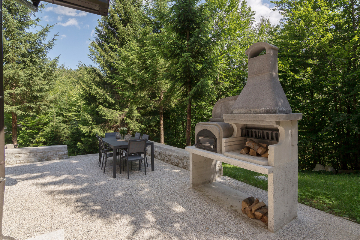 Zunaj je na voljo velik prostor za žar in peč za peko kruha/pizze. Jedilna miza za 10 oseb in prostor za sproščanje s pogledom na vrt in gozdove.