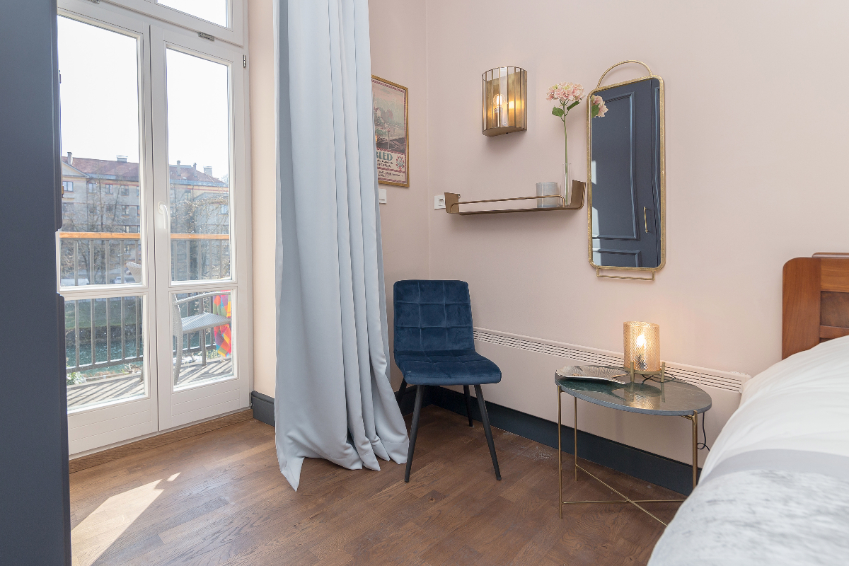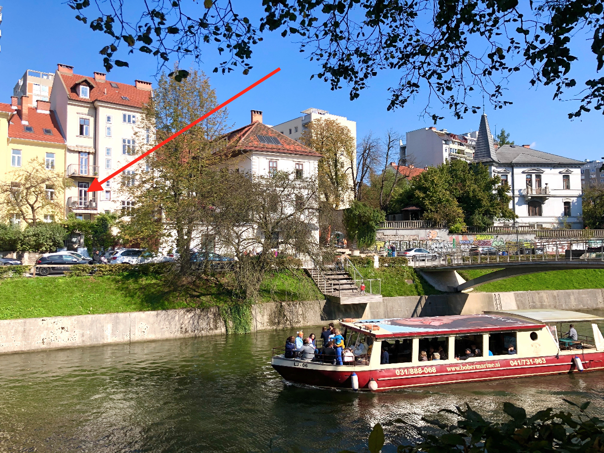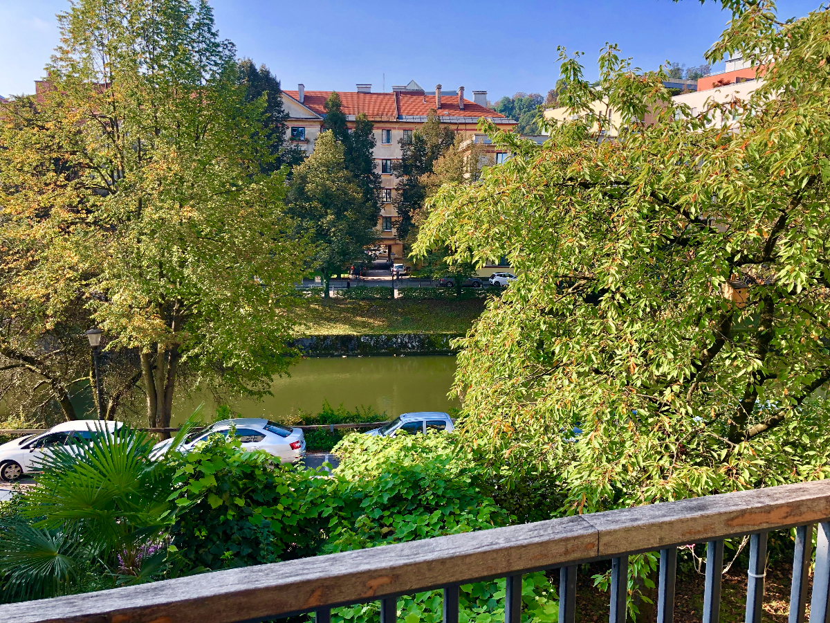 Balkon s pogledom na reko in vrt. Možnost parkiranja v bližini, zagotovili bomo podroben zemljevid vseh parkirnih možnosti v okolici, ulično parkiranje le 0,70 EUR na uro in brezplačno od popoldnevih ob sobotah in nedeljah. Ali pa varno podzemno parkirišče tik nad mostom za pešce čez reko.