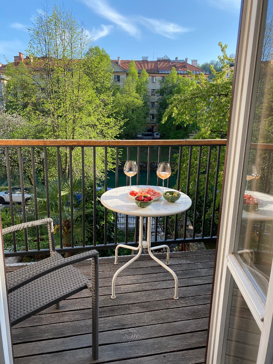 Center Ljubljane, pogled na reko, balkon in kolesa