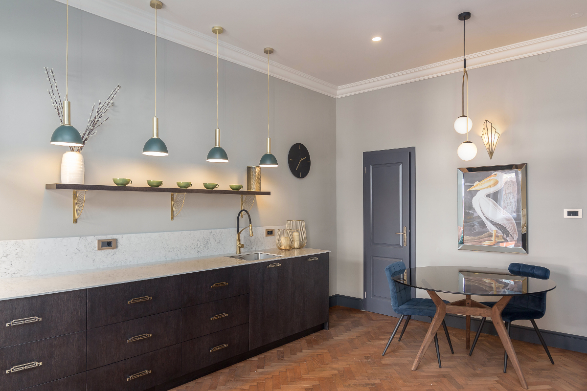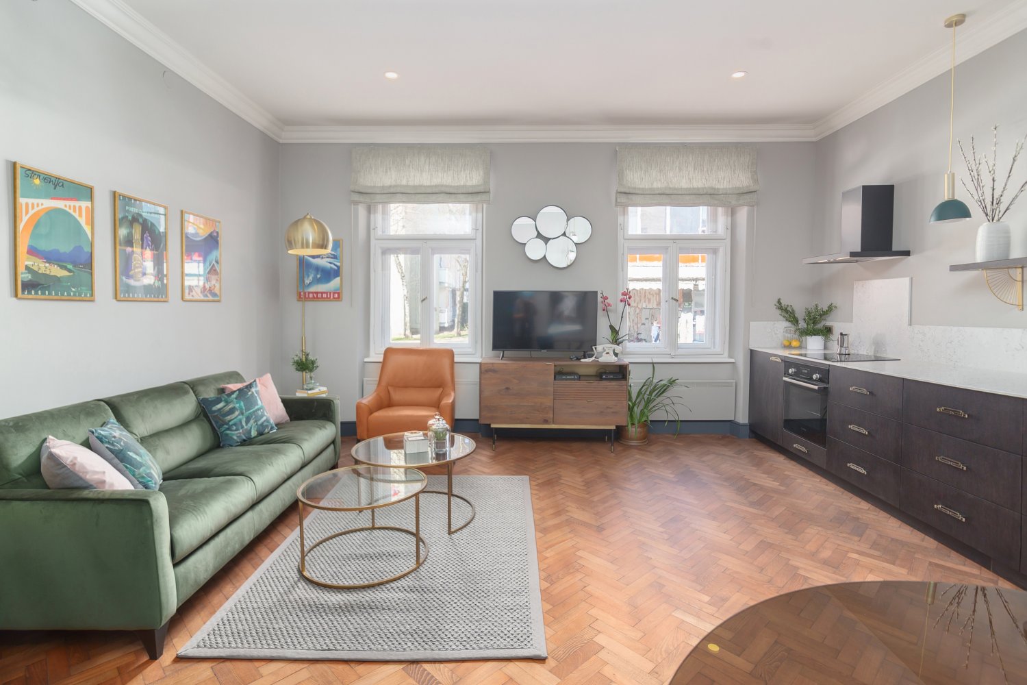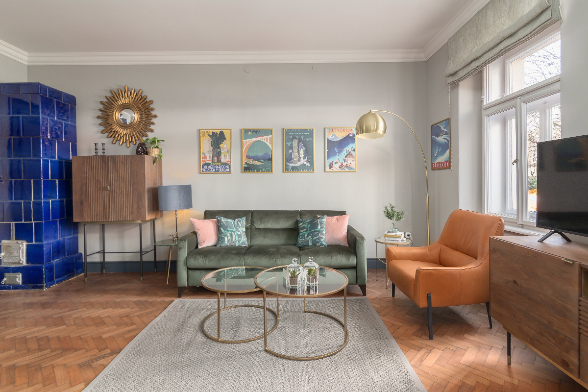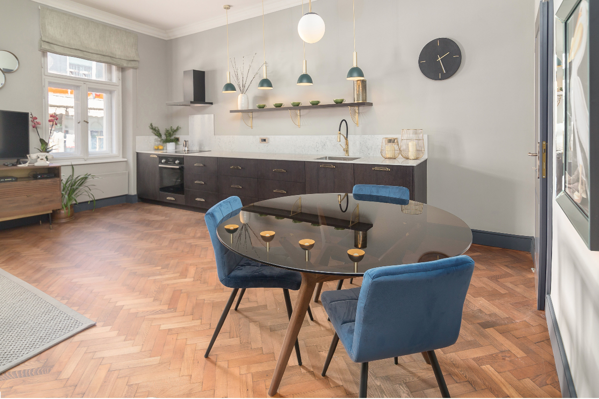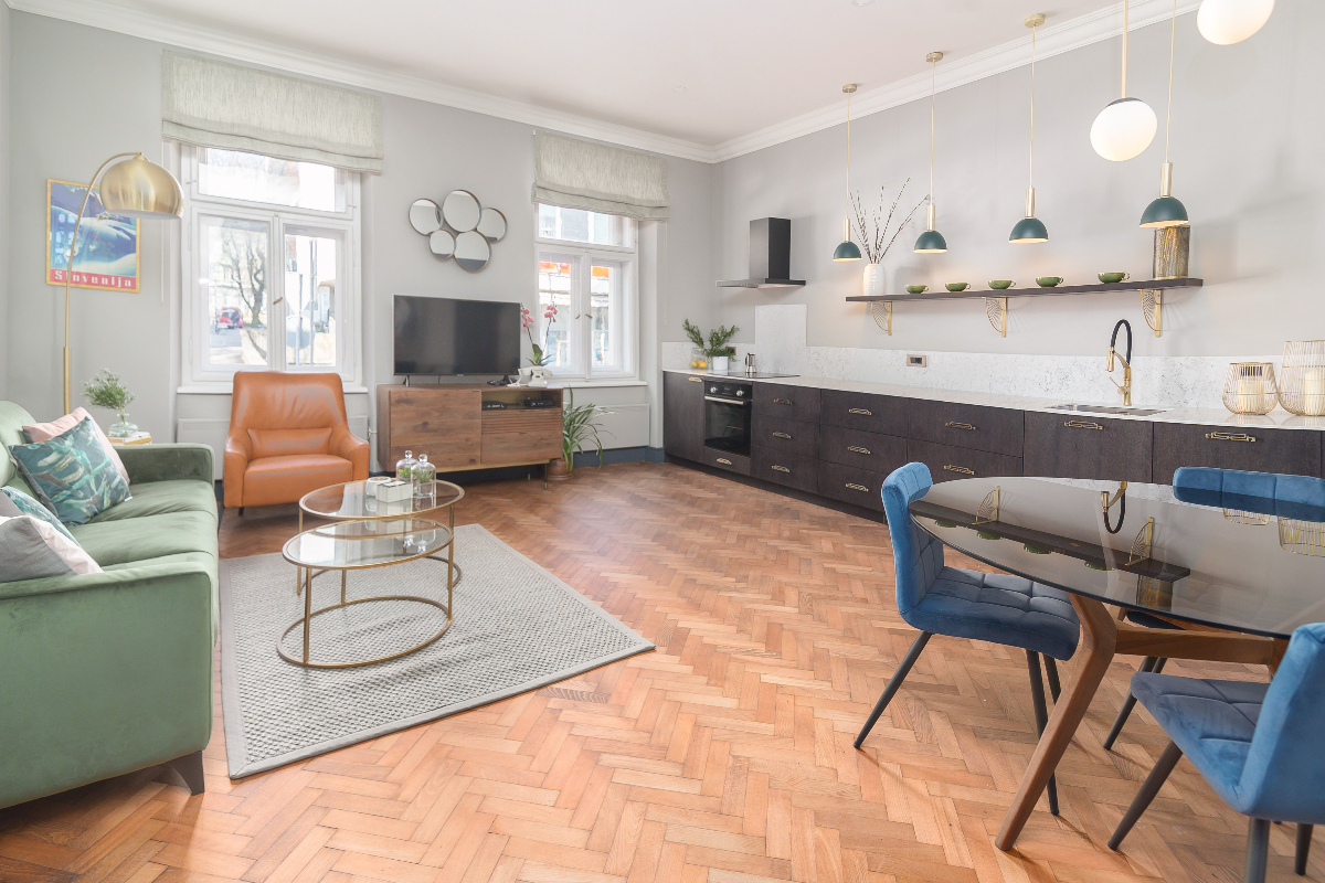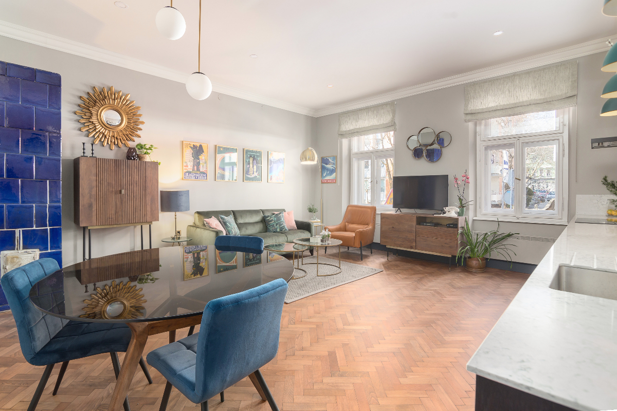 Klimatizirano stanovanje ima odprt dnevni prostor s popolnoma opremljeno kuhinjo, kavnim aparatom, pomivalnim strojem, sokovnikom itd. Raztegljiv kavč je vrhunske kakovosti z luksuznim ležiščem za dodatno udobje. V spalnici je velika zakonska postelja z visokokakovostnim ležiščem in posteljnino iz egiptovskega bombaža vrhunske kakovosti (White Company), spalnica je klimatizirana in ima balkon s pogledom na reko. V spalnici je tudi televizor.