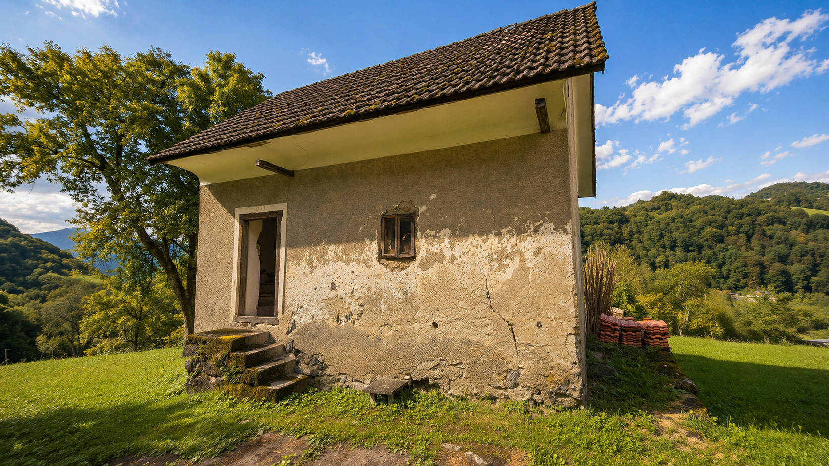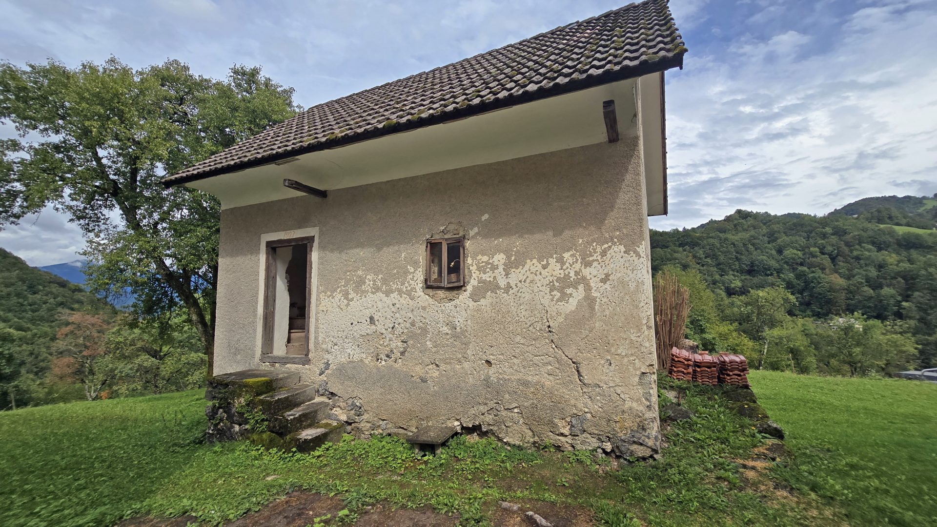- Manjša hiša (potrebna obnove) s hodnikom, stopniščem, enim prostorom, neizdelano mansardo ter podkleteno kletjo