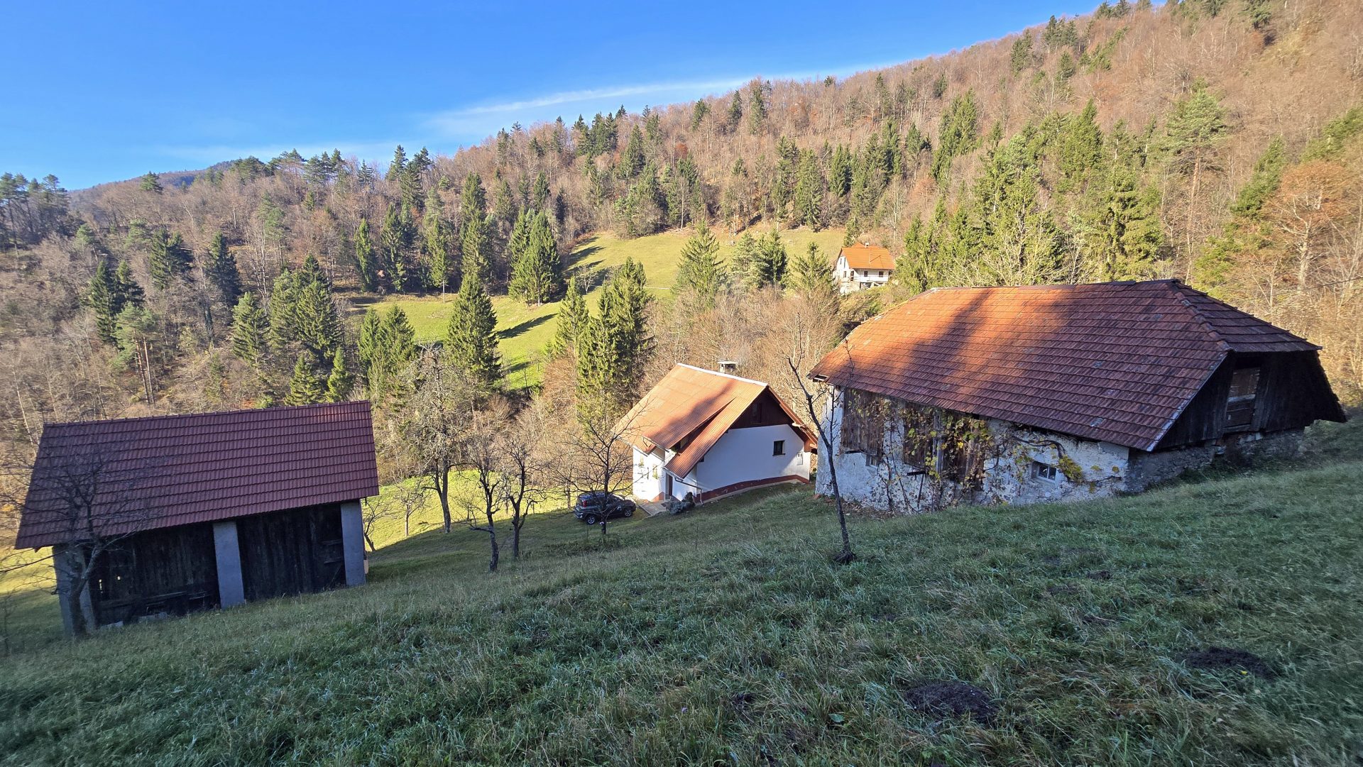Okoli hiše je nekaj ravnega zemljišča, preostali del posestva pa sestavljajo čudoviti travniki in gozdovi, ki ponujajo popoln stik z naravo ter čudovite razglede na okoliške hribe in travnike.