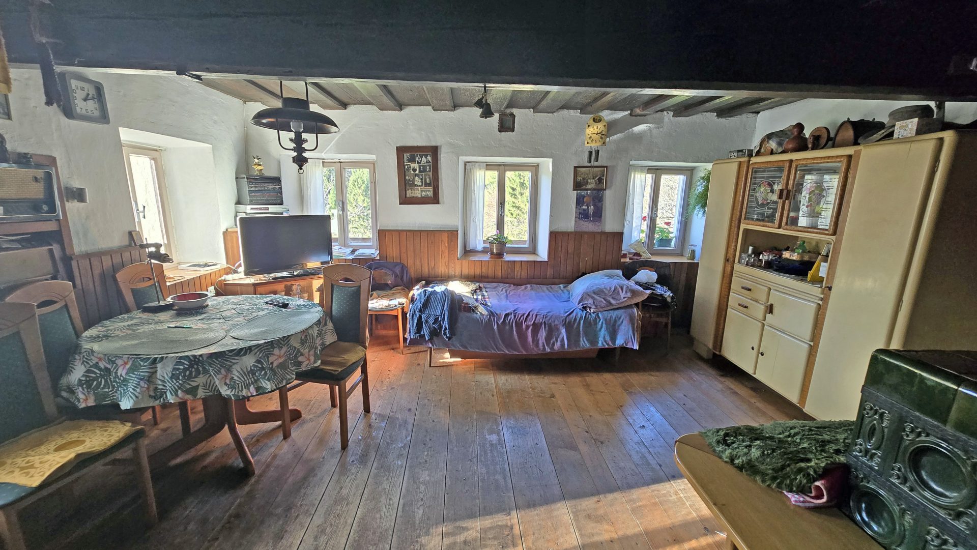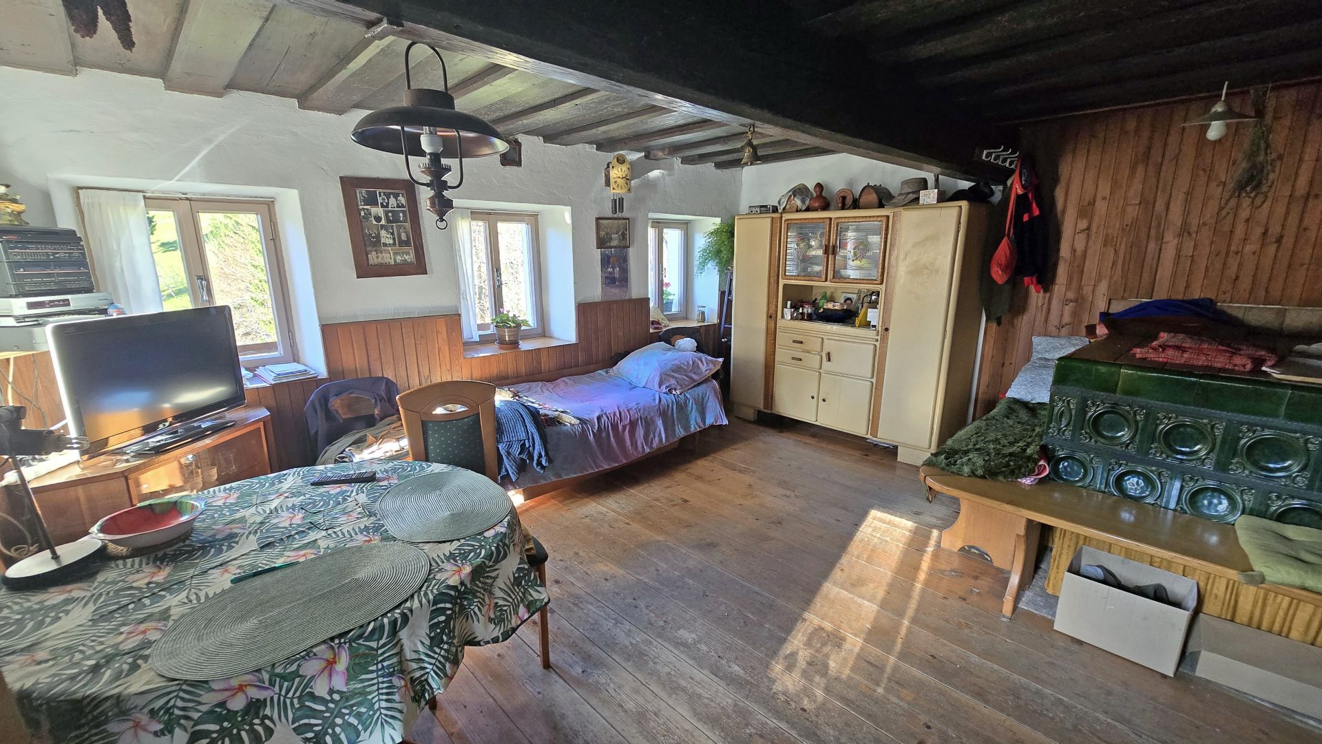 V pritličju se nahajajo hodnik, kuhinja z jedilnico, kopalnica ter prostorna dnevna soba z lončeno pečjo, ki ustvarja prijeten domač ambient.