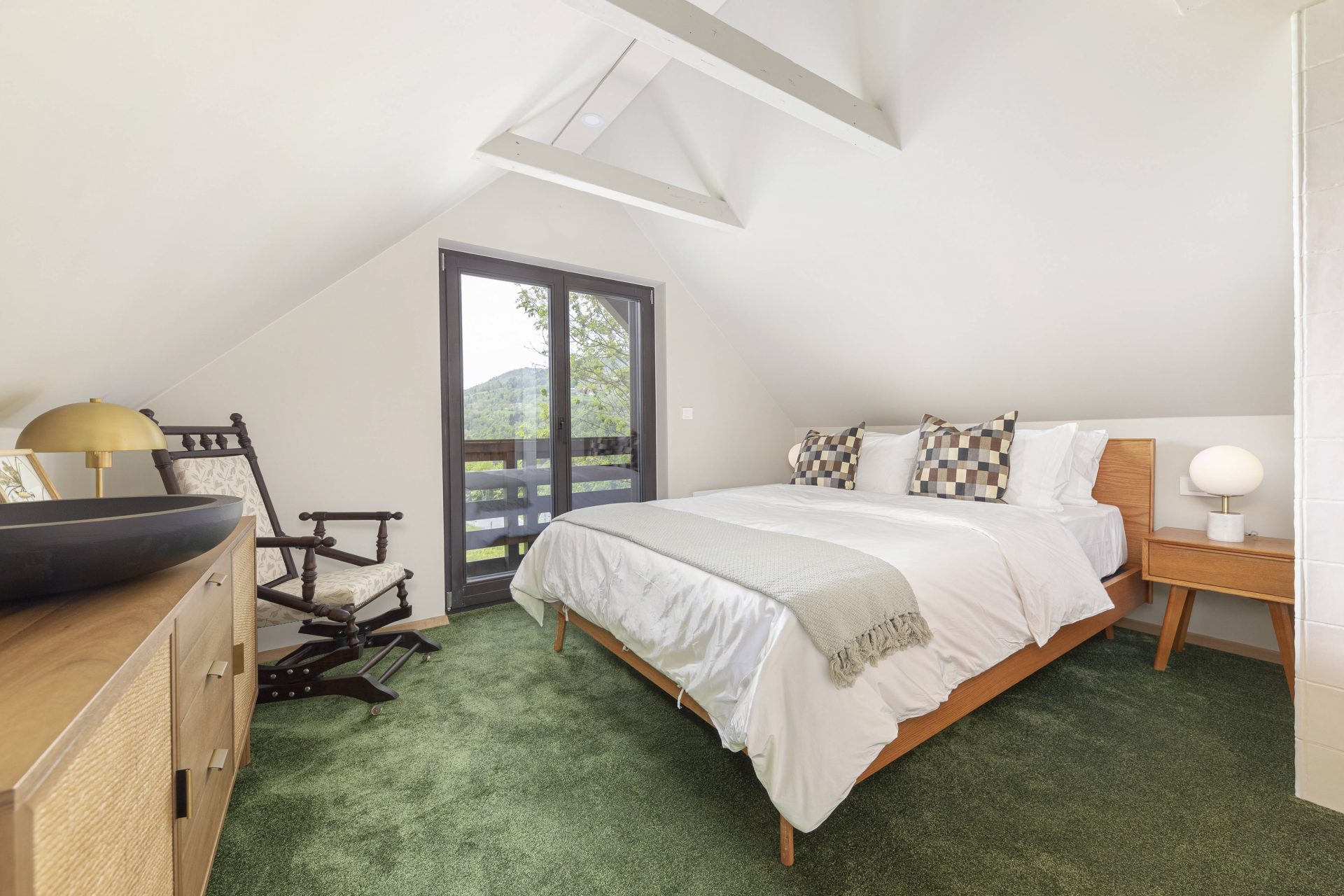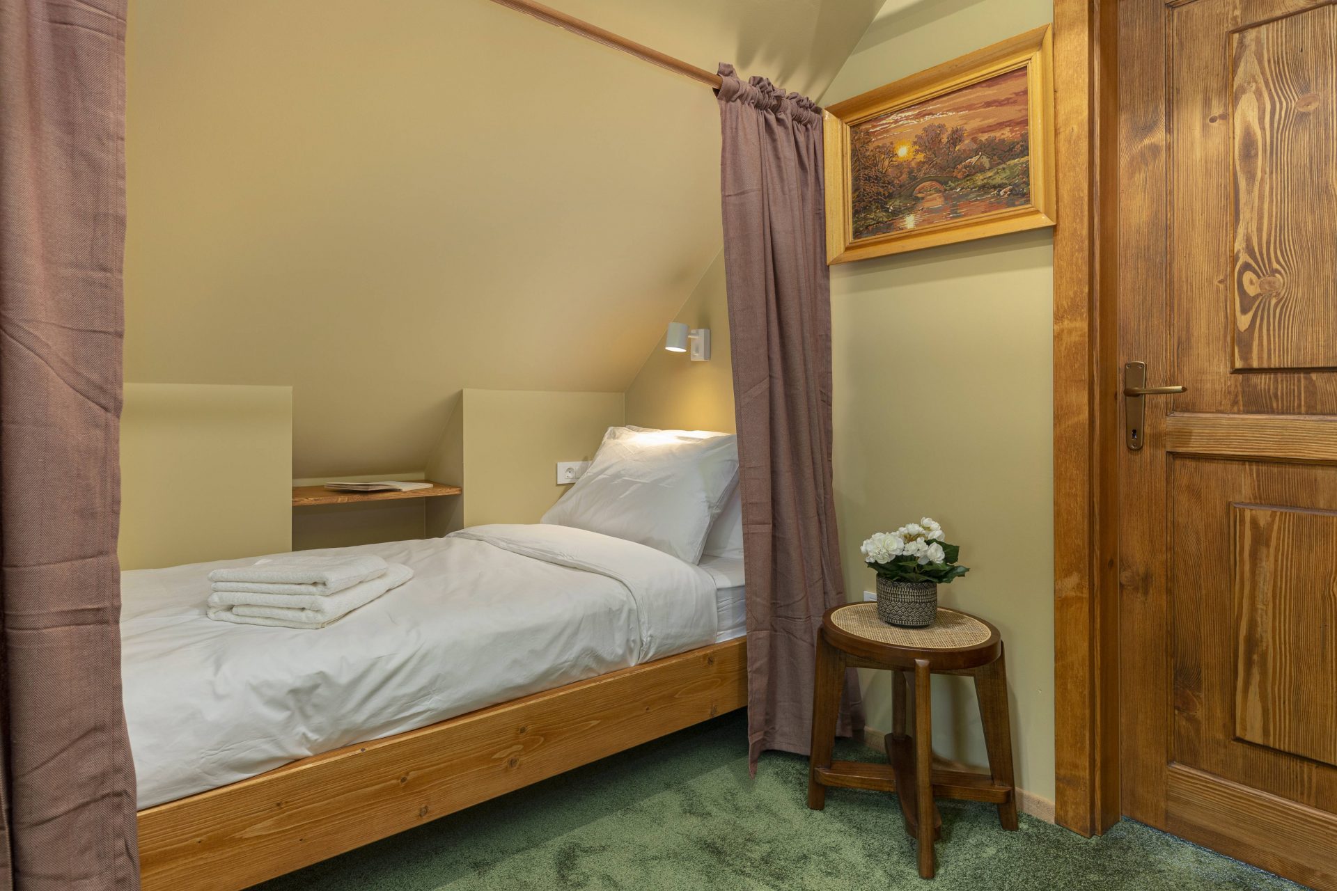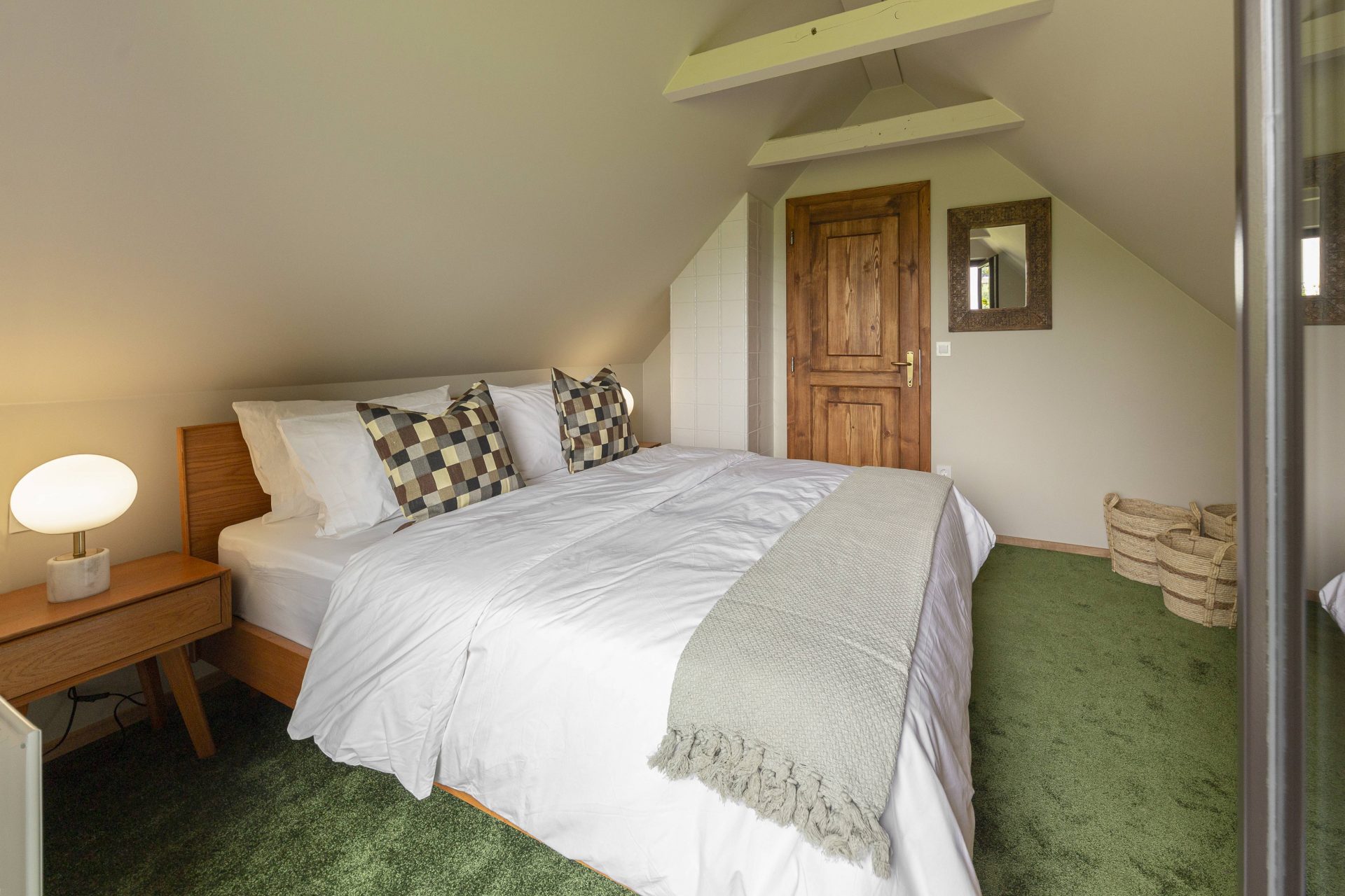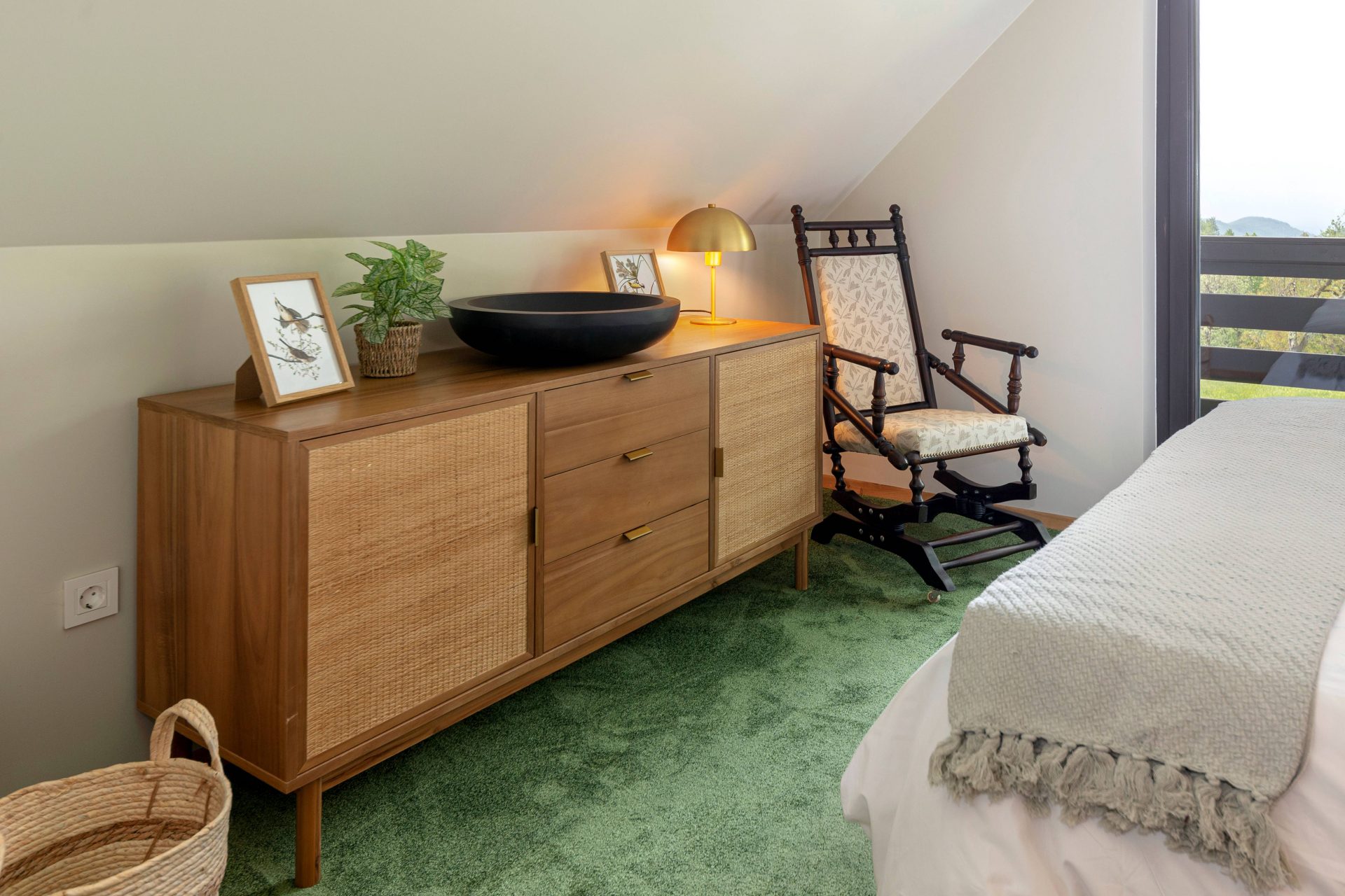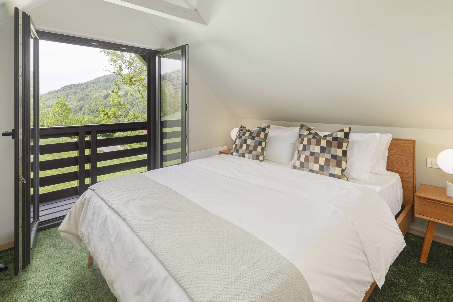 V nadstropju sta dve spalnici. Glavna spalnica ima zakonsko posteljo in izhod na balkon z izjemnim panoramskim razgledom. Druga spalnica ima dve enojni postelji in služi kot prehod do glavne spalnice.