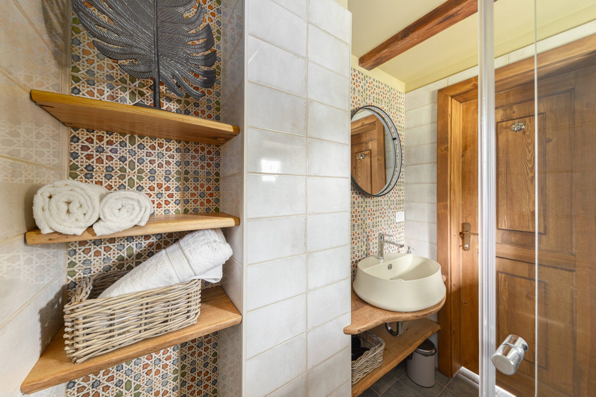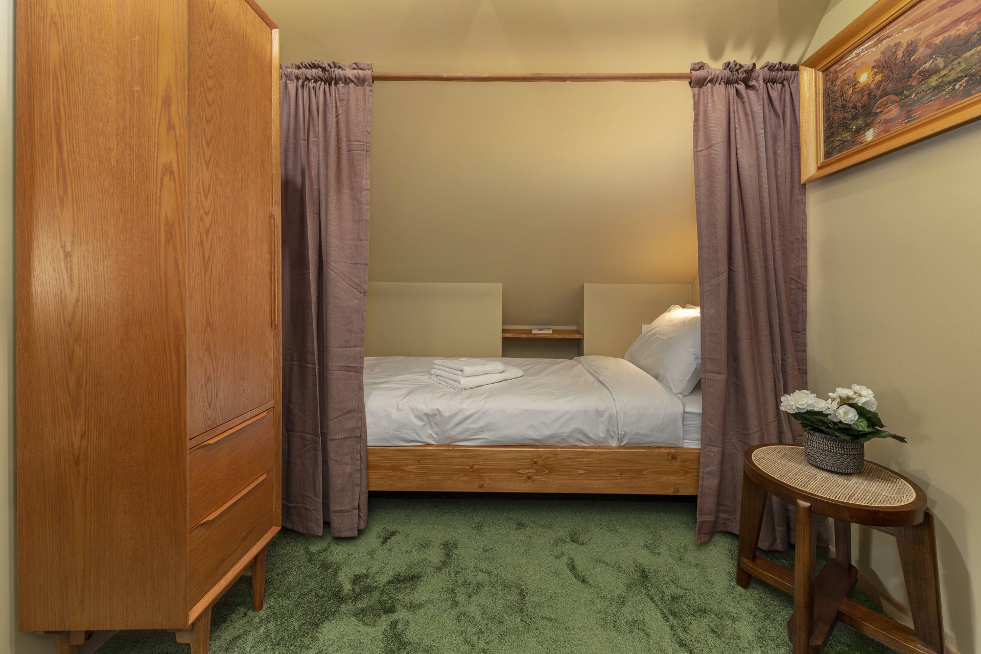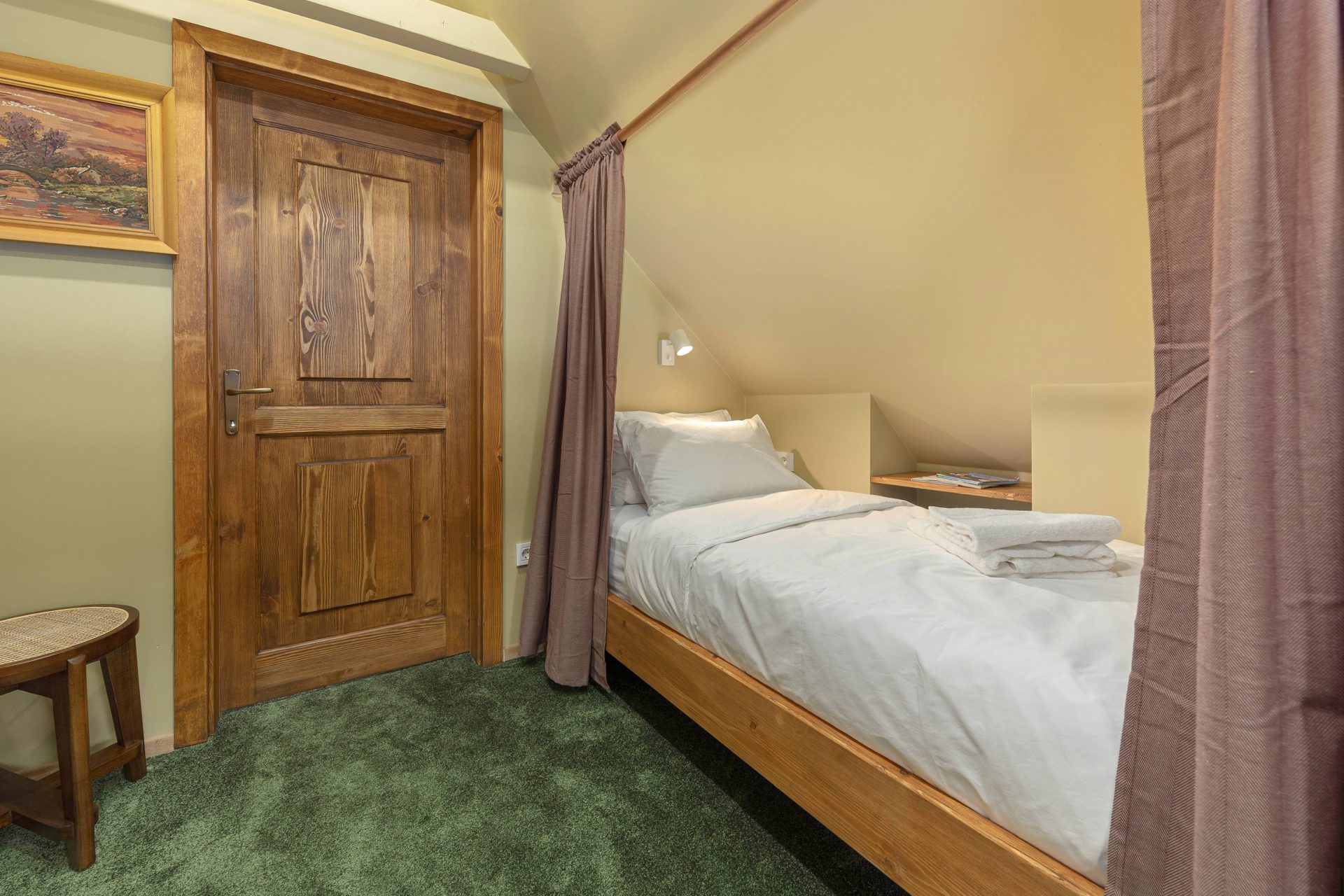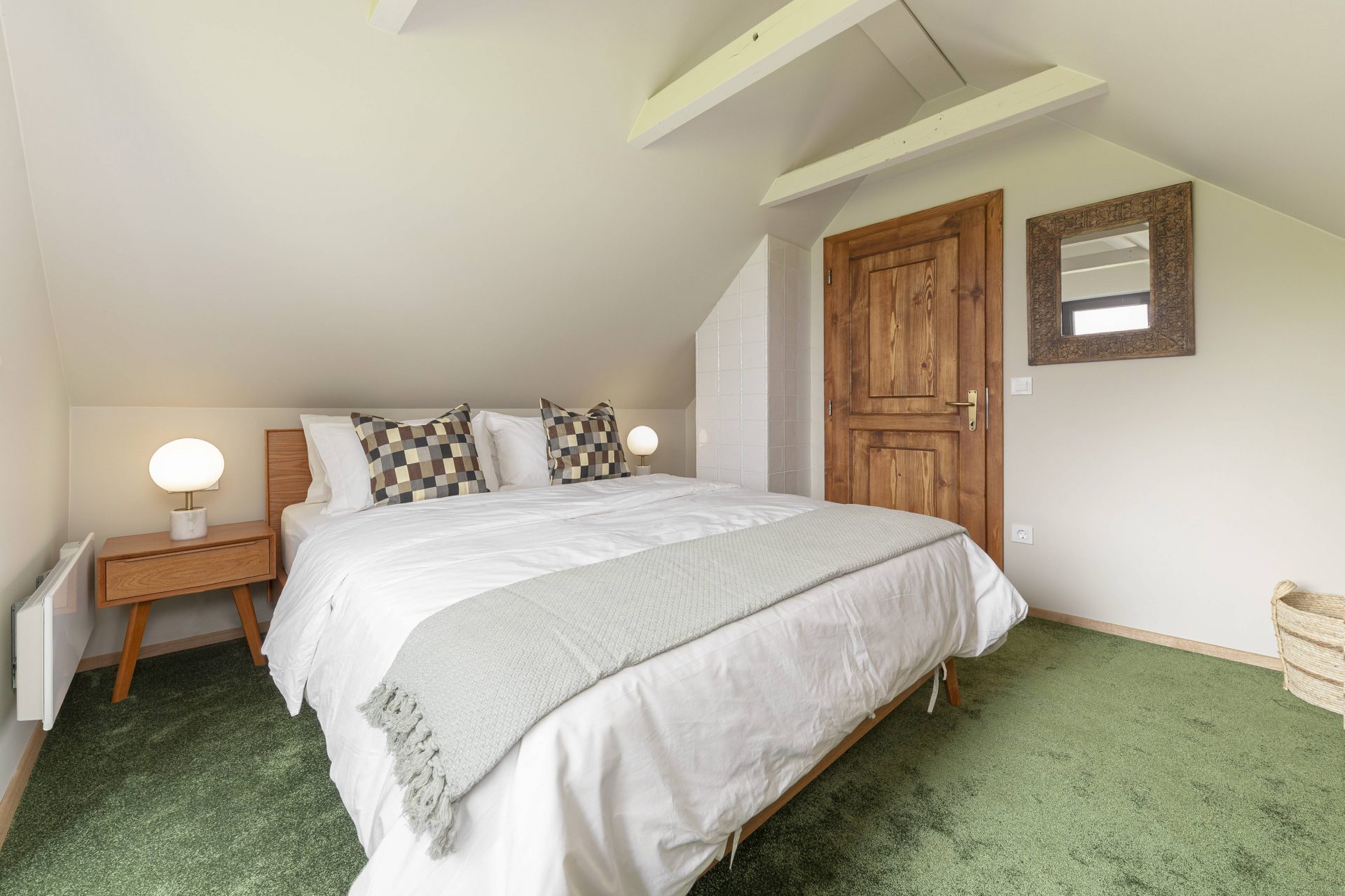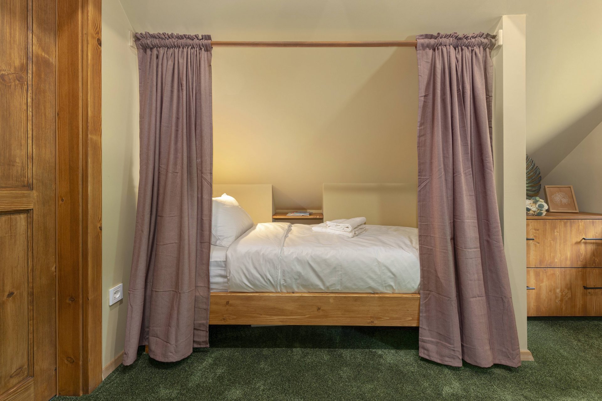 V nadstropju sta dve spalnici. Glavna spalnica ima zakonsko posteljo in izhod na balkon z izjemnim panoramskim razgledom. Druga spalnica ima dve enojni postelji in služi kot prehod do glavne spalnice.
