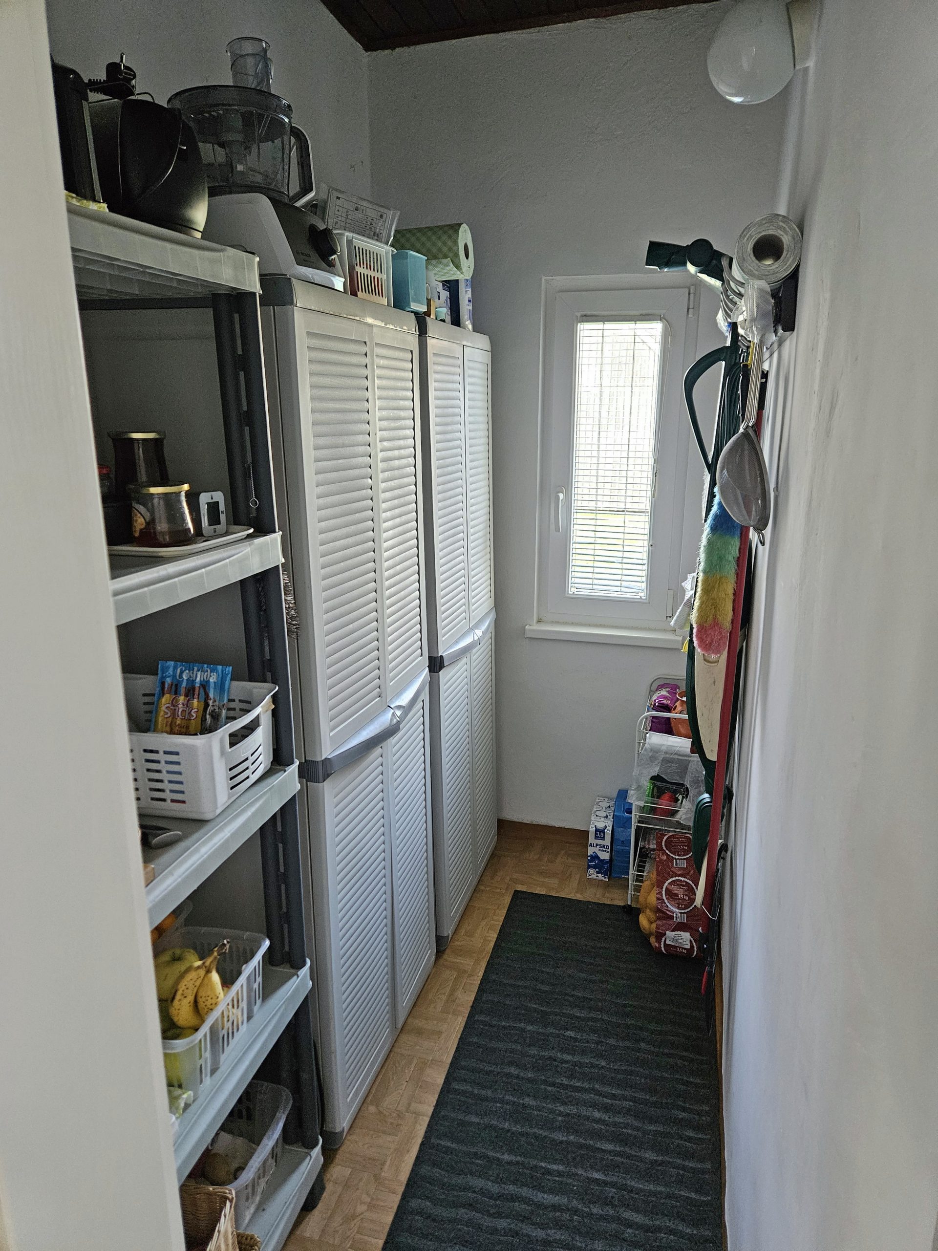 Pritličje obsega glavni vhod, hodnik, prostorno dnevno sobo, kuhinjo z jedilnim kotom, shrambo, kopalnico ter spalnico. V kleti se nahaja velika garaža ter dve shrambi oz utility prostor z tuš kabino. Mansarda pa ponuja možnost ureditve dodatnega prostora.