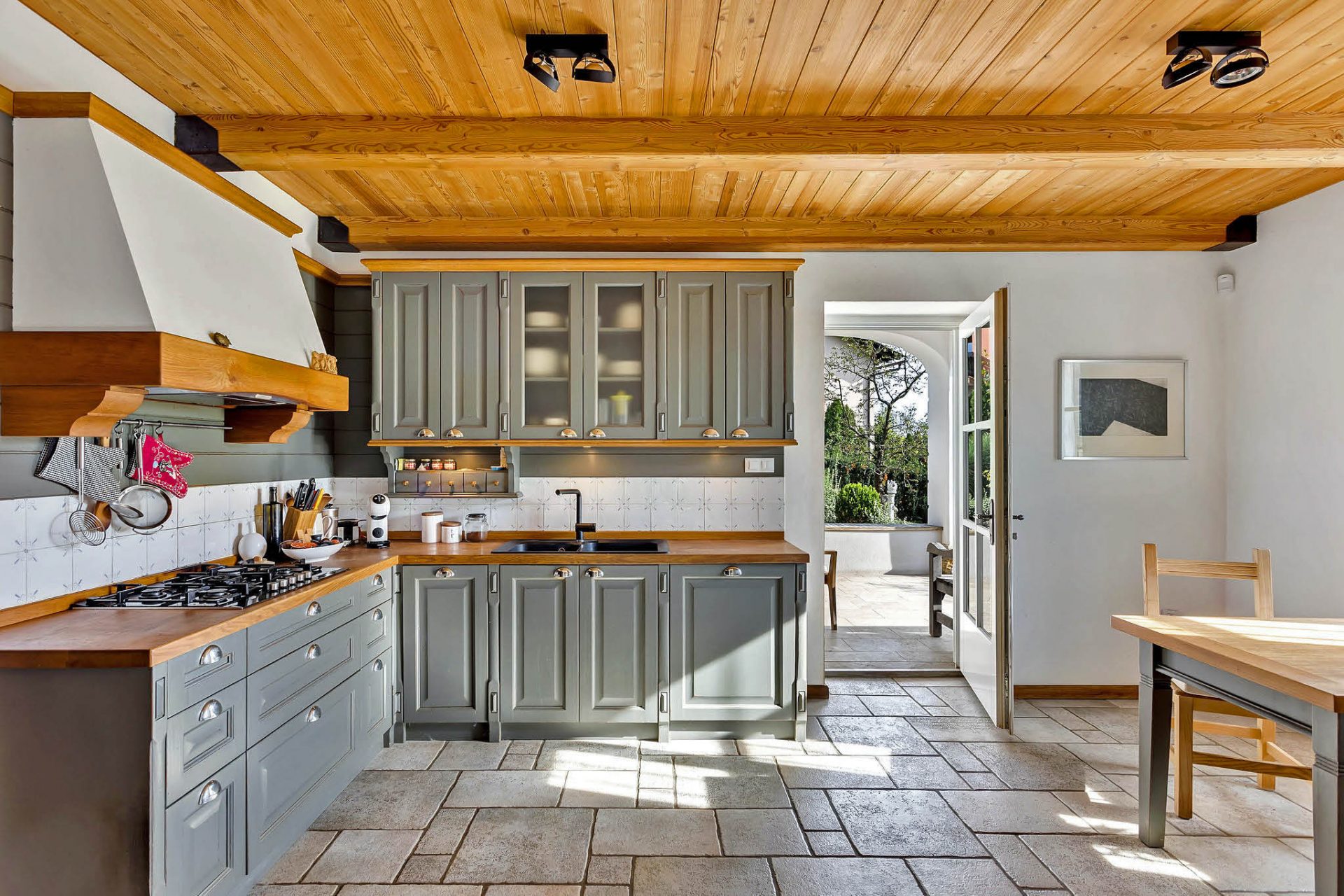 Iz kuhinje dostopdo zunanjega prostora, ki vključuje počivalni prostor in poletni prostor z bazenom.