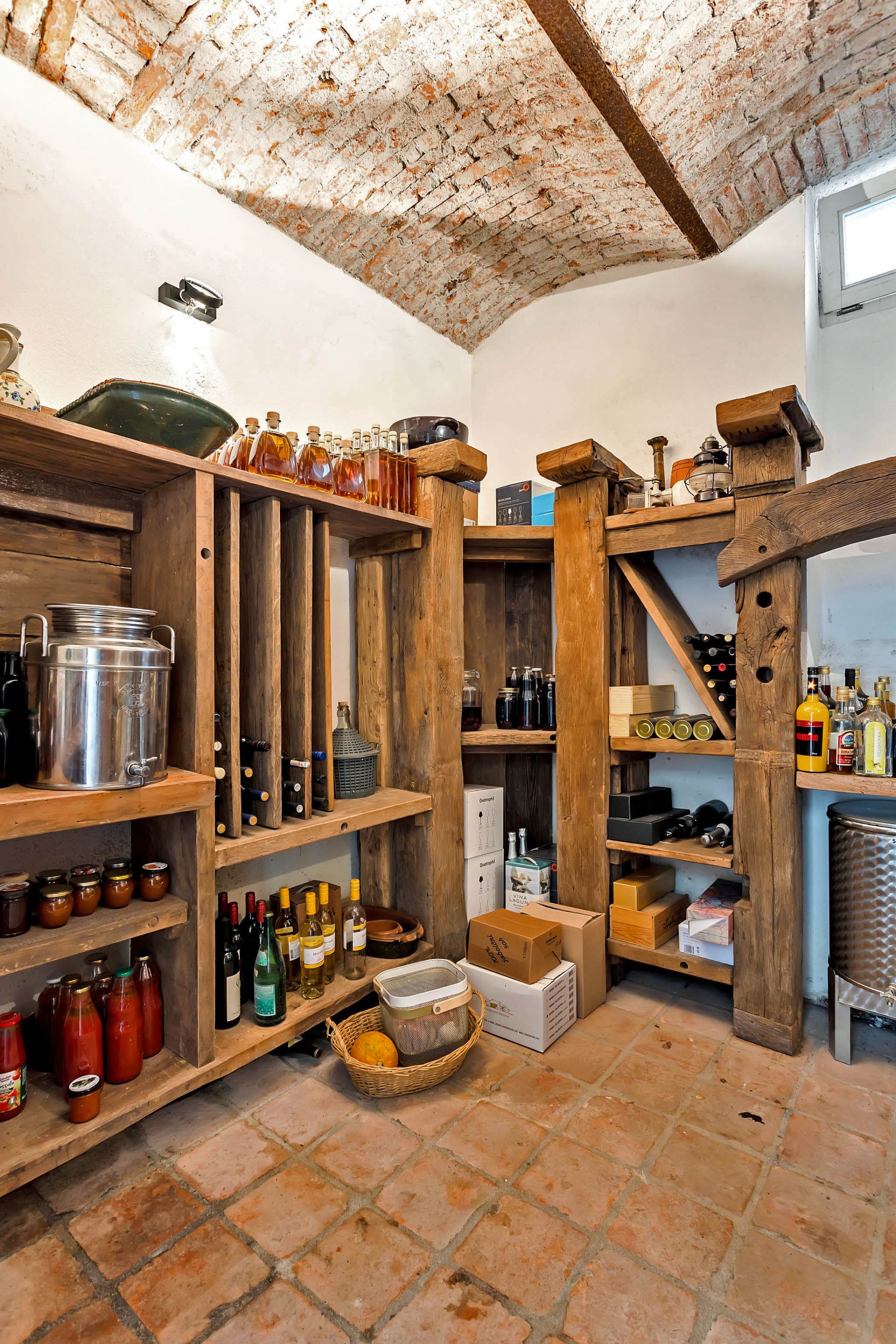 V pritličju je kuhinja z jedilnico, večja jedilnica s kaminom z izhodom na vrt, glavni vhod, shramba, dodatna shramba, kurilnica, vinska klet in hodnik.