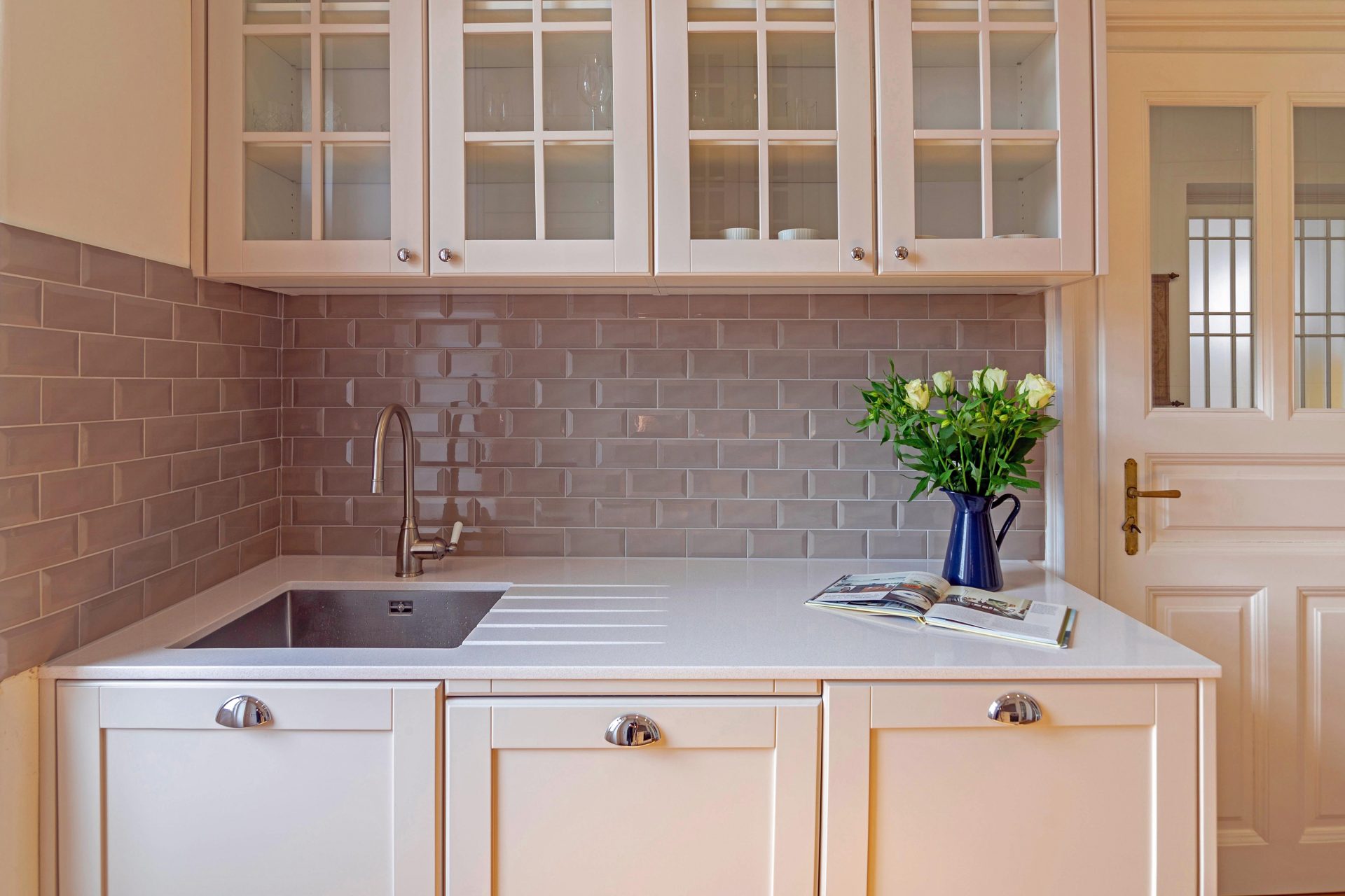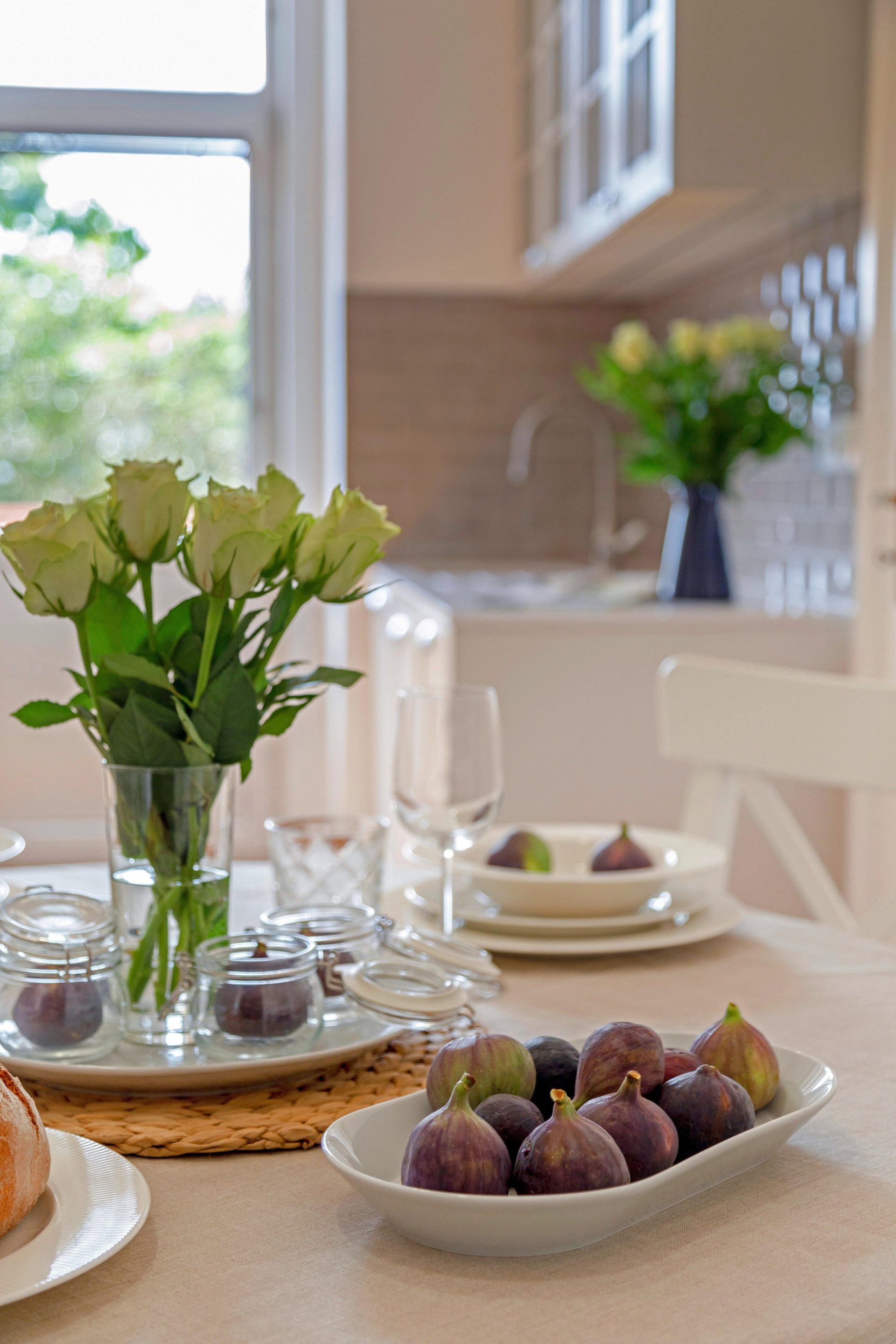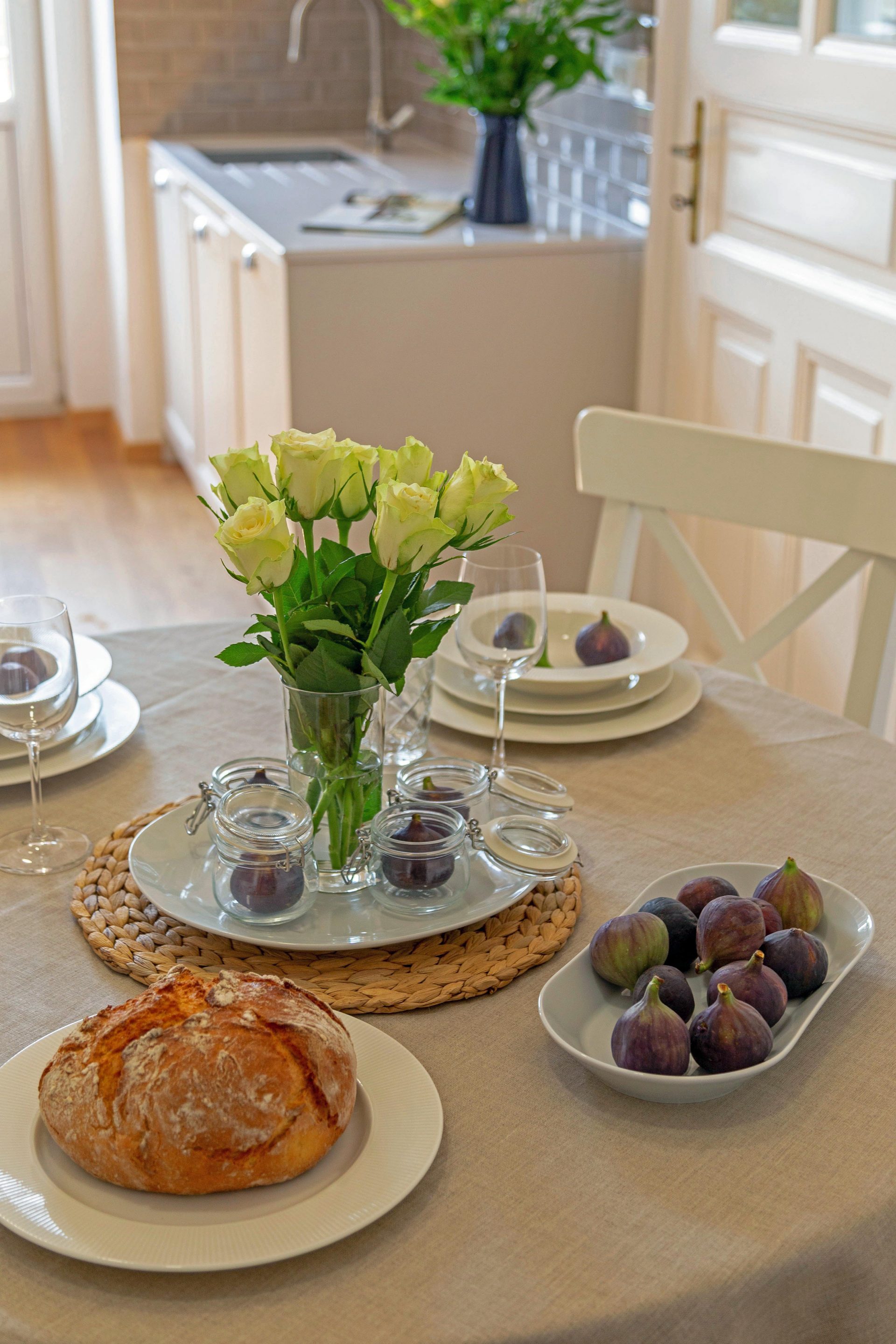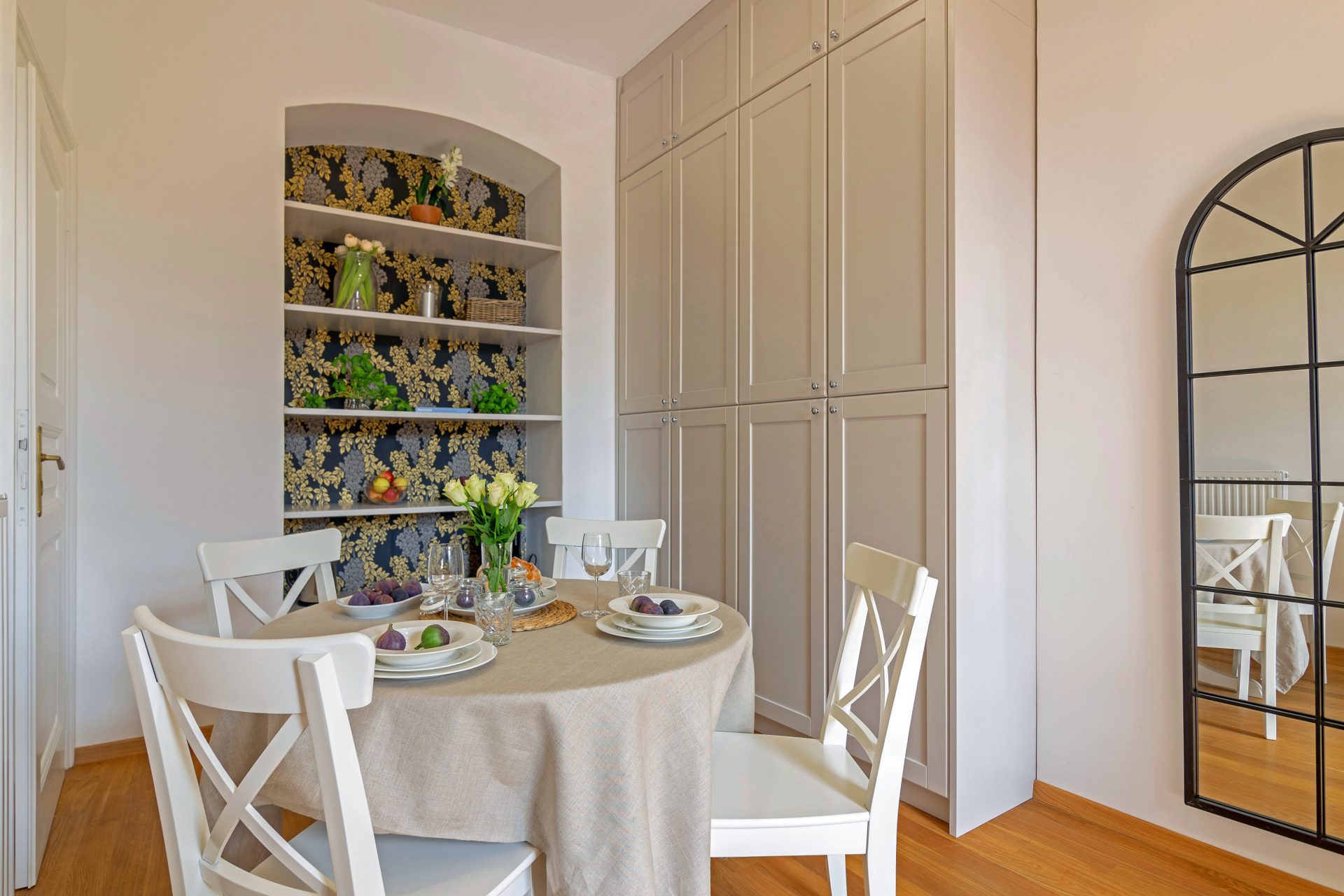 Popolnoma opremljeno kuhinjo z veliko prostora za shranjevanje in jedilnico. Iz kuhinje je dostoš na balkon.