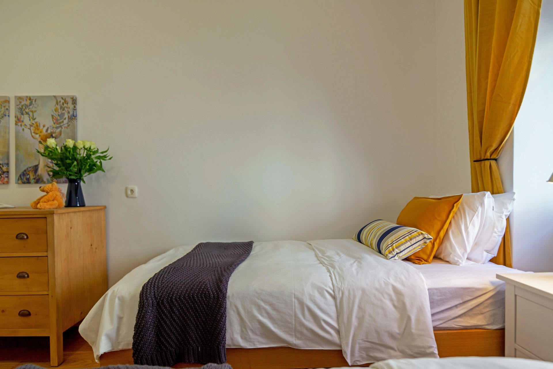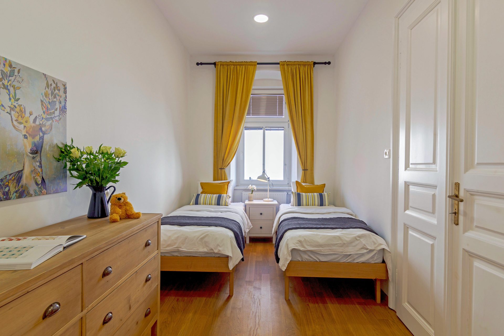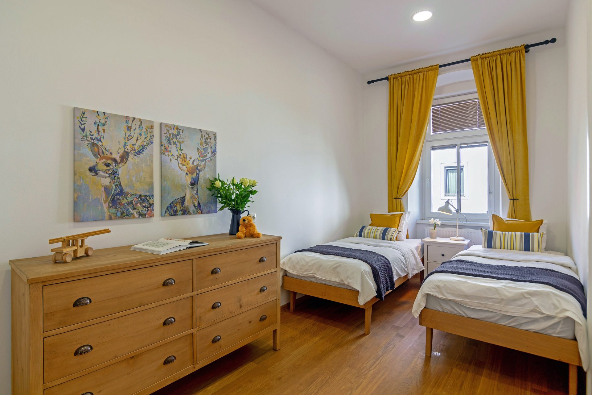 Drugo spalnico z dvema enojnima posteljama in vgrajenimi omarami.