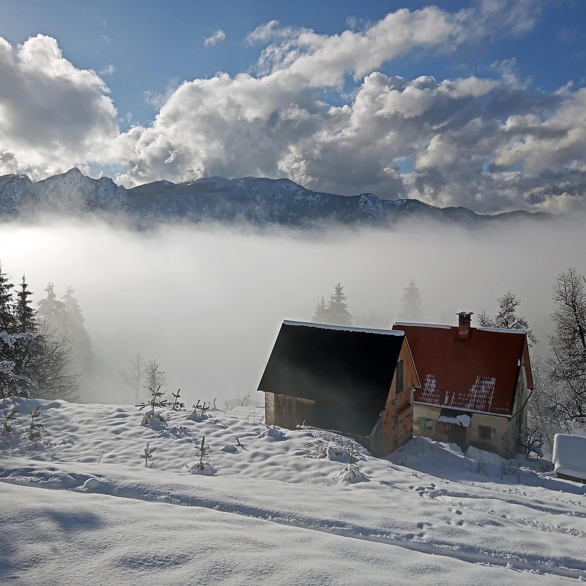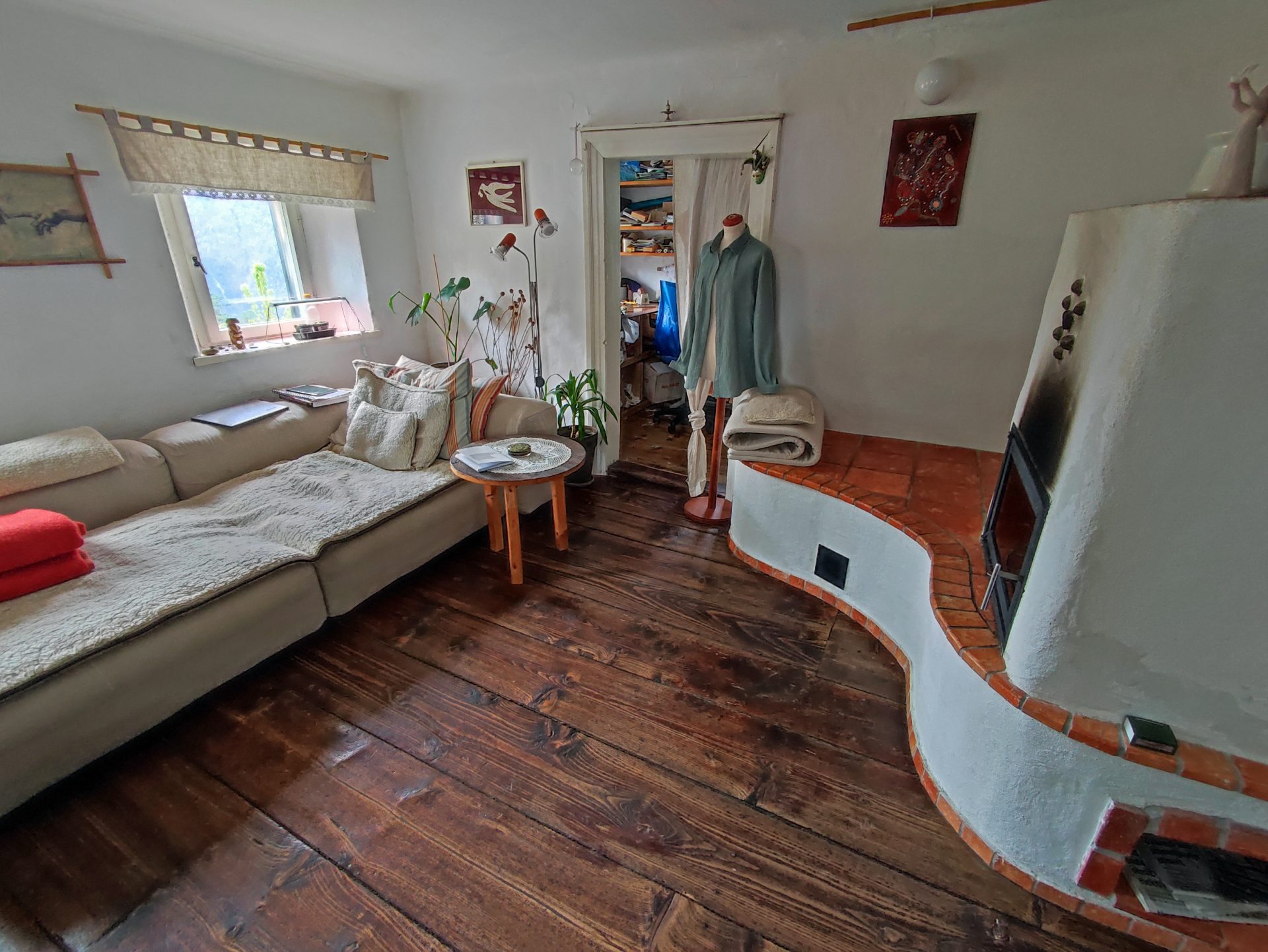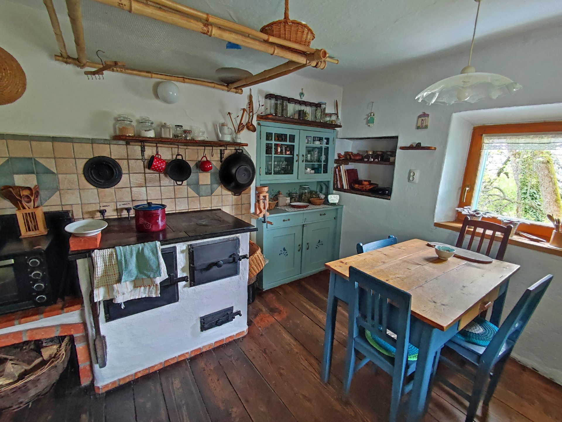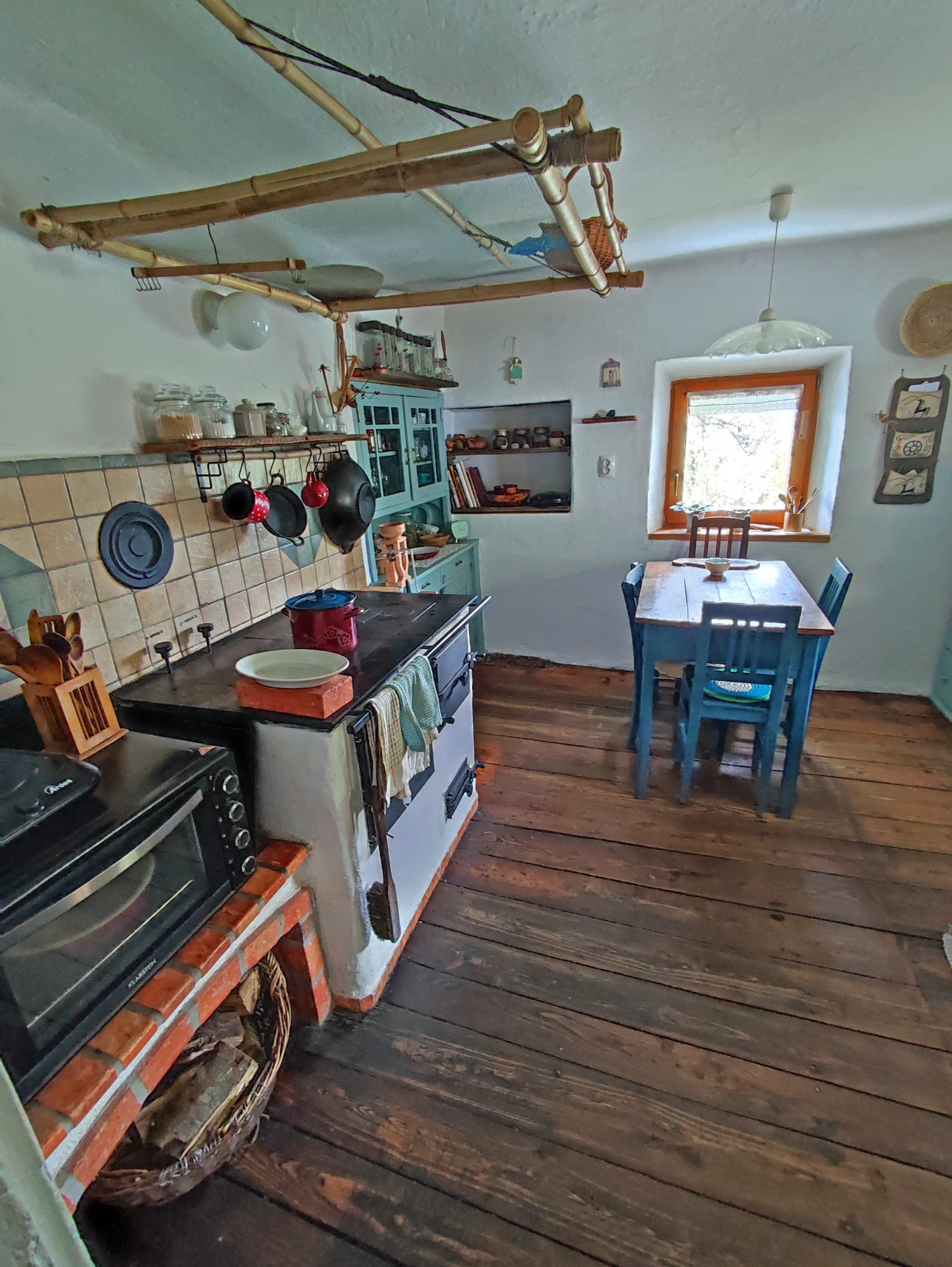 Spodaj kuhinja, hodnik, shramba, dnevni prostor in izba.