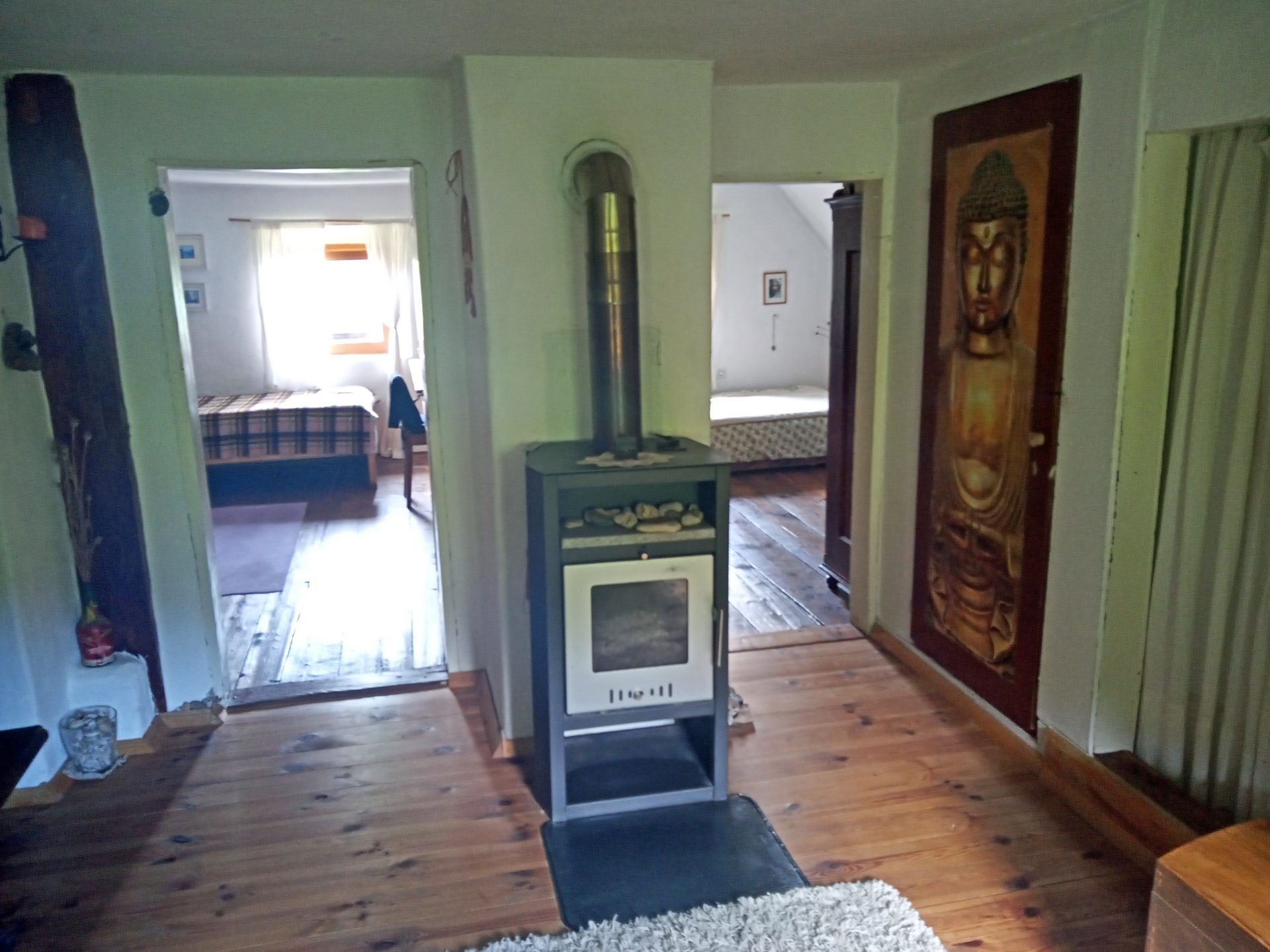 V zgornji etaži je hodnik, dve sobi, kopalnica, shramba in vhod na pohodno podstrešje.