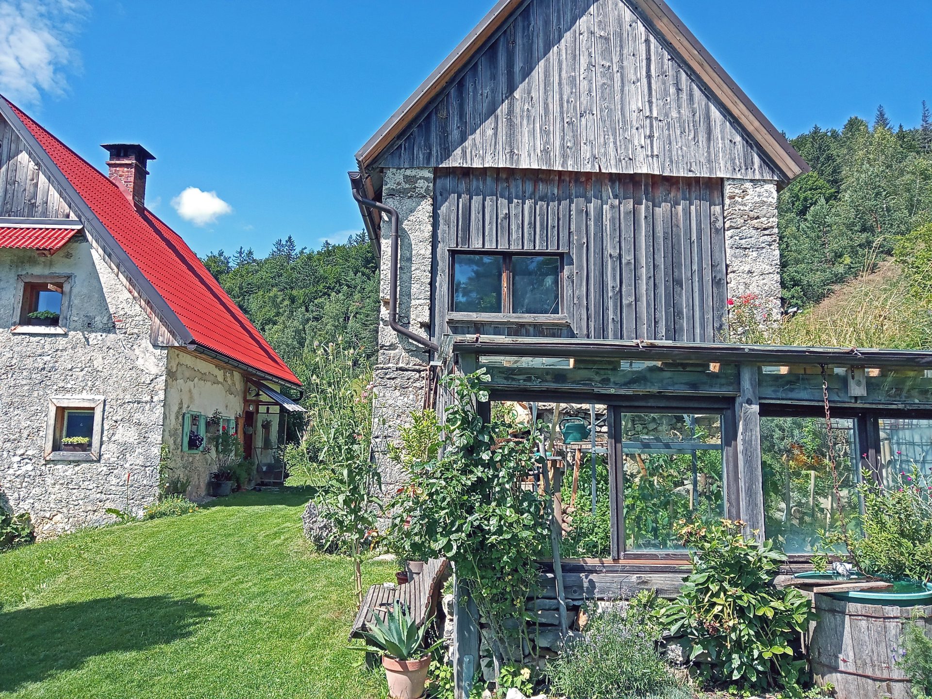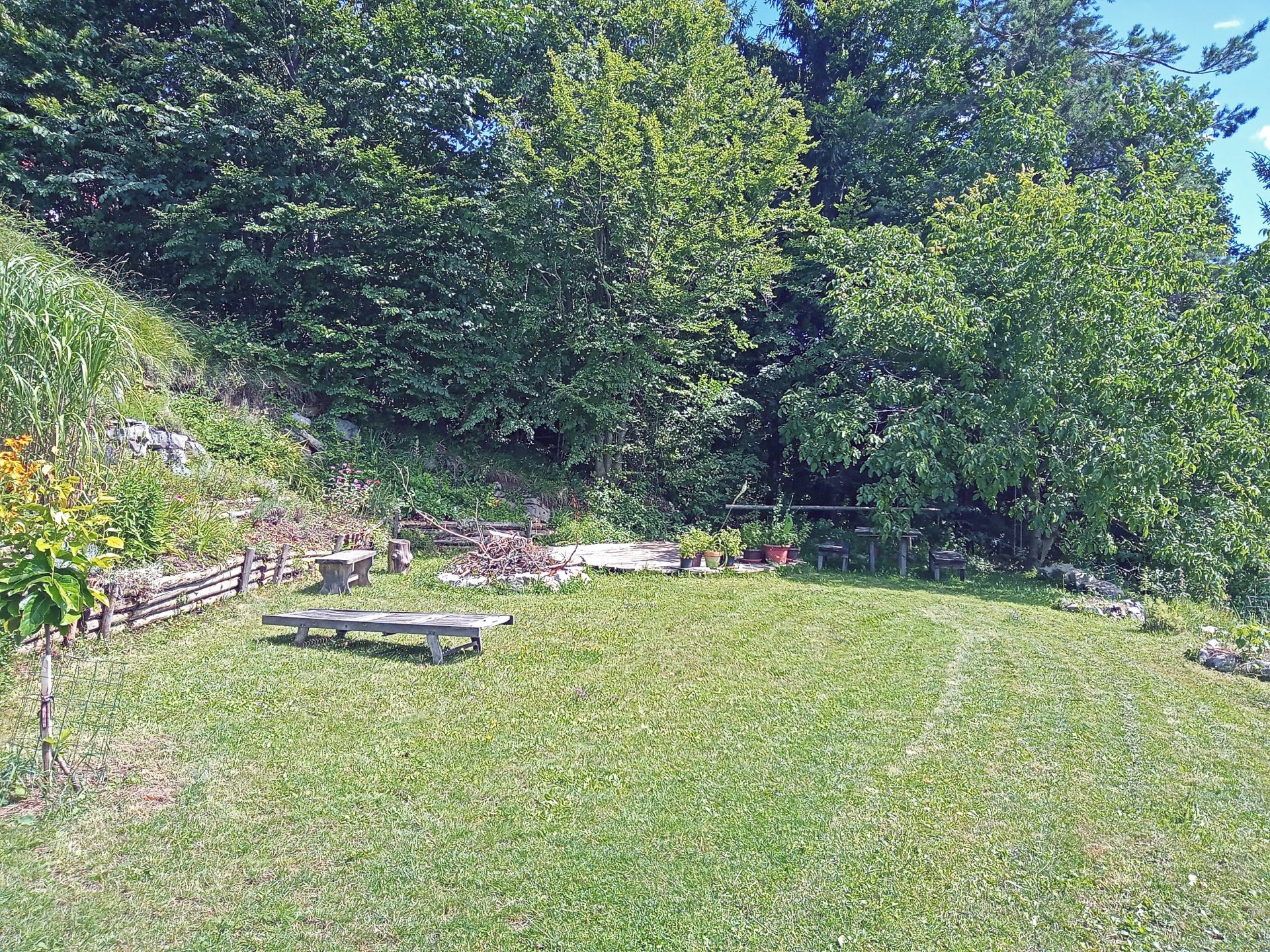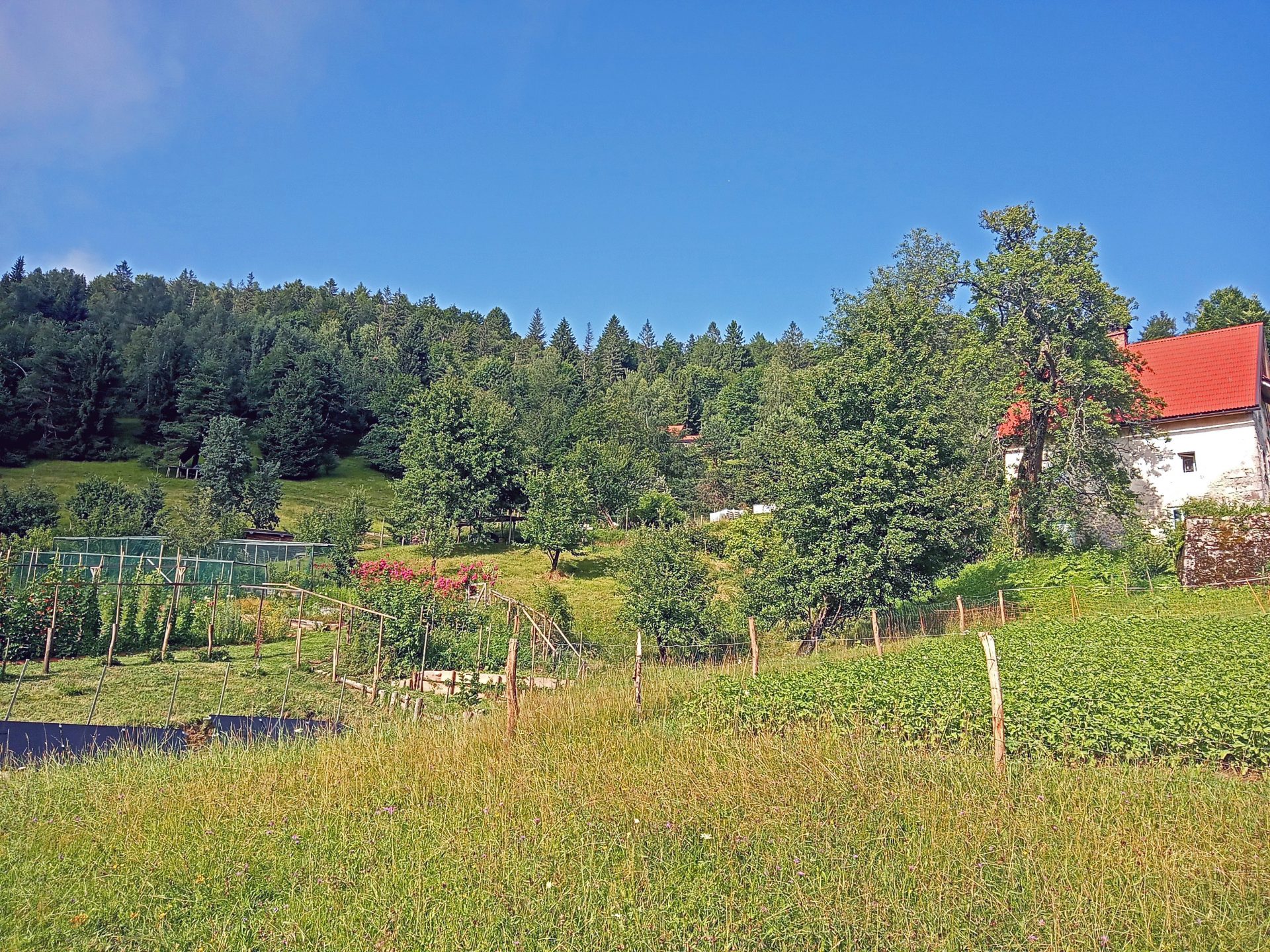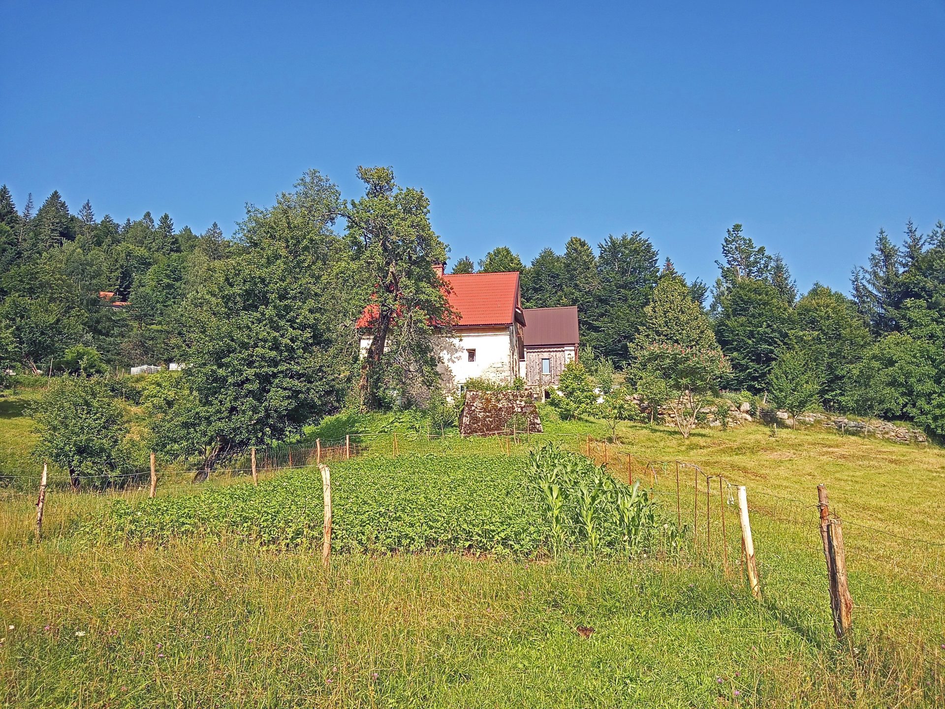 Okoli hiše je nekaj ravnega zemljišča. Ostalo so travniki in gozd, skupaj v izmeri cca 40.000 m2 zemljišča.
