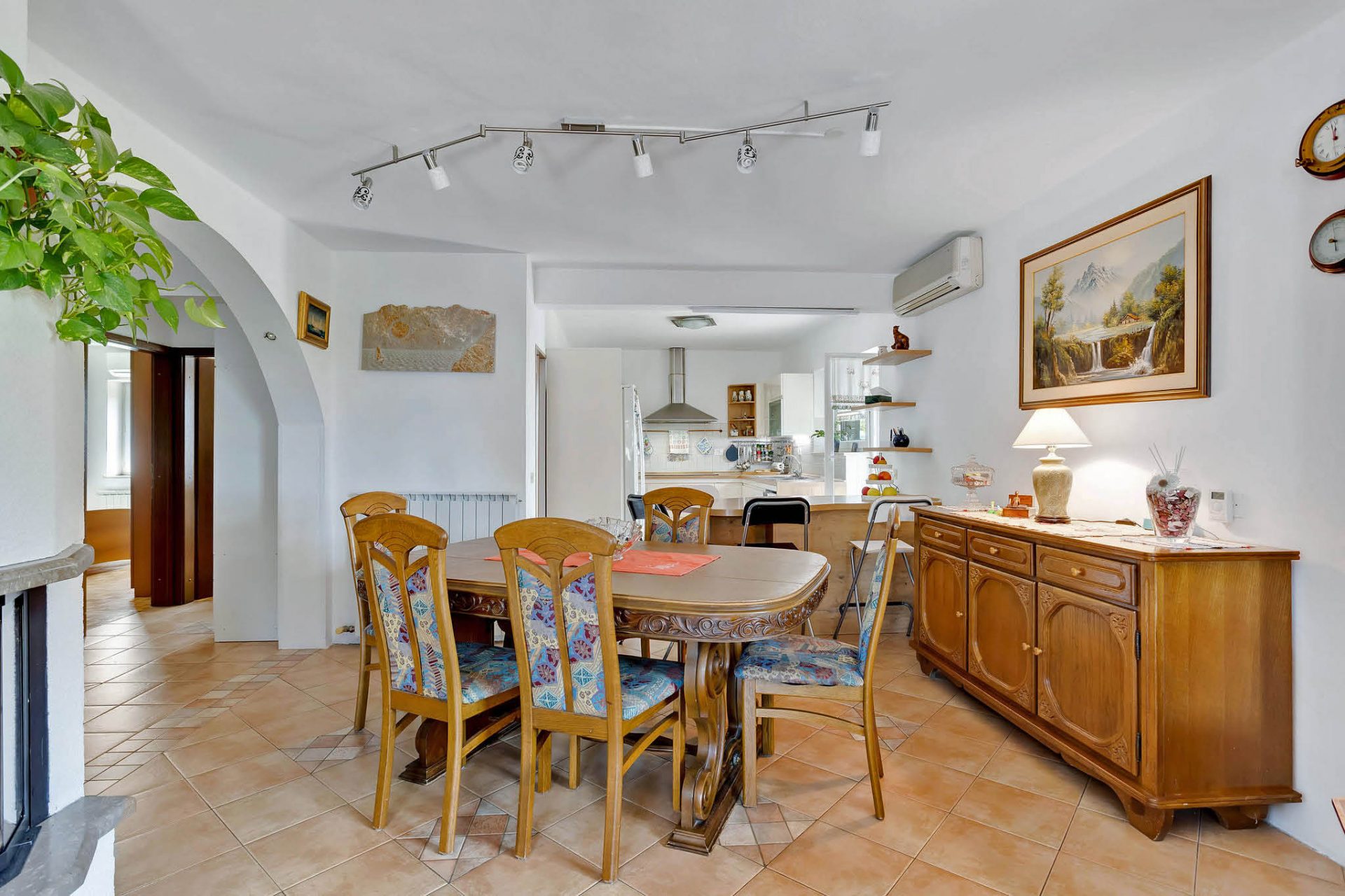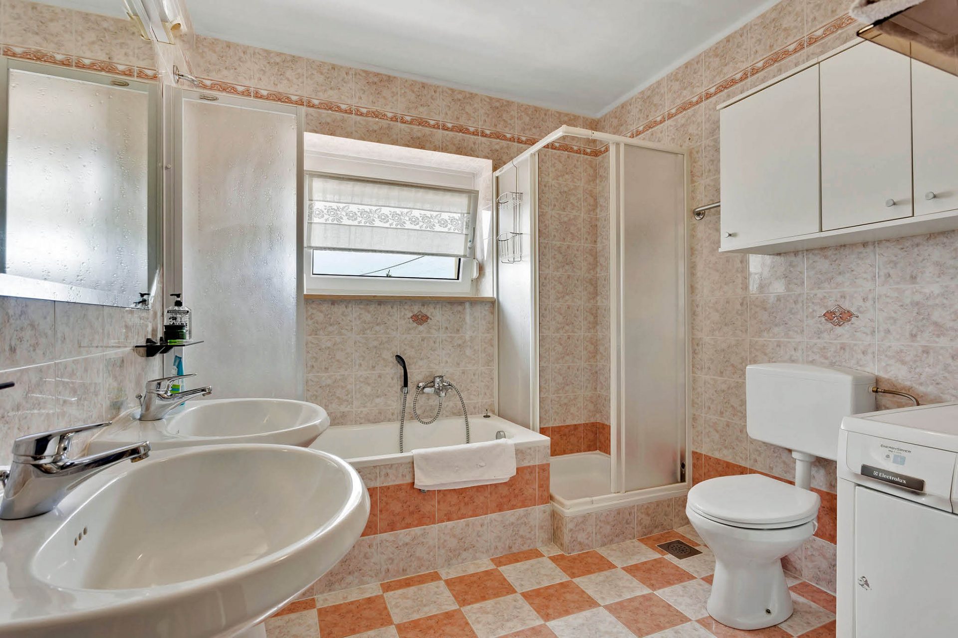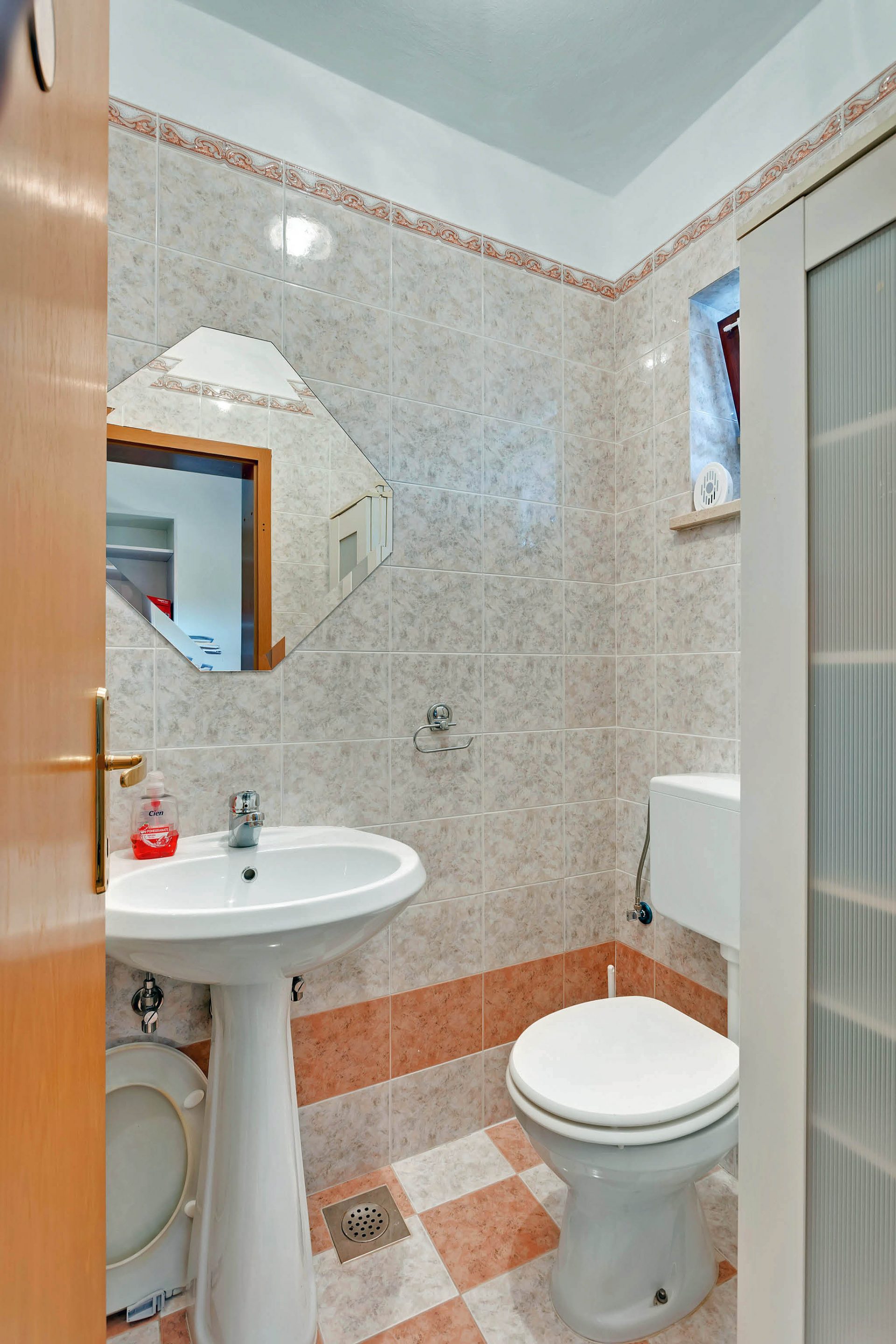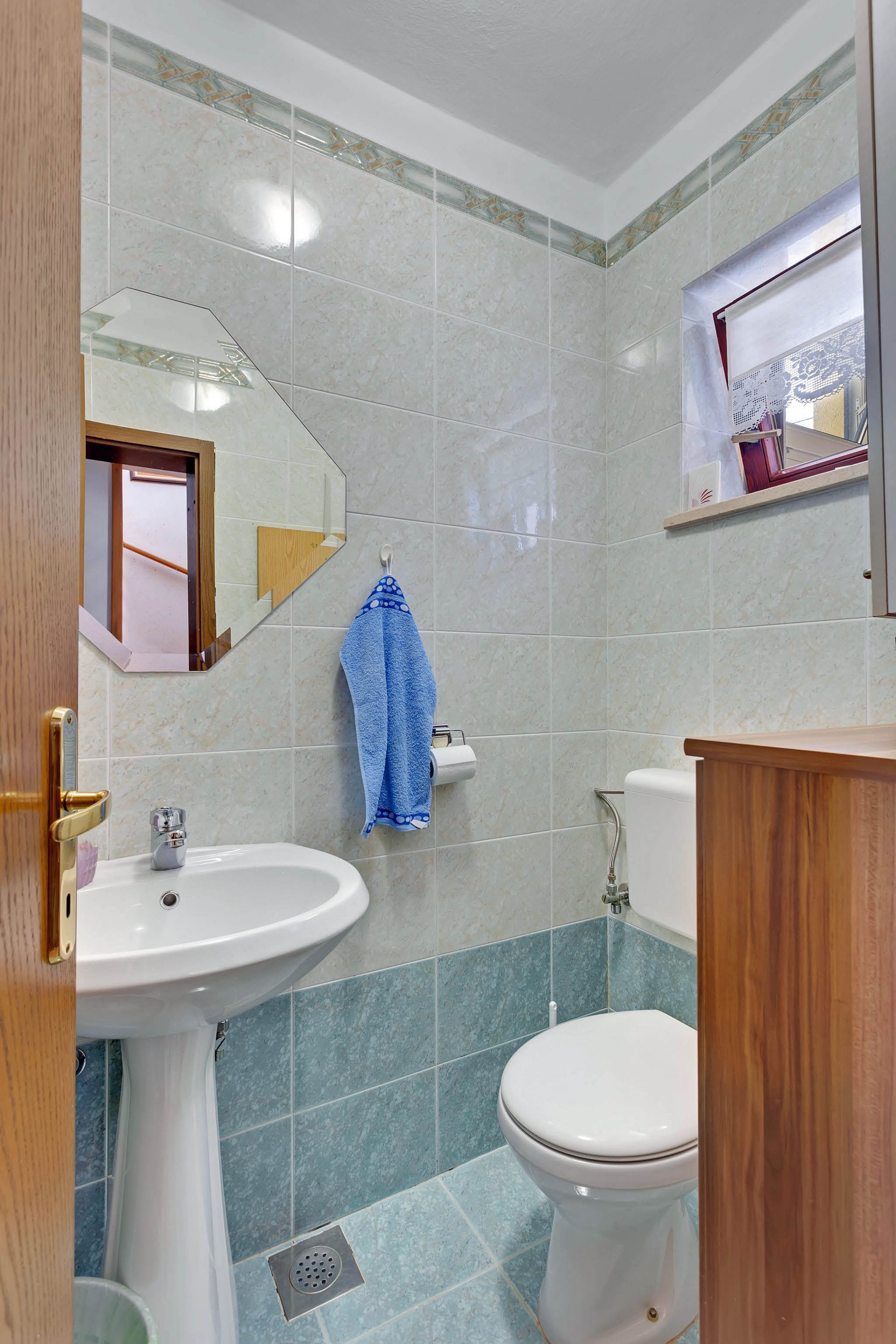 V pritličju je vhod, hodnik, utility, WC, kopalnica, spalnica, hodnik, velik dnevni prostor z jedilnico in kuhinjo, shramba in soba. Iz kuhinje je dostop na vrt.