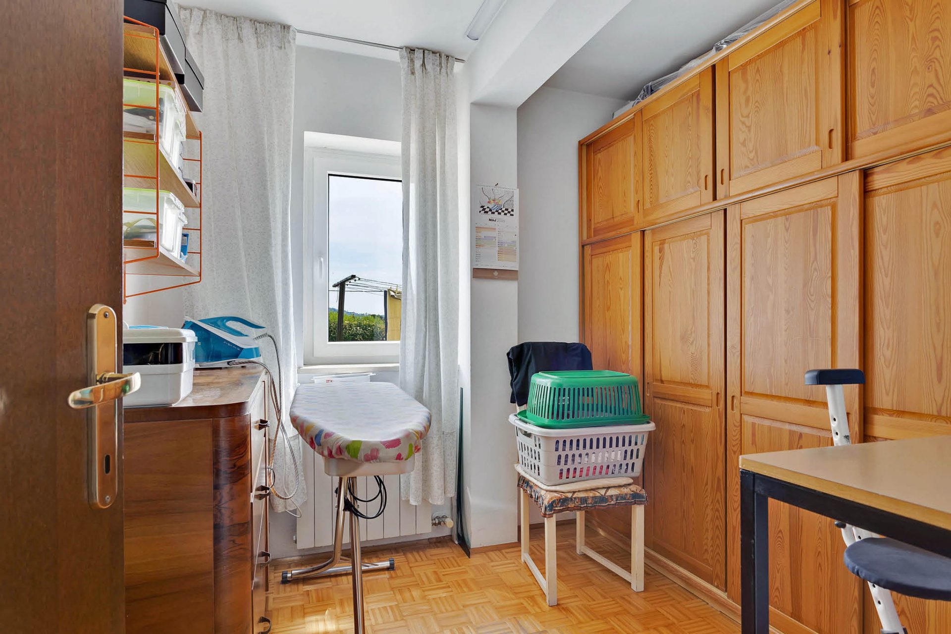 V prvem nadstropju je spalnica z večjo garderobno sobo in kopalnica.