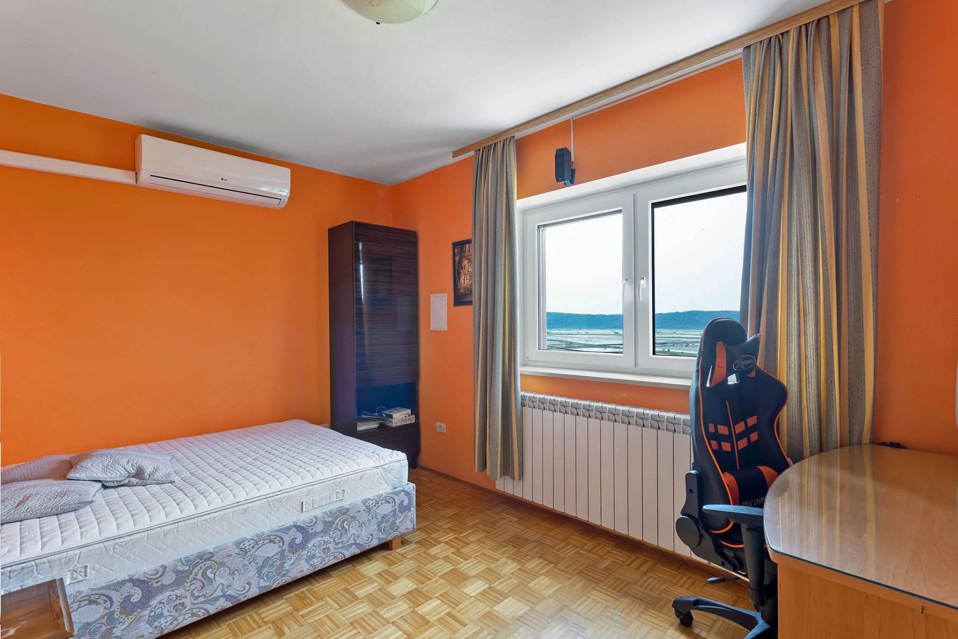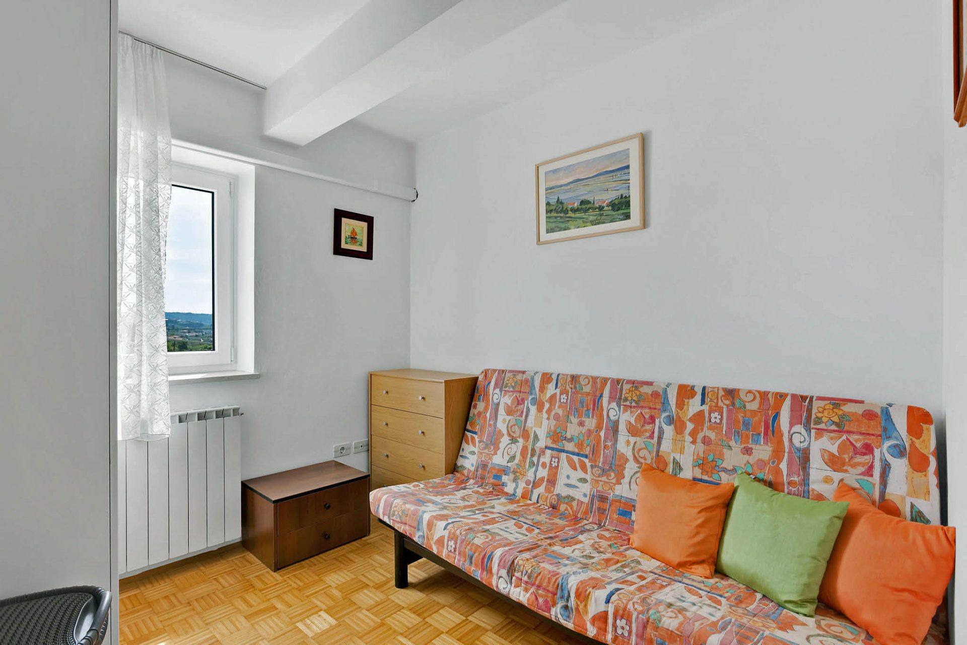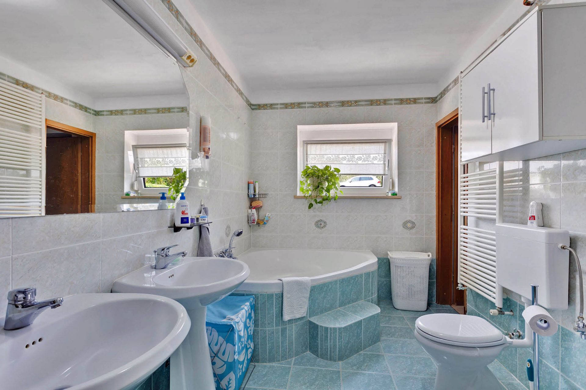 V zgornjem nadstropju sta dve večji spalnici in 3 manjše, balkon, hodnik, kopalnica, WC.