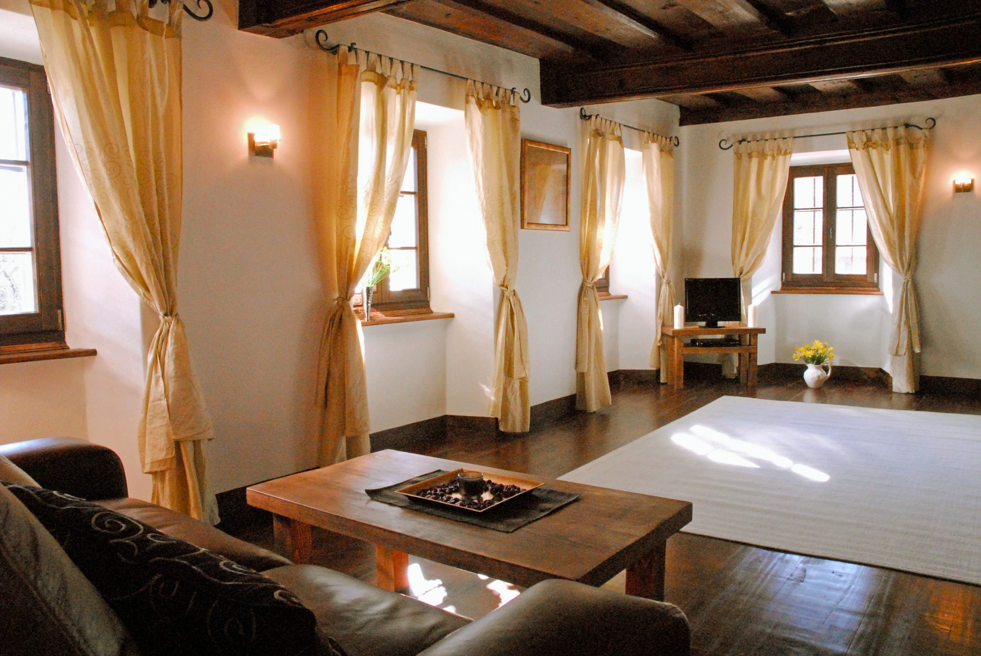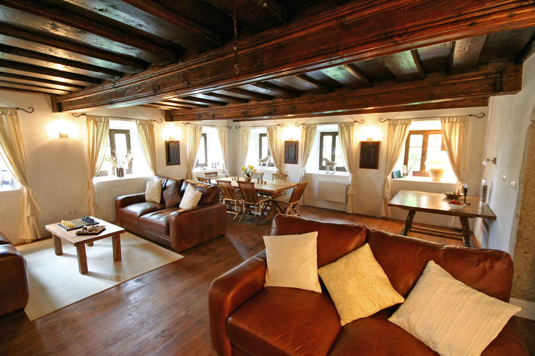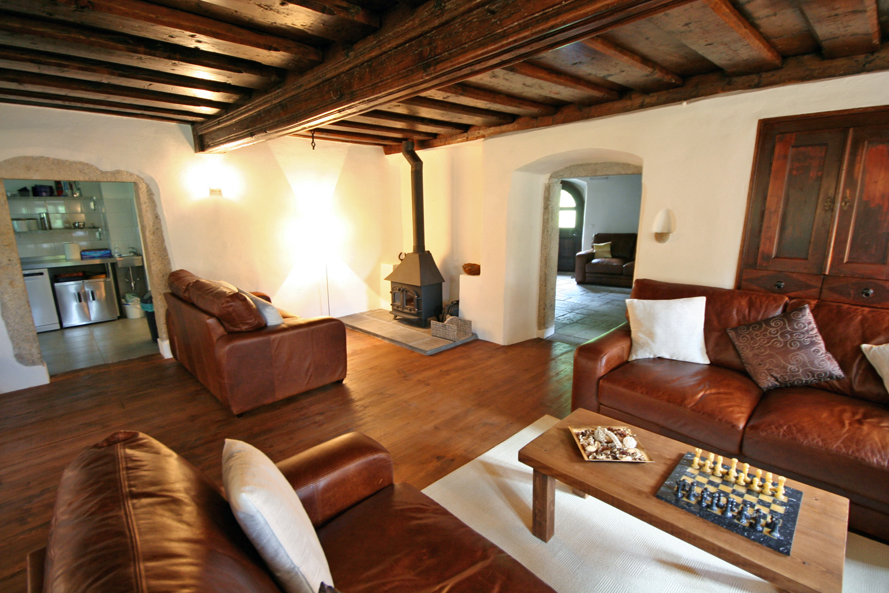 V pritličju je dnevni prostor. Ta soba ima čudovit originalni izrezljani strop z lesenimi tramovi, ki je le eden od številnih izvirnih elementov te hiše. V tem nadstropju je tudi kuhinja.