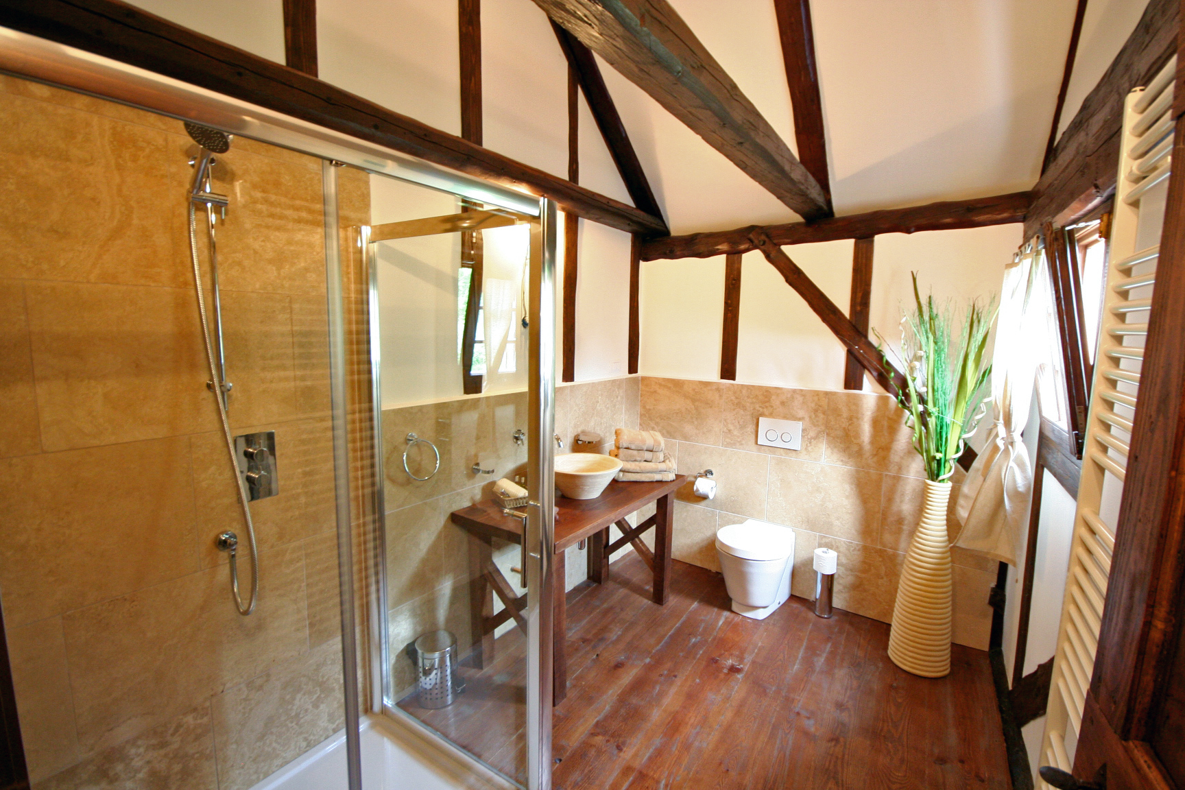 Ob domačiji je velik hlev, ki je bil leta 2011 preurejen in obsega približno 80 m2 veliko stanovanje v zgornjem nadstropju ter savno in shrambo v spodnjem nadstropju. Velika zunanja lesena terasa s prostorom za sedenje ponuja čudovit razgled na okoliške hribe in dolino.