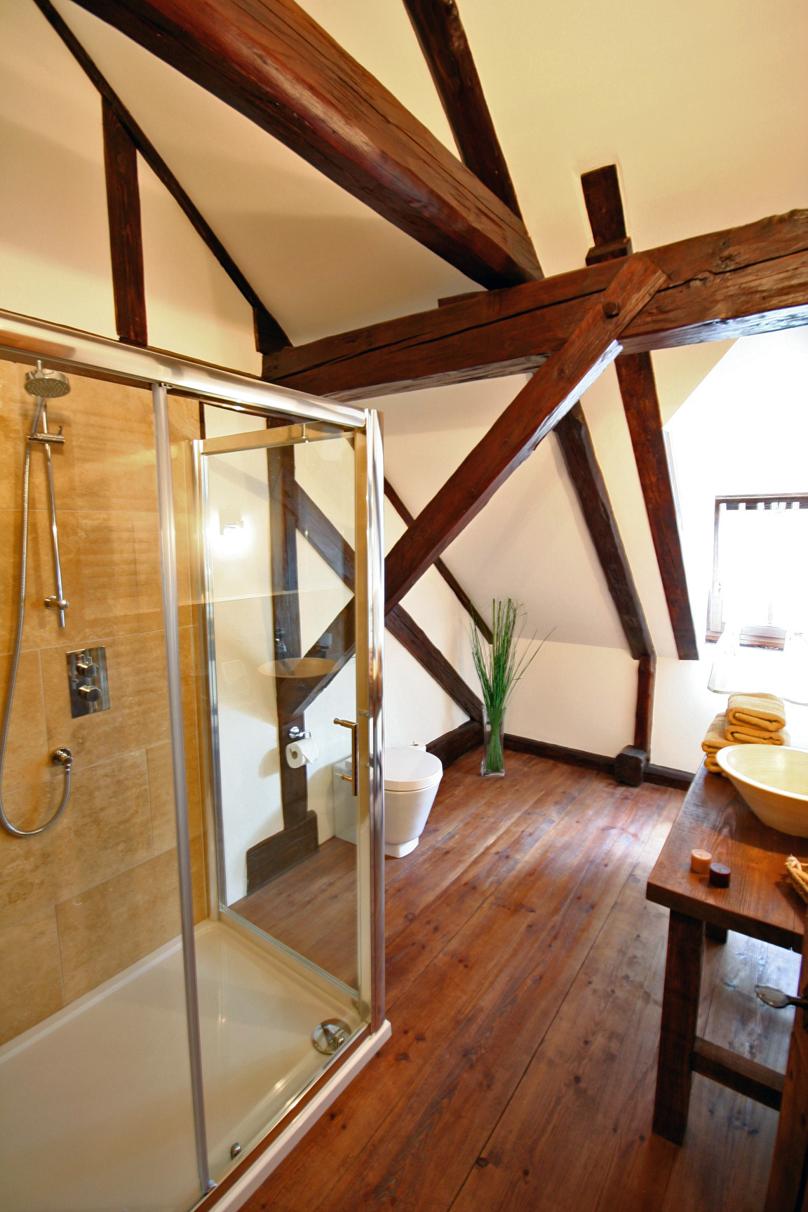 V dveh zgornjih nadstropjih je pet čudovitih spalnic, vsaka z lastno kopalnico, ki so dokončane po najviših standardih.