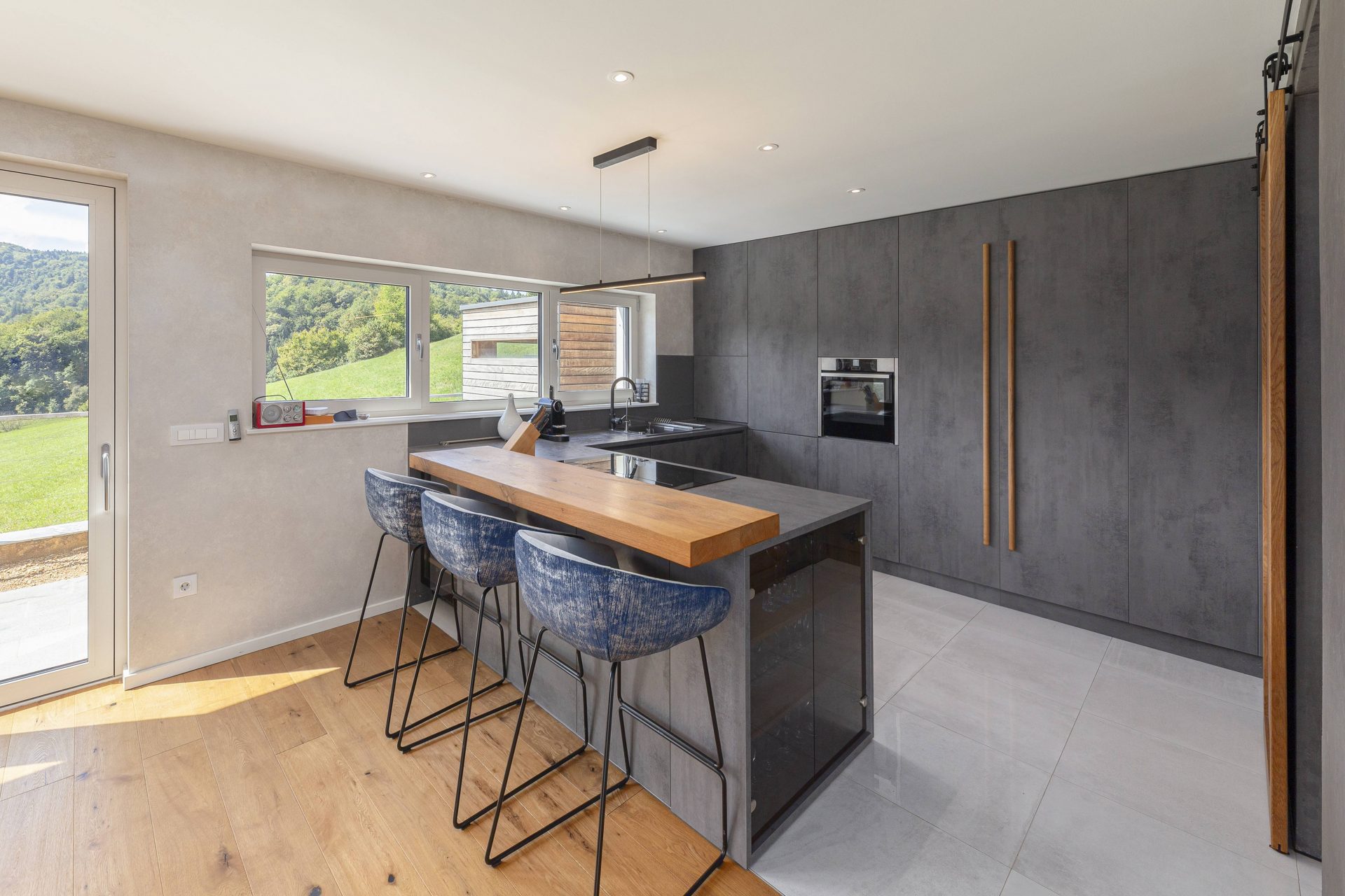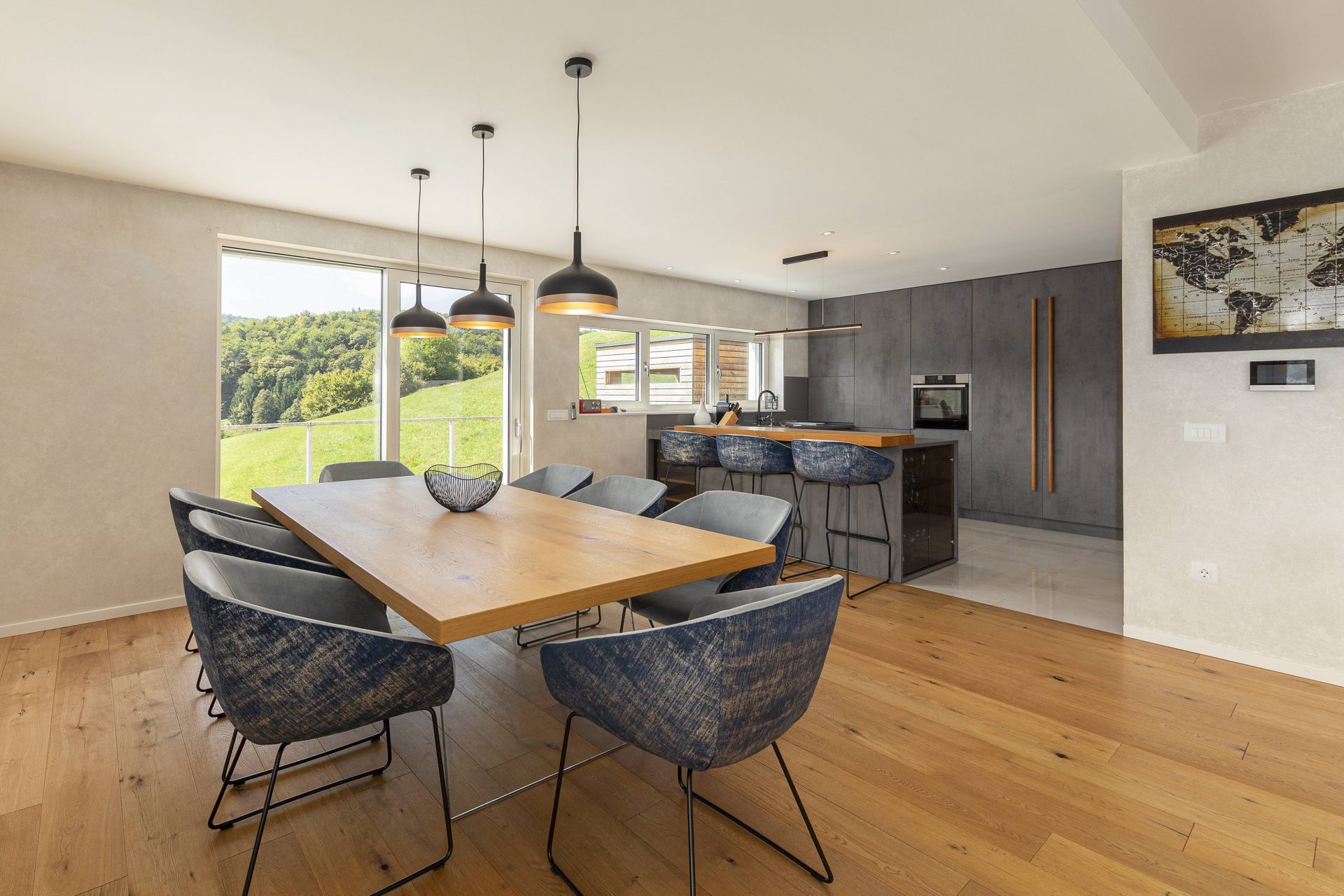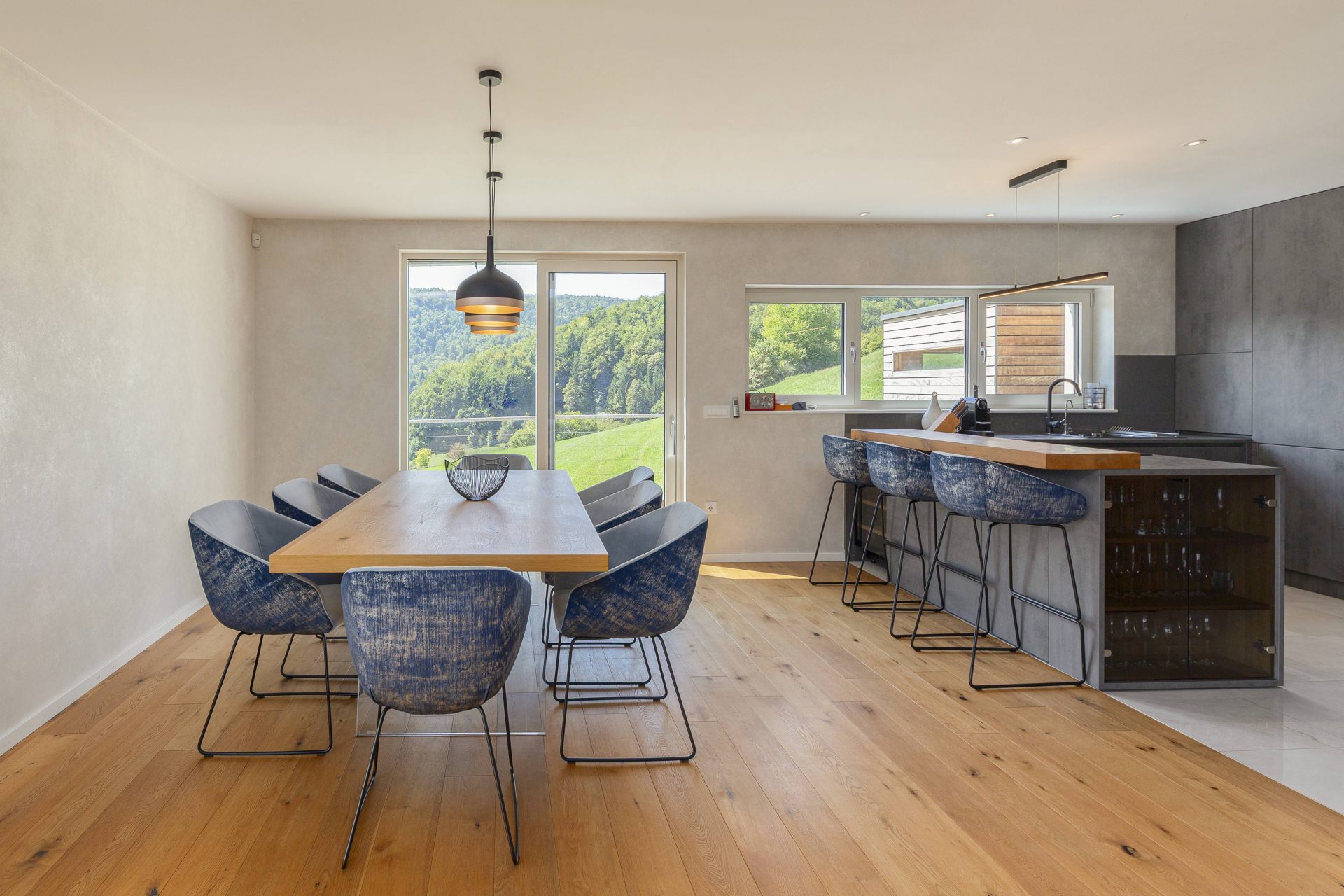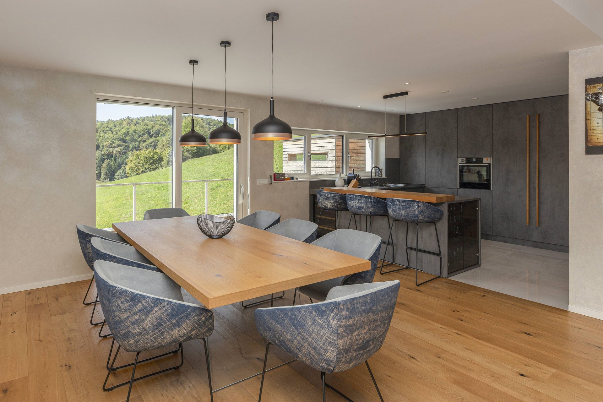 V pritličju se nahaja odprto načrtovana prostorna kuhinja z jedilnico in dnevnim prostorom. Kuhinja je popolnoma opremljena s kakovostnimi aparati, vključno s hladilnikom in zamrzovalnikom Liebherr, pečico in pomivalnim strojem Neff, velikim kuhinjskim otokom z barskimi stoli ter indukcijsko kuhalno ploščo. V prostorni jedilnici so čudovita lesena miza za osem oseb, udobna dnevna soba pa je opremljena s kavčem, televizorjem in prijetnim kaminom na drva. Velike panoramske steklene stene preplavijo prostor z naravno svetlobo in nudijo čudovit razgled na okoliške hribe. Iz dnevnega prostira je neposreden dostop na veliko teraso z vrtno garnituro, električnim nadstreškom in električnimi senčili, kar omogoča prijetno uporabo tudi v vročih poletnih mesecih.