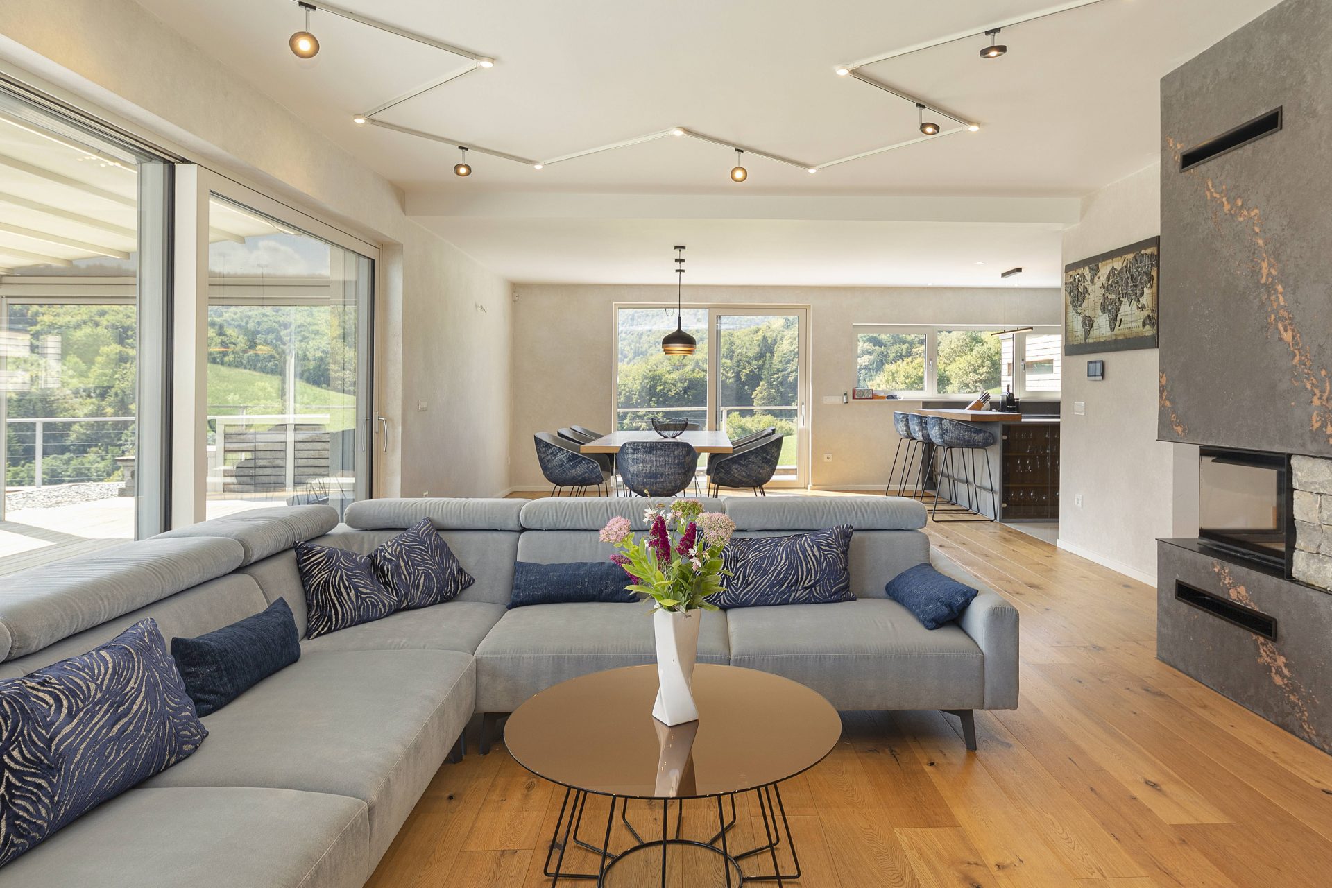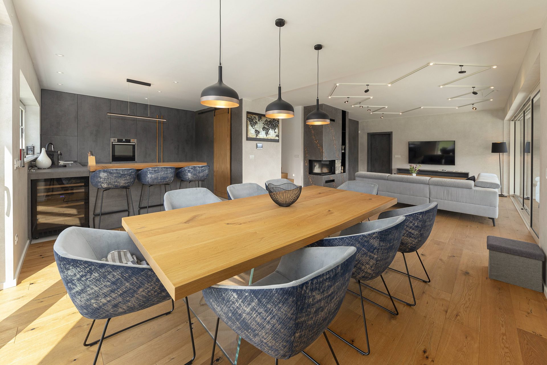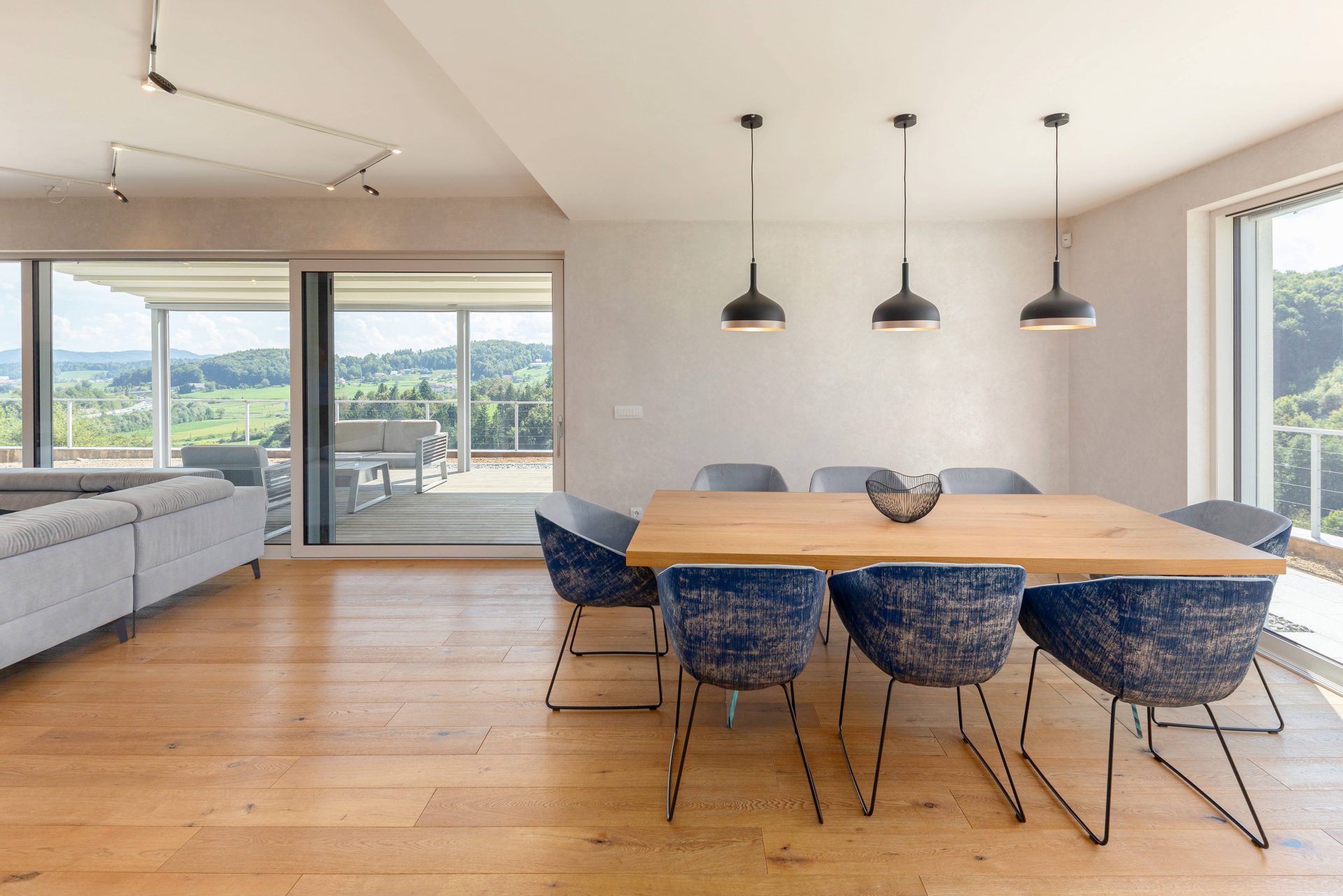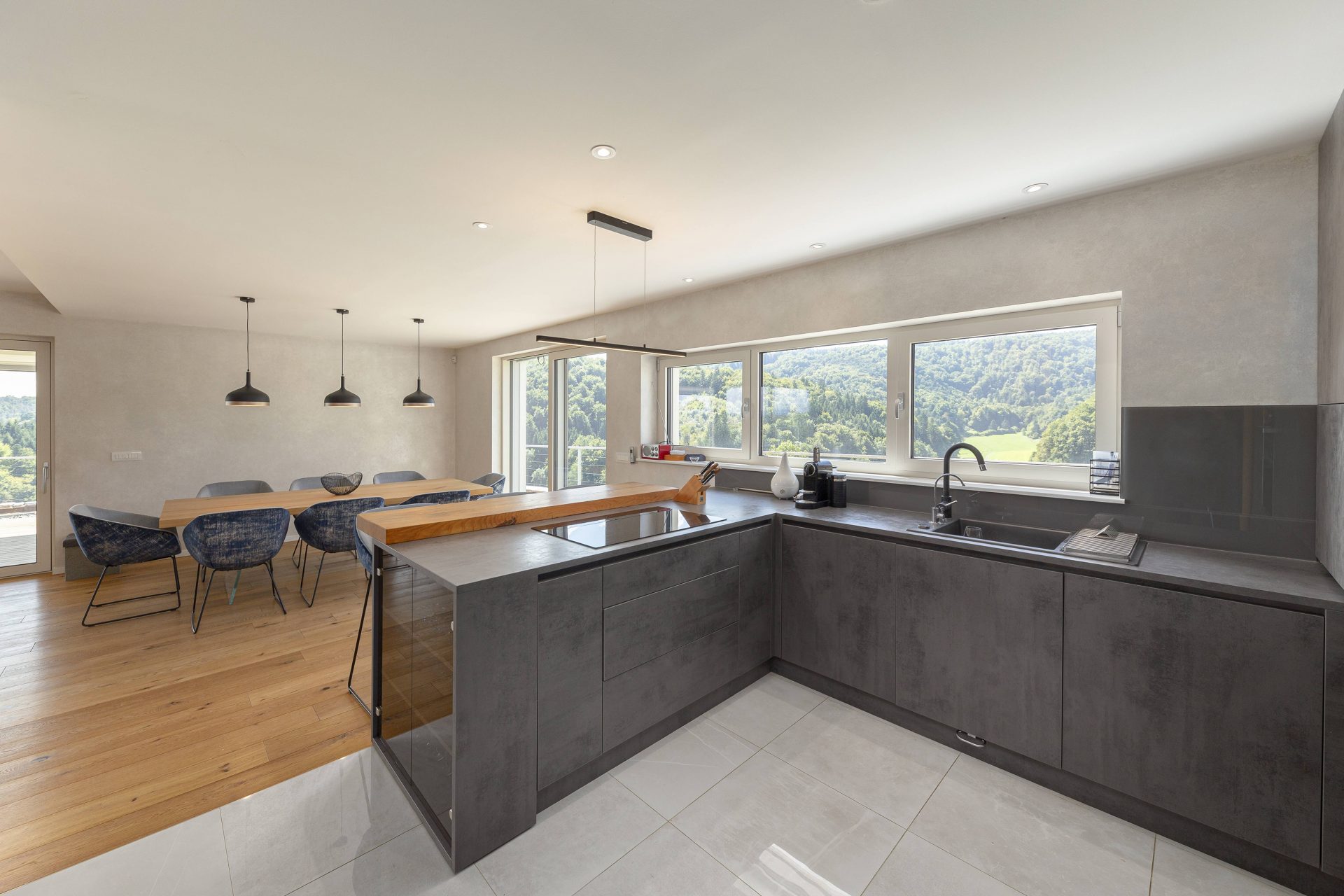 V pritličju se nahaja odprto načrtovana prostorna kuhinja z jedilnico in dnevnim prostorom. Kuhinja je popolnoma opremljena s kakovostnimi aparati, vključno s hladilnikom in zamrzovalnikom Liebherr, pečico in pomivalnim strojem Neff, velikim kuhinjskim otokom z barskimi stoli ter indukcijsko kuhalno ploščo. V prostorni jedilnici so čudovita lesena miza za osem oseb, udobna dnevna soba pa je opremljena s kavčem, televizorjem in prijetnim kaminom na drva. Velike panoramske steklene stene preplavijo prostor z naravno svetlobo in nudijo čudovit razgled na okoliške hribe. Iz dnevnega prostira je neposreden dostop na veliko teraso z vrtno garnituro, električnim nadstreškom in električnimi senčili, kar omogoča prijetno uporabo tudi v vročih poletnih mesecih.