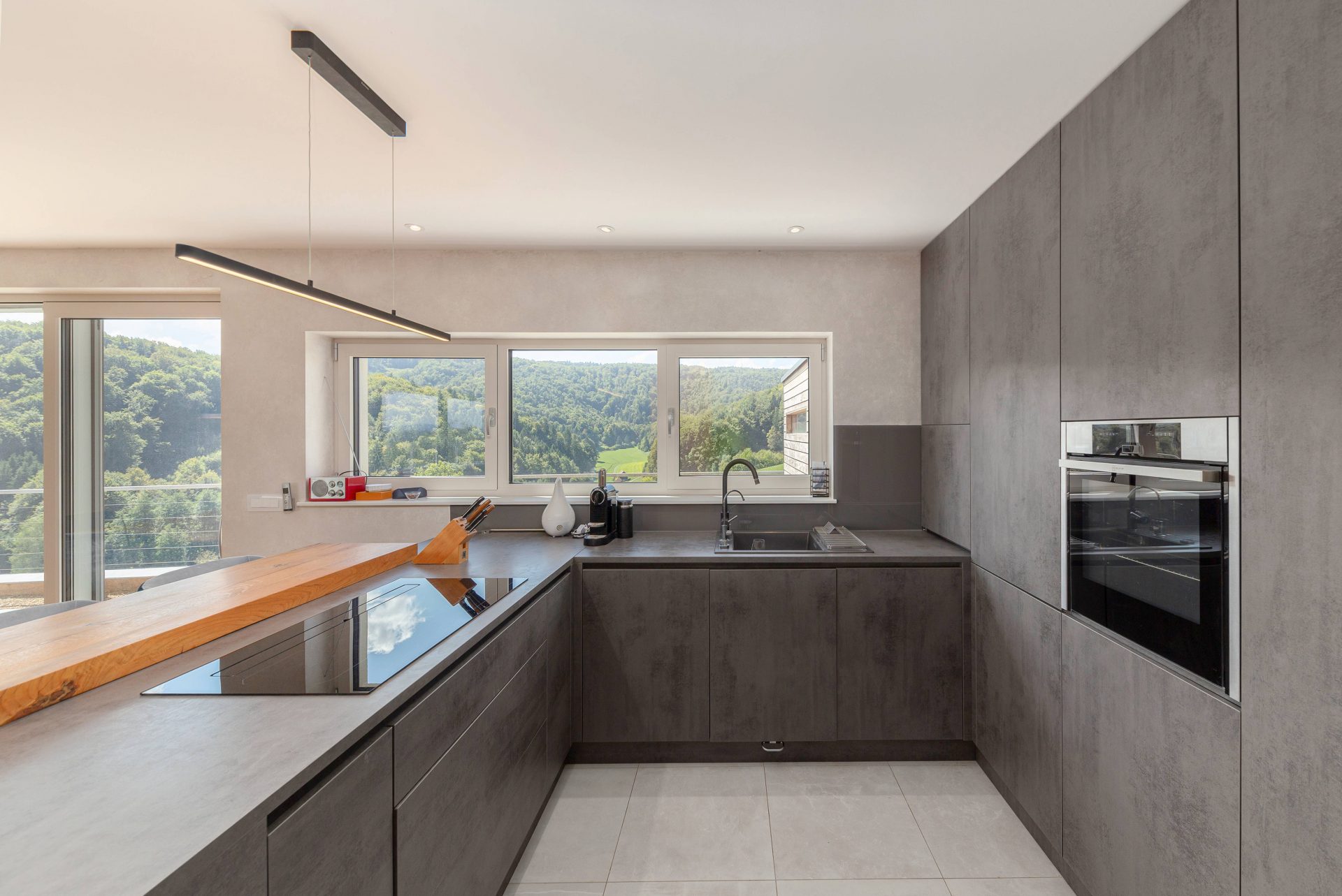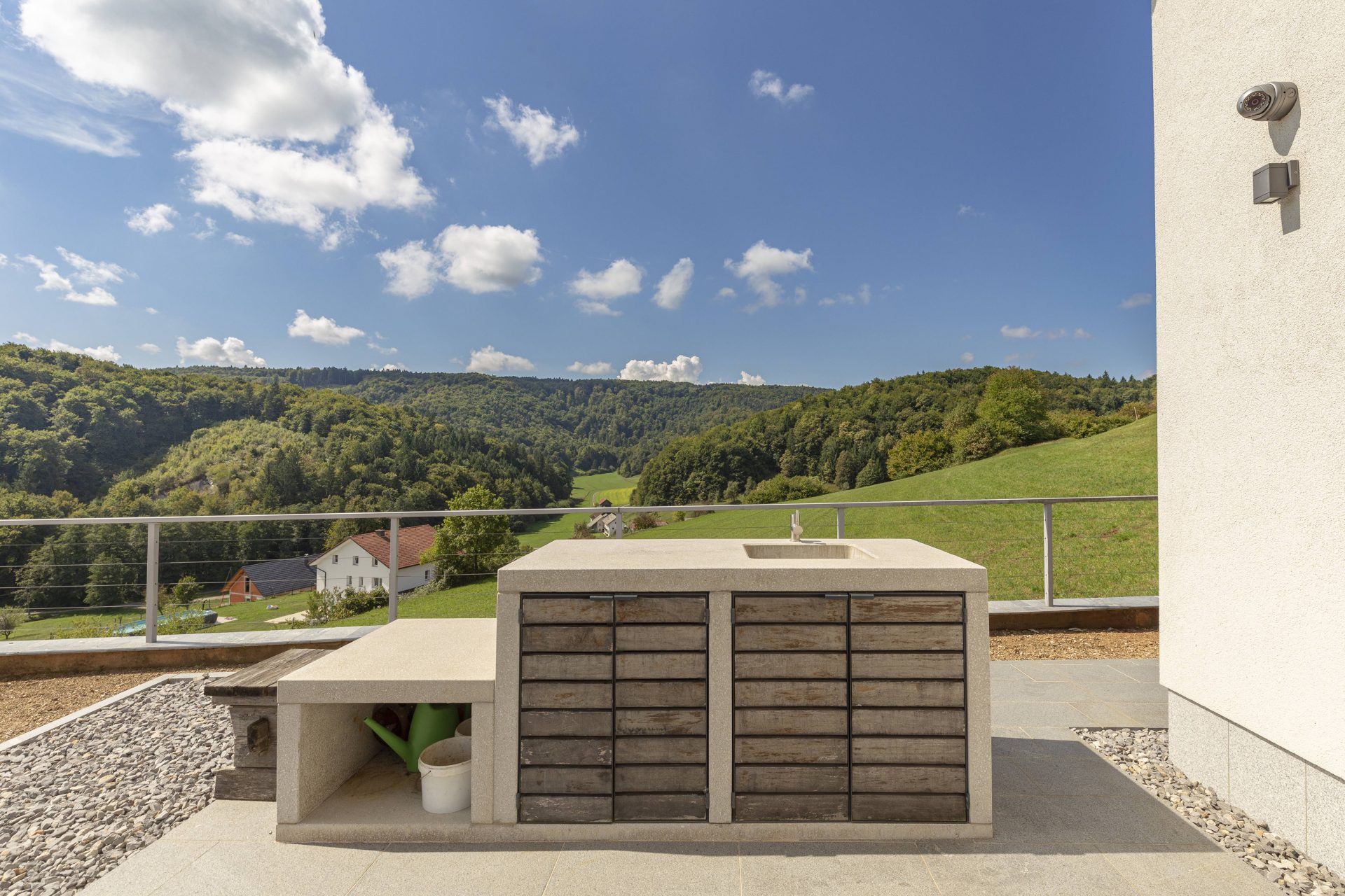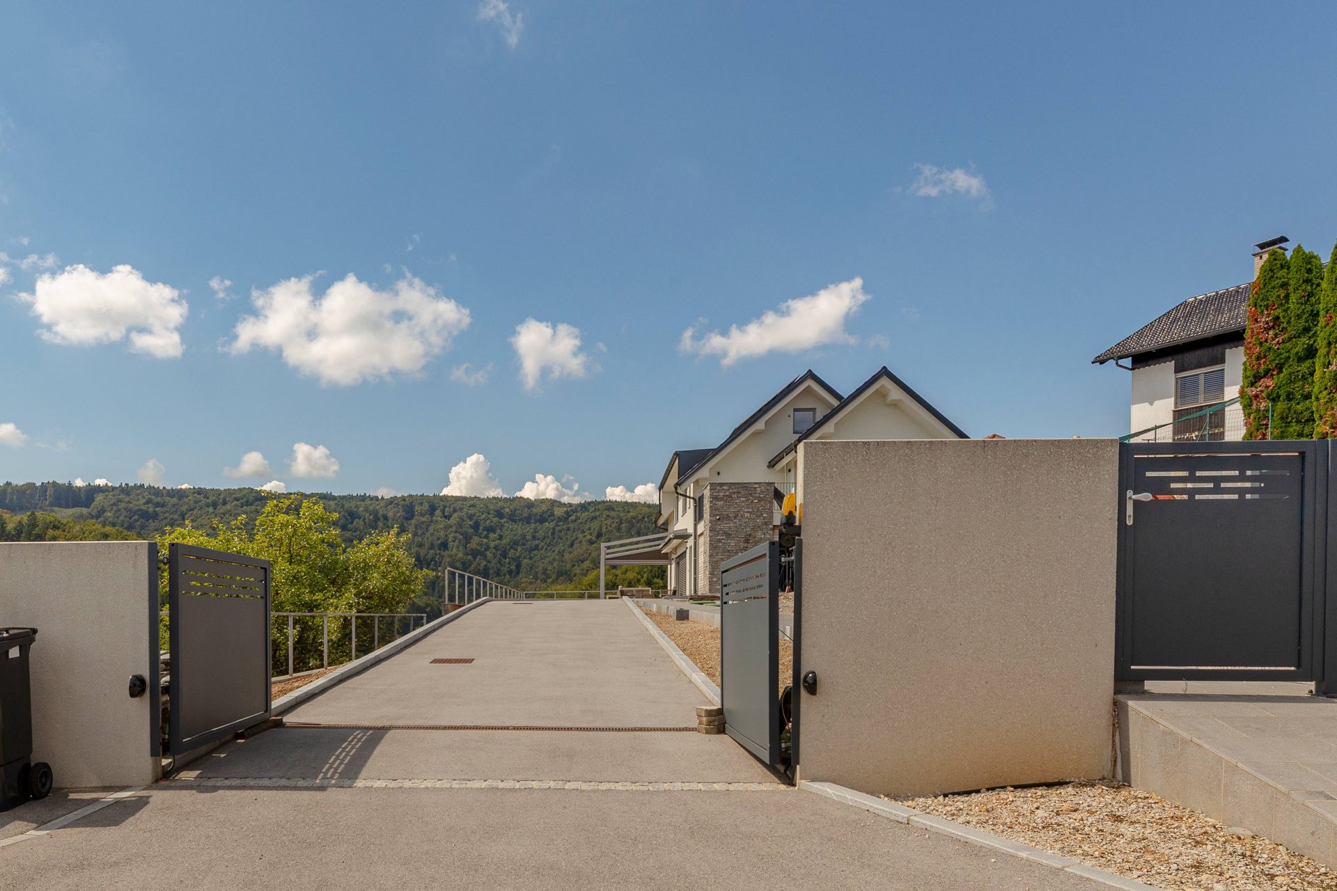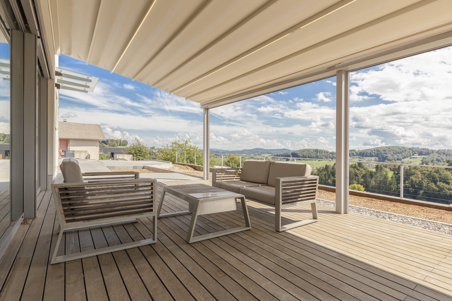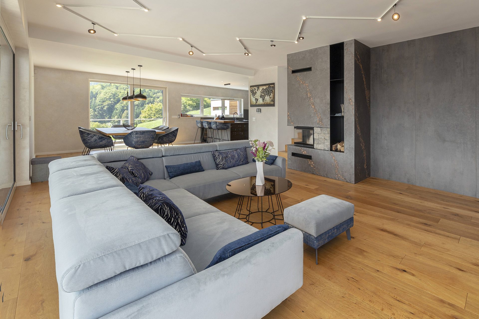 V pritličju se nahaja odprto načrtovana prostorna kuhinja z jedilnico in dnevnim prostorom. Kuhinja je popolnoma opremljena s kakovostnimi aparati, vključno s hladilnikom in zamrzovalnikom Liebherr, pečico in pomivalnim strojem Neff, velikim kuhinjskim otokom z barskimi stoli ter indukcijsko kuhalno ploščo. V prostorni jedilnici so čudovita lesena miza za osem oseb, udobna dnevna soba pa je opremljena s kavčem, televizorjem in prijetnim kaminom na drva. Velike panoramske steklene stene preplavijo prostor z naravno svetlobo in nudijo čudovit razgled na okoliške hribe. Iz dnevnega prostira je neposreden dostop na veliko teraso z vrtno garnituro, električnim nadstreškom in električnimi senčili, kar omogoča prijetno uporabo tudi v vročih poletnih mesecih.