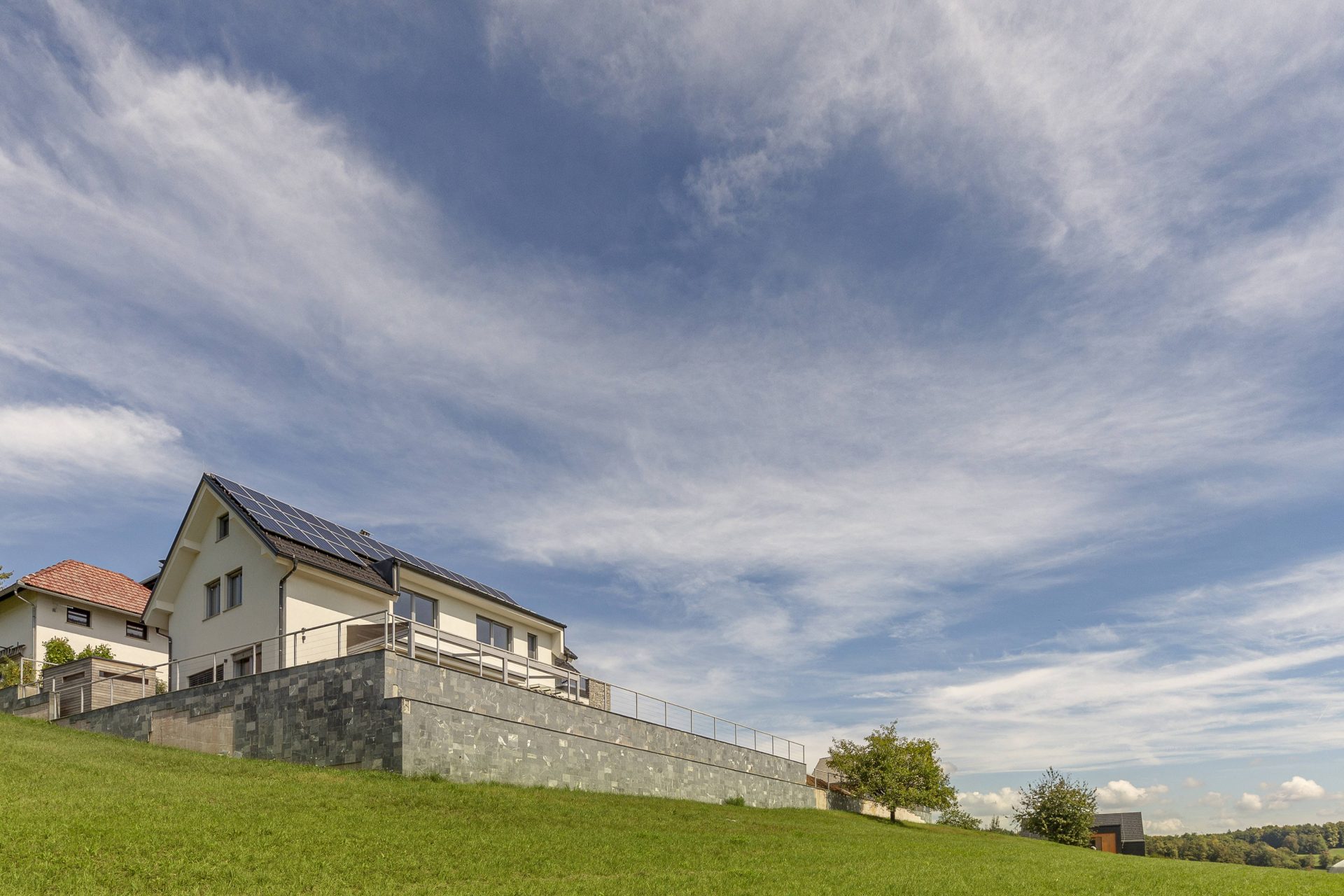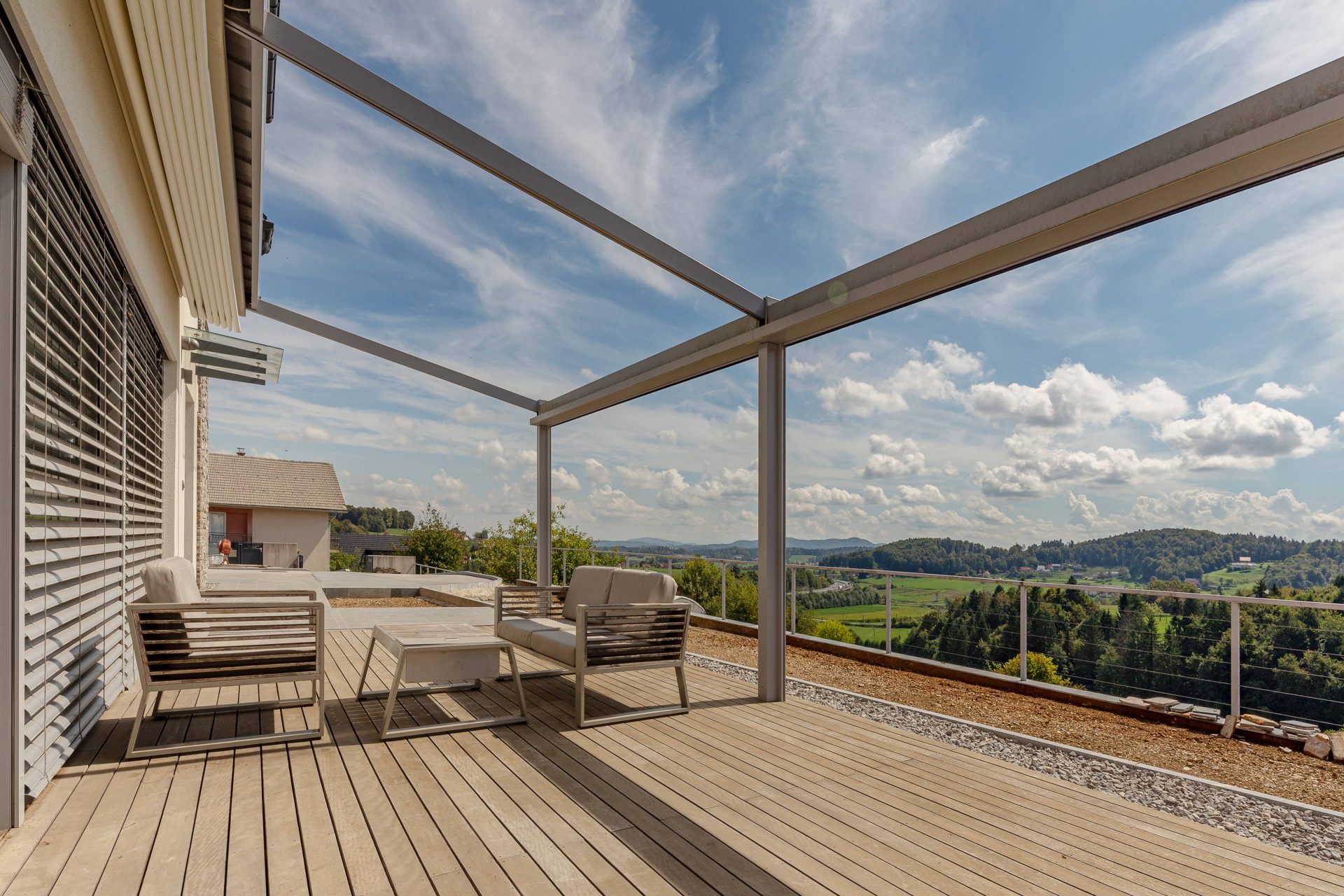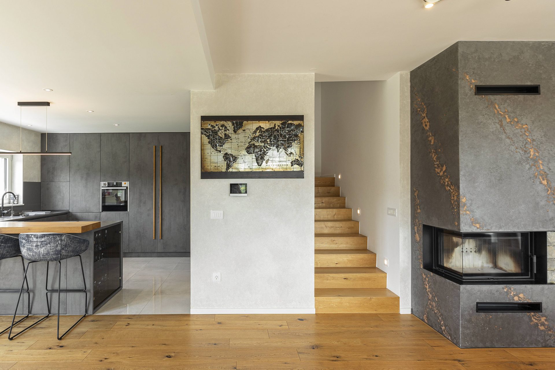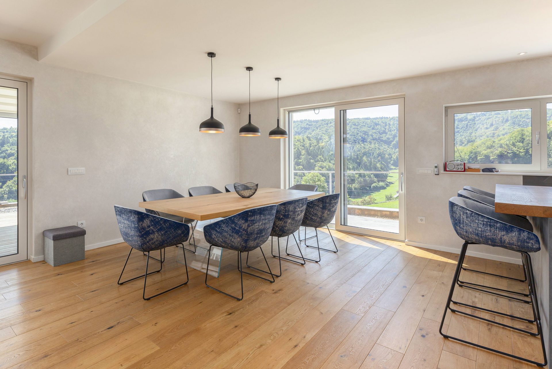 V pritličju se nahaja odprto načrtovana prostorna kuhinja z jedilnico in dnevnim prostorom. Kuhinja je popolnoma opremljena s kakovostnimi aparati, vključno s hladilnikom in zamrzovalnikom Liebherr, pečico in pomivalnim strojem Neff, velikim kuhinjskim otokom z barskimi stoli ter indukcijsko kuhalno ploščo. V prostorni jedilnici so čudovita lesena miza za osem oseb, udobna dnevna soba pa je opremljena s kavčem, televizorjem in prijetnim kaminom na drva. Velike panoramske steklene stene preplavijo prostor z naravno svetlobo in nudijo čudovit razgled na okoliške hribe. Iz dnevnega prostira je neposreden dostop na veliko teraso z vrtno garnituro, električnim nadstreškom in električnimi senčili, kar omogoča prijetno uporabo tudi v vročih poletnih mesecih.