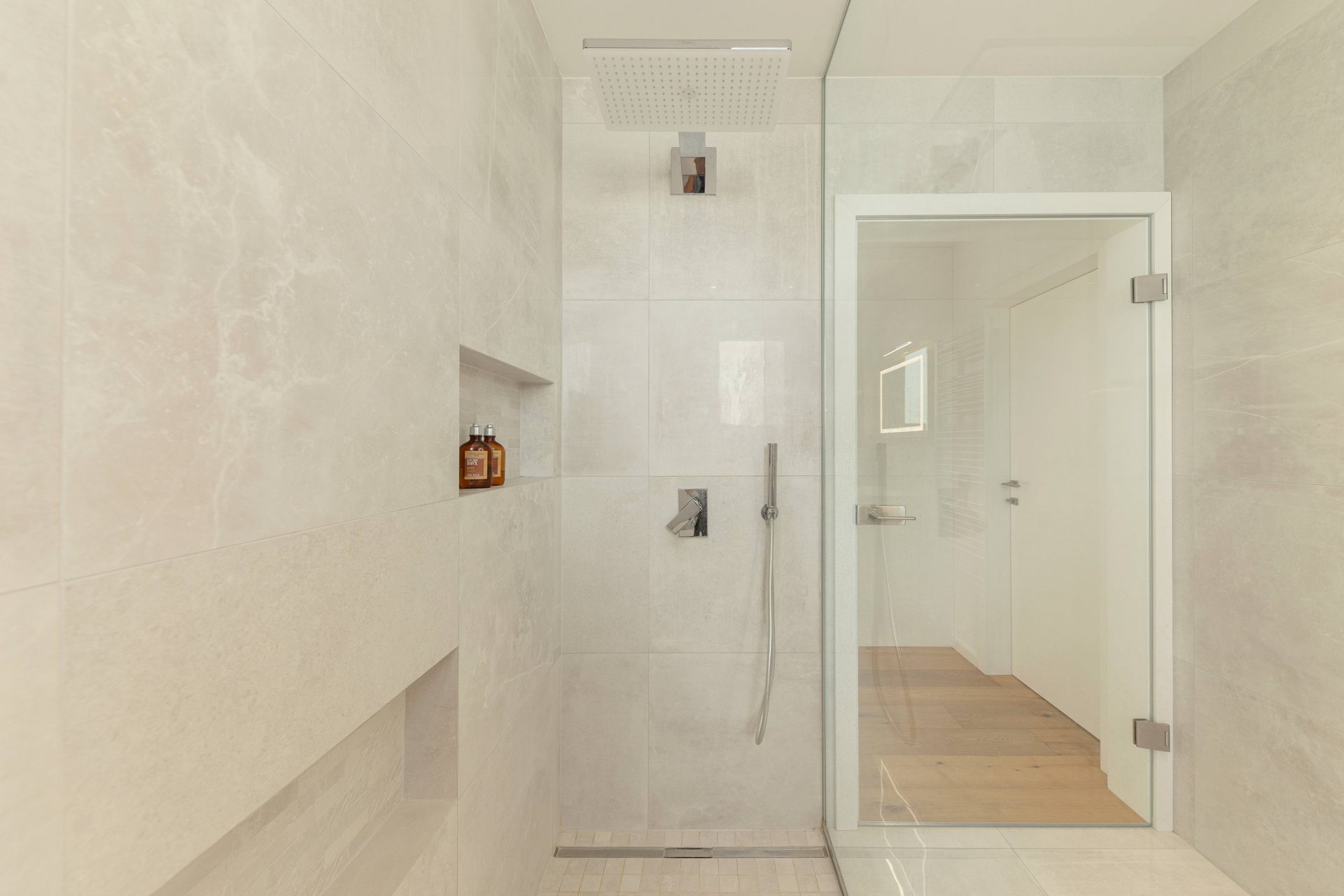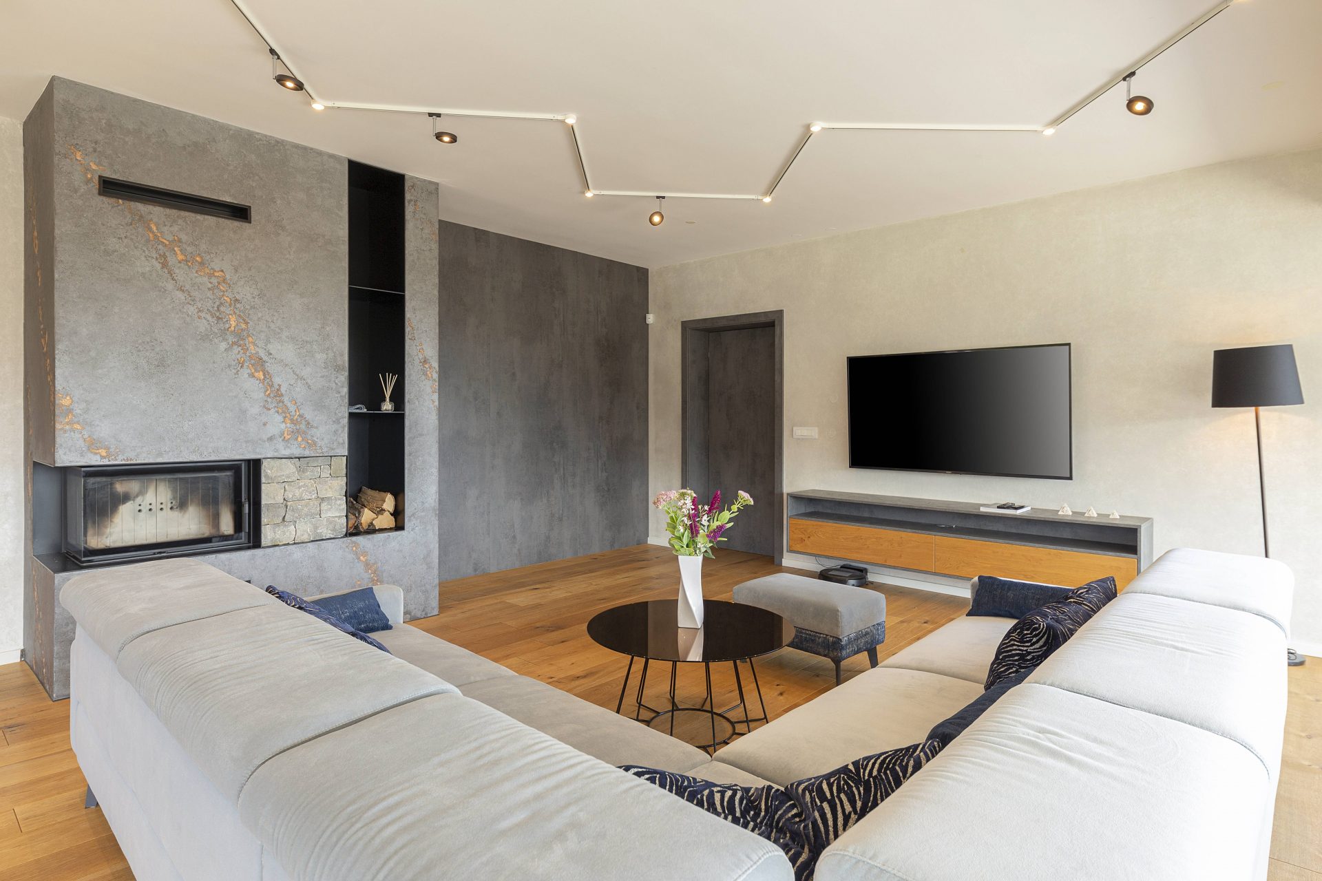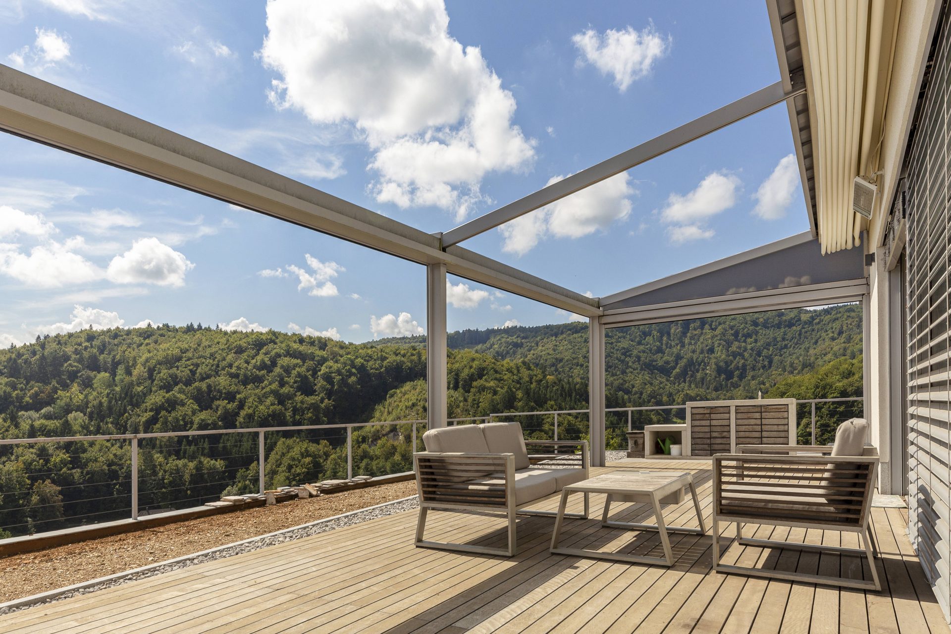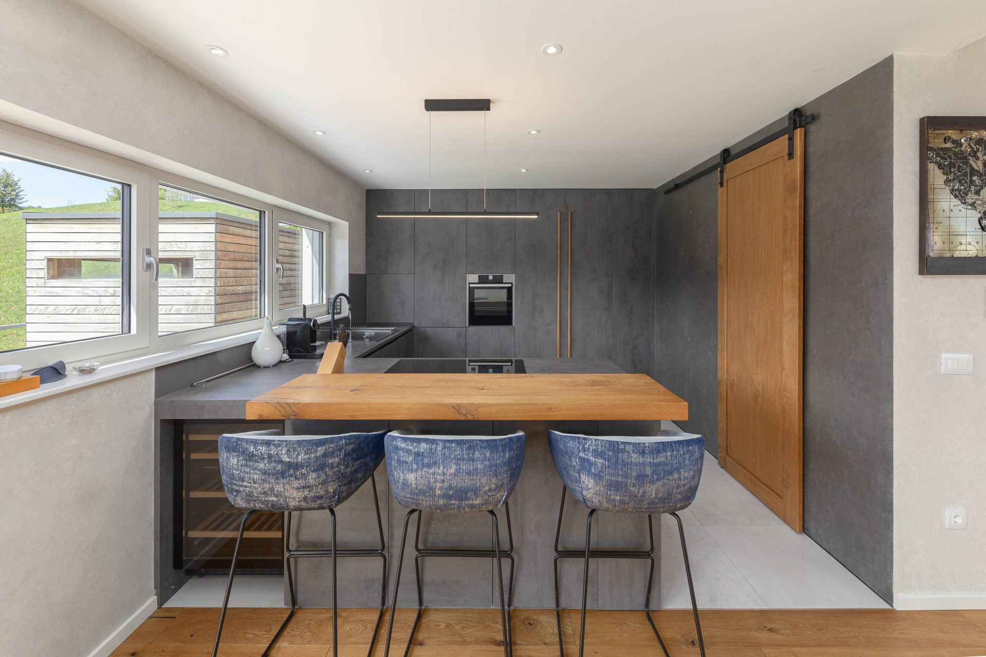V pritličju se nahaja odprto načrtovana prostorna kuhinja z jedilnico in dnevnim prostorom. Kuhinja je popolnoma opremljena s kakovostnimi aparati, vključno s hladilnikom in zamrzovalnikom Liebherr, pečico in pomivalnim strojem Neff, velikim kuhinjskim otokom z barskimi stoli ter indukcijsko kuhalno ploščo. V prostorni jedilnici so čudovita lesena miza za osem oseb, udobna dnevna soba pa je opremljena s kavčem, televizorjem in prijetnim kaminom na drva. Velike panoramske steklene stene preplavijo prostor z naravno svetlobo in nudijo čudovit razgled na okoliške hribe. Iz dnevnega prostira je neposreden dostop na veliko teraso z vrtno garnituro, električnim nadstreškom in električnimi senčili, kar omogoča prijetno uporabo tudi v vročih poletnih mesecih.
